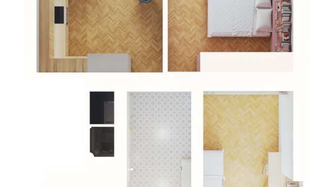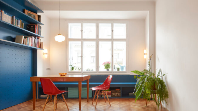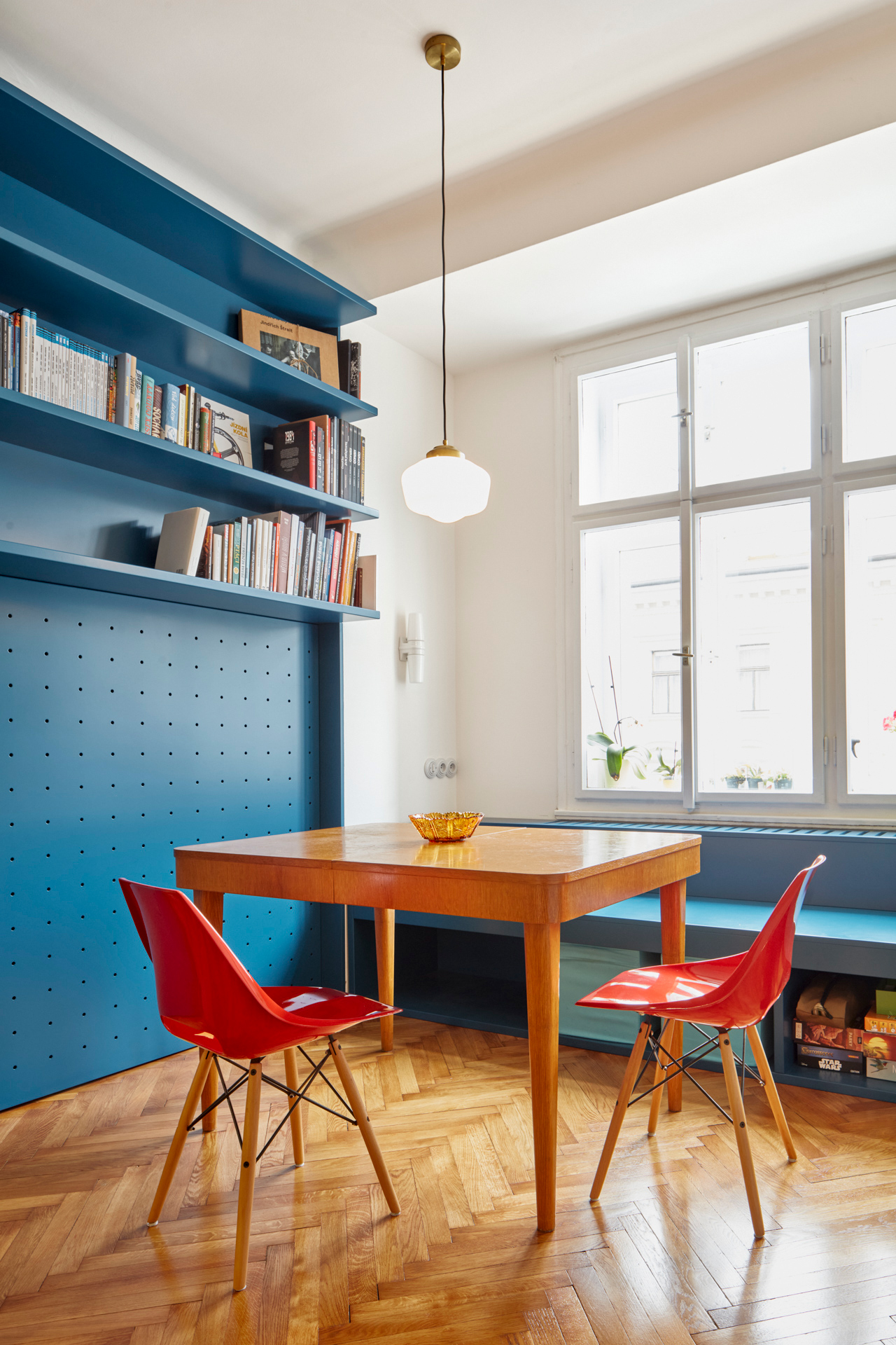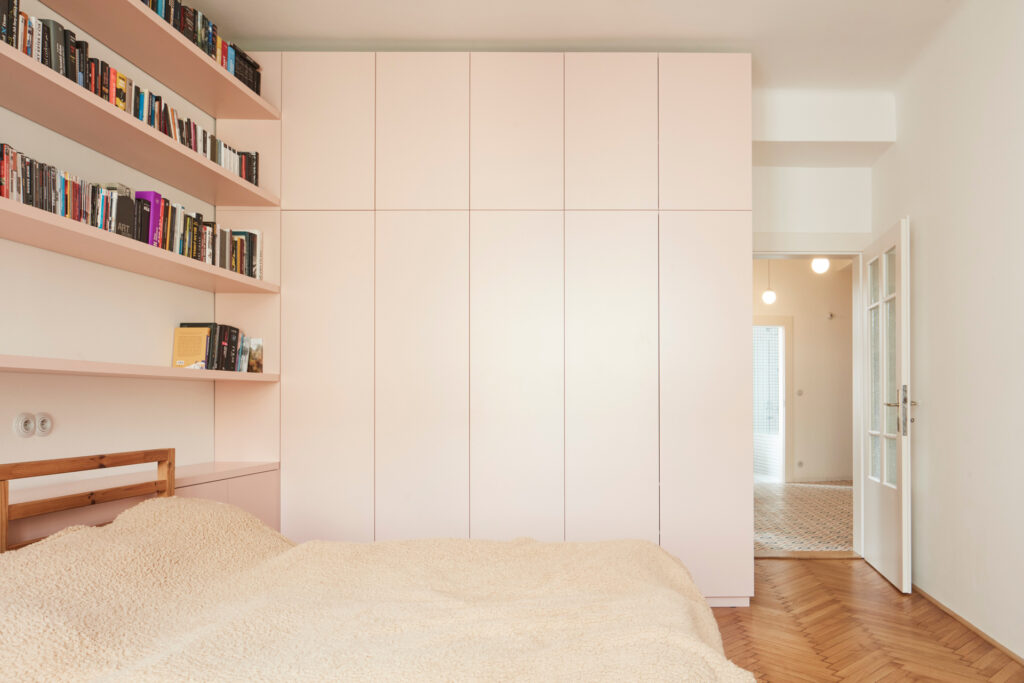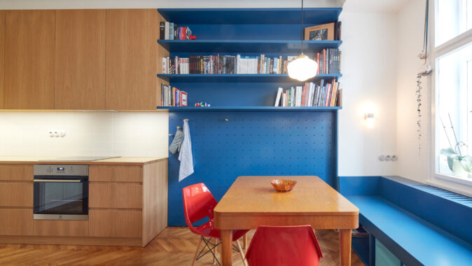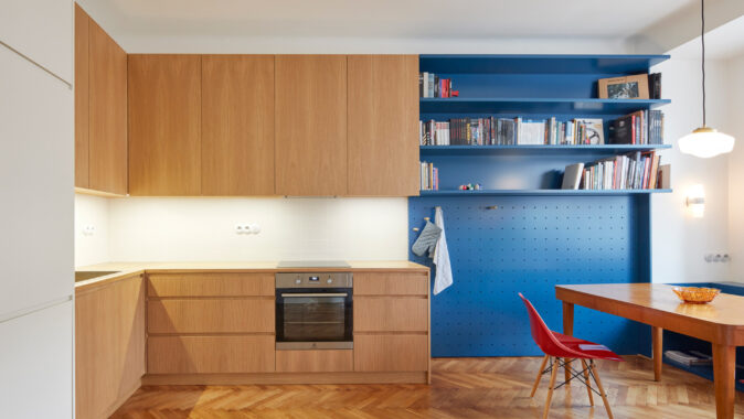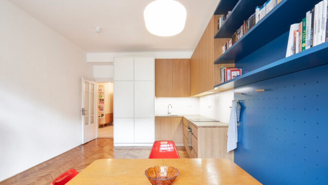 Materiálovým a barevným pojítkem celého bytu jsou klasické dubové parkety pokládané do „stromku“, cementová dlažba a barevnost vestavných prvků, která přímo navazuje na dlažbu. Tento barevný motiv – kombinace tmavě modré a světle růžové – se promítá do celého interiéru, od ložnice přes obývací pokoj až po kuchyň, a funguje jako jemné, vizuálně propojující pojítko.