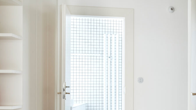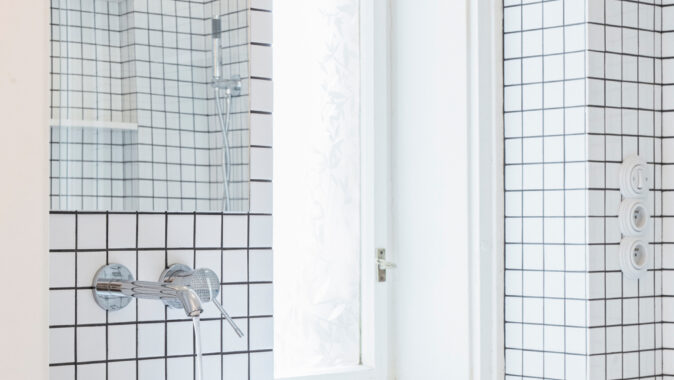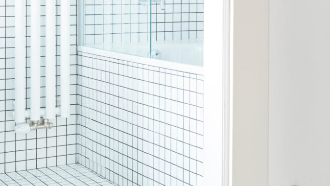Koupelna byla díky původní dispozici potřeba upravit jen minimálně. Posunem příčky vznikl komfortní prostor s vanou a vestavnou skříňkou pod umyvadlem. Mozaikový obklad dodává lehkost a vizuálně prostor zvětšuje, přičemž denní světlo z původního okna přispívá k jeho svěžímu vzhledu.