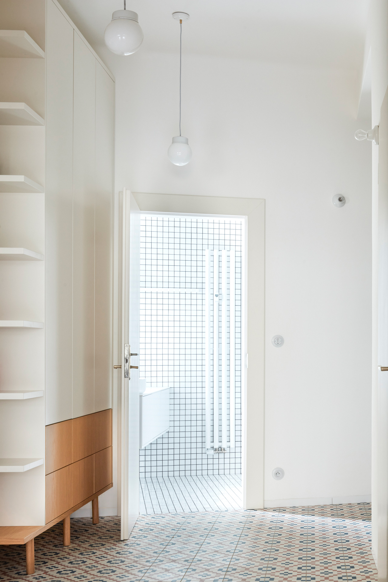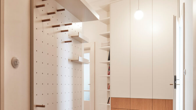 Vstupní chodba ve tvaru L kombinuje praktický úložný systém s estetikou. Botník a systémová stěna s otvory pro police a háčky jsou prvkem, který se v různých formách opakuje v celém bytě, a spolu s kombinovanou skříní umožňuje uspořádat prostor přehledně a pohodlně. Z chodby se vstupuje do koupelny, původního skladu, budoucího dětského pokoje a do hlavních místností – ložnice a obývacího pokoje s kuchyní a jídelnou. Cementová dlažba, vyrobená na míru, navozuje historizující atmosféru a zároveň přináší barevnou kontinuitu, která pojí celý byt dohromady.