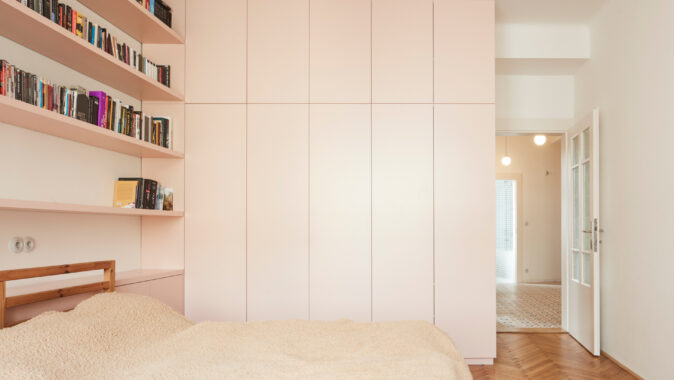 Ložnice je orientovaná do ulice a využívá denní světlo. Vestavný nábytek je světlý, jemná světle růžová odkazuje na barvy dlažby v hale, čímž vzniká jemné propojení celého bytu. Ložnice je vybavena vestavnou skříní a praktickým pracovním koutem, což zajišťuje harmonický a přehledný interiér.