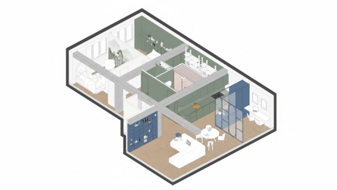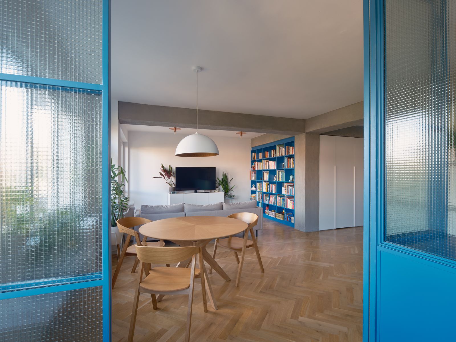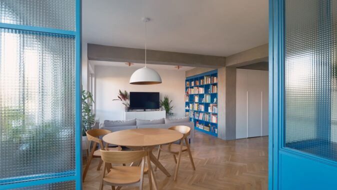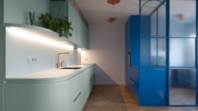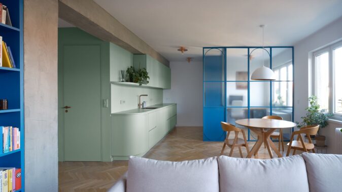 Barevné akcenty – zelené jádro a modré vestavěné prvky pracovny a knihovny – zónují interiér a dodávají mu svěží charakter. Transparentní příčky zároveň vytvářejí pracovní kout, zatímco bílé vestavné skříně poskytují dostatek úložného prostoru a ukrývají i druhou šatnu.