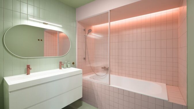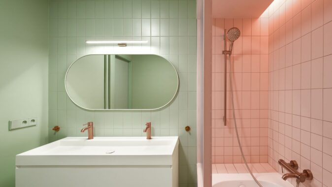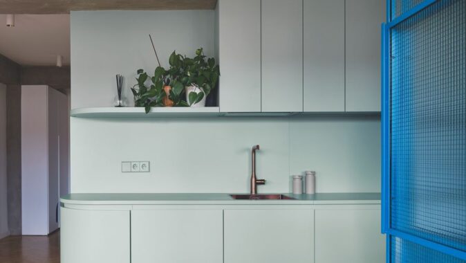 Materiálové řešení odkazuje k charakteru domu: beton doplňují cementové stěrky, dubové podlahy a výrazné barevné plochy. Barevné schéma interiéru stojí na trojici odstínů – zelené, modré a růžové – které se navzájem doplňují a v kombinaci s měděnými detaily vytvářejí harmonický celek. Ty se objevují na armaturách, klikách i zakázkových svítidlech.
