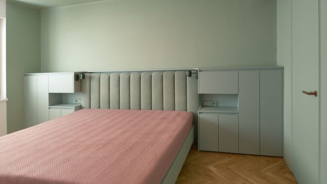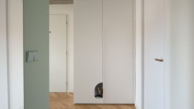 Do středu bytu byla vložena zelená vestavba se šatnou a hygienickým zázemím, která určuje rytmus života v bytě. Kolem ní se odvíjí hlavní obytný prostor orientovaný k náměstí s výhledem na město, zatímco ložnice a dětský pokoj zůstávají v klidném vnitrobloku.