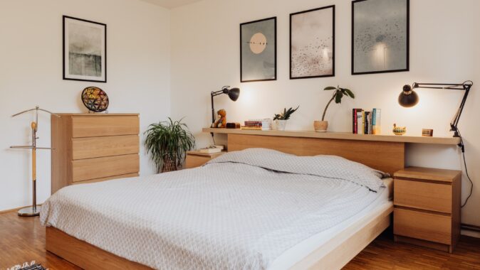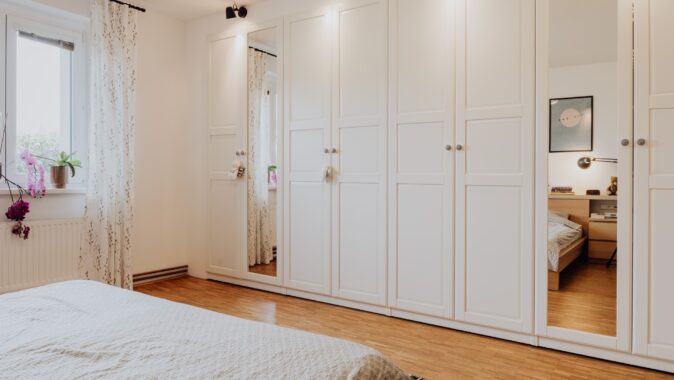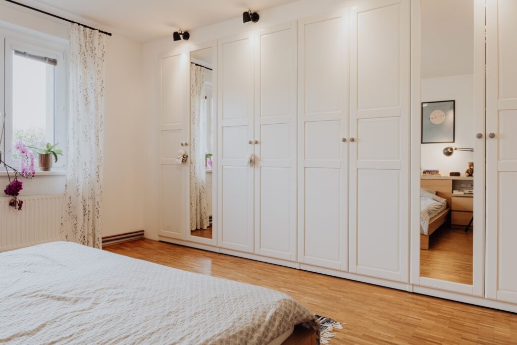 Proto jsem se rozhodla splnit si přání jinak a vytvořit si kuchyni podle sebe – tak, aby připomínala staré časy u babičky a zároveň splňovala požadavky na moderní kuchyni. Z několika kredencí jsem vypreparovala části, které se mi líbily, a těmi nahradila klasické kuchyňské skříňky. Ostrůvek je z pohledové části kredenc, ale z druhé strany má praktické hluboké zásuvky. Pod rukama mi prošly kredence z různých časových období a čím „mladší“ byly, tím více bylo vidět, jak kvalita výroby ustupuje kvantitě. Byla to spousta času strávená broušením, řezáním a natíráním. Největší místnost jsme využili jako prostornou ložnici s velkou šatní skříní.