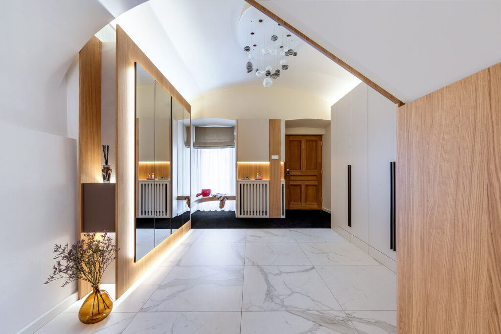 Díky poctivé řemeslné práci a souladu mezi mladou rodinou a architektem vznikl během rekonstrukce atypický a příjemný domov, do kterého se propsala i záliba majitelů v letectví. Při vstupu do bytu nás nejdříve přivítají oblé klenby dodávající příchozímu pocit otevřenosti prostoru. Nachází se zde na míru vyrobená šatní skříň, která se odráží v protilehlé podsvícené zrcadlové stěně. „Při pohledu na strop návštěvník spatří první dekorační prvek odkazující na zálibu v létání majitele bytu – atypická, ručně foukaná, skleněná plastika připomínající mraky, mnou navržená a vyrobená českými skláři,“ uvádí architekt Petr Holada. Tento umělecký kousek osvětlují bodová svítidla zabudovaná v nosné konstrukci připevněné ke stropu, která vše drží pohromadě. Sestava se opakuje i u schodiště vedoucího do dalších pater. „Další připomínkou aviatické tematiky je pak dřevěná vrtule vznášející se v podkroví nad schodištěm. To bylo jedním ze zadání od majitelů také, tuto vrtuli totiž vlastnili a chtěli ji v novém domově použít – právě jako důležitou symboliku jejich obliby letectví,“ říká architekt.