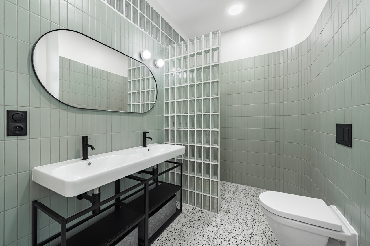 V koupelně s teracovou podlahou dominuje obklad v zelené barvě, která se harmonicky prolíná s celkovým interiérem. Luxfery, tvořící sprchovou zástěnu jsou integrovány i do příčky vedoucí do kuchyně, přispívají k přirozenému dennímu osvětlení a podtrhávají kreativní koncept celého prostoru. Moderní nábytek doplňuje vestavěná knihovna a umělecká díla od ilustrátora Michala Bačáka.