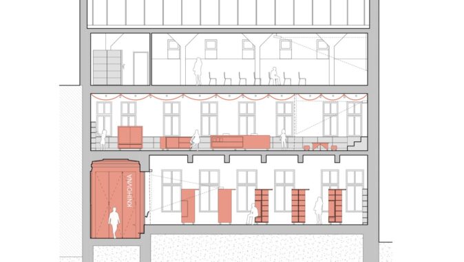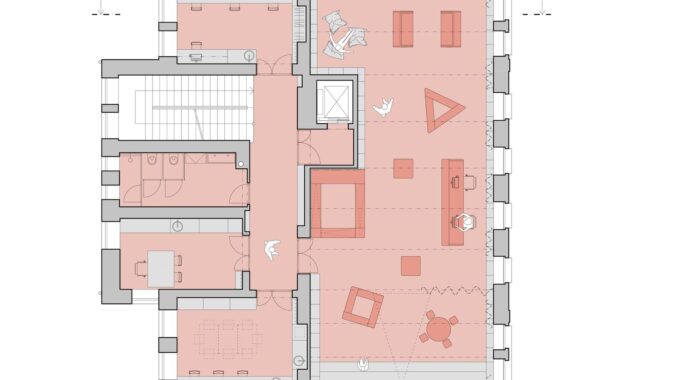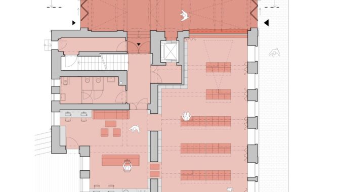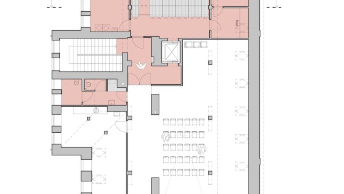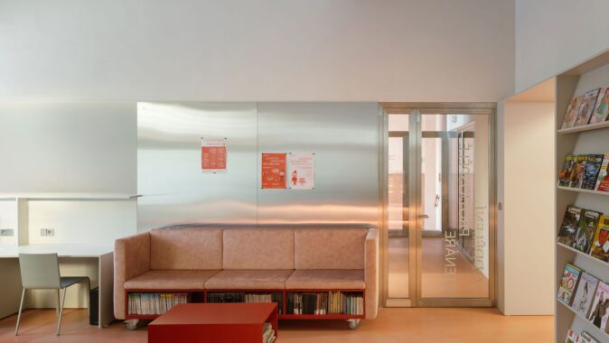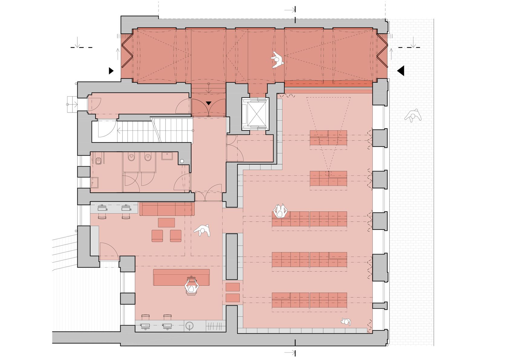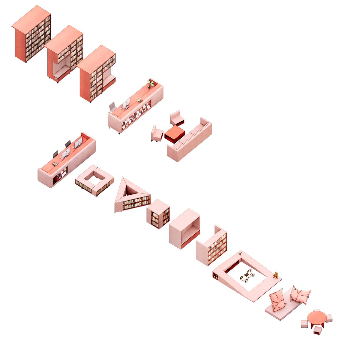Součástí návrhu je také komplexní řešení nábytku. Podél stěn je umístěn vestavěný mobiliář v neutrální šedé barvě, zatímco střed místností patří výraznému červenému nábytku. Ten je mobilní a multifunkční – nabízí úložné prostory, místa k sezení i integrované osvětlení. Díky kolečkům jej lze snadno přesouvat a prostor tak přizpůsobit veřejným akcím.