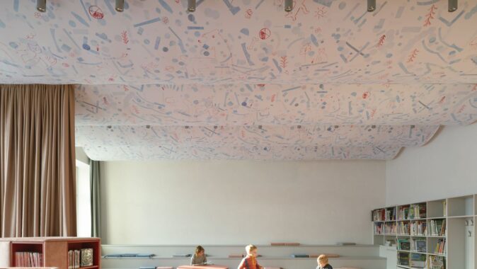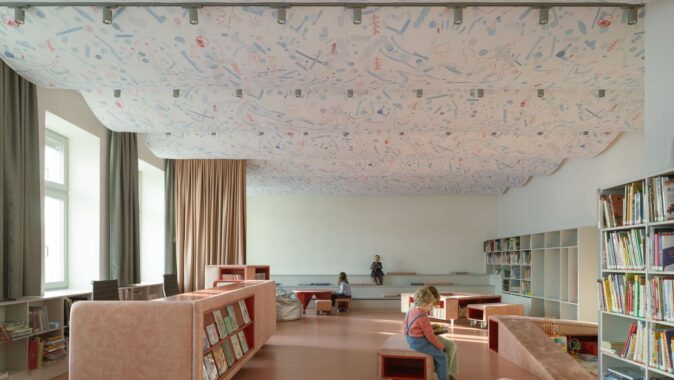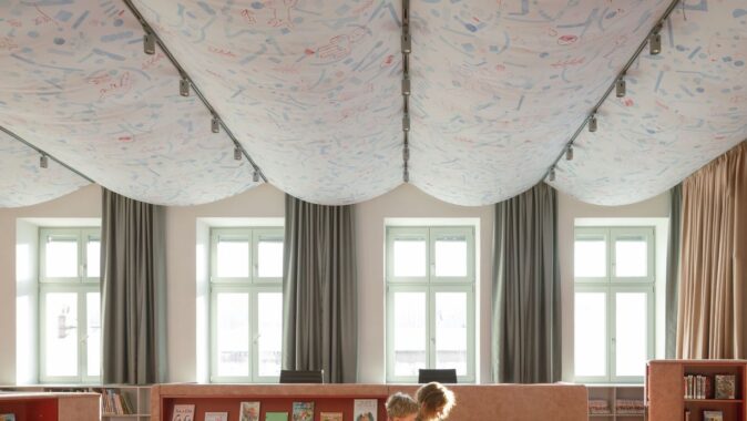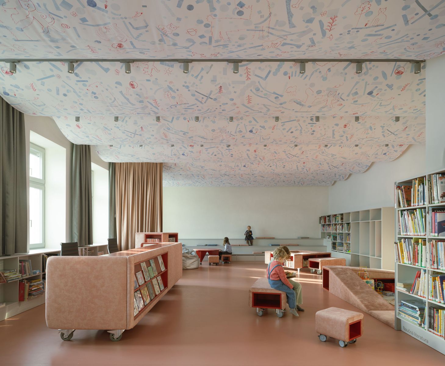 V přízemí je nábytek uspořádán do pravidelných řad pro oddělení dospělých. Dětské oddělení v patře pracuje s hravější kompozicí regálů a různými výškami nábytku odpovídajícími věkovým skupinám. Strop doplňuje textilní baldachýn od výtvarnice Lindy Retterové, vytvořený během workshopu s místními dětmi. Prvek zlepšuje akustiku a zároveň změkčuje světlo v prostoru.