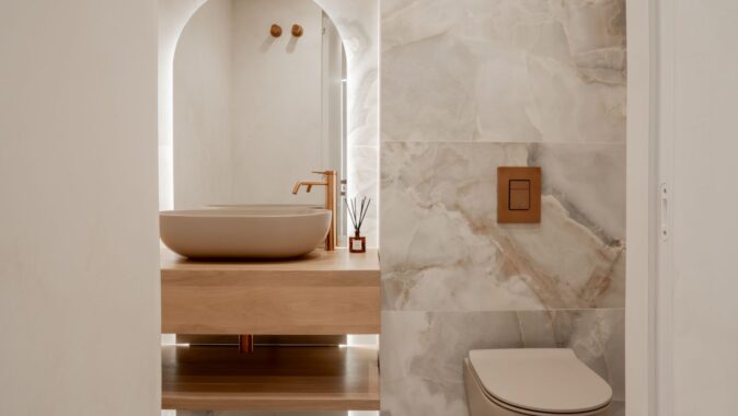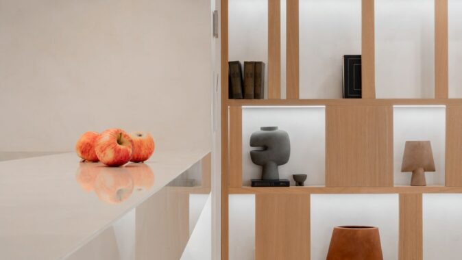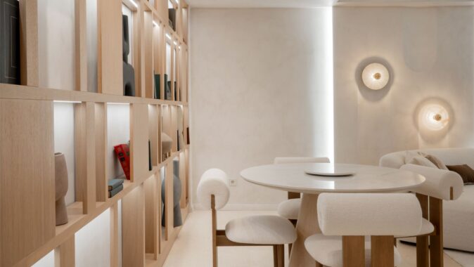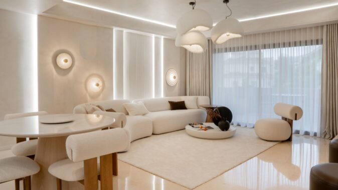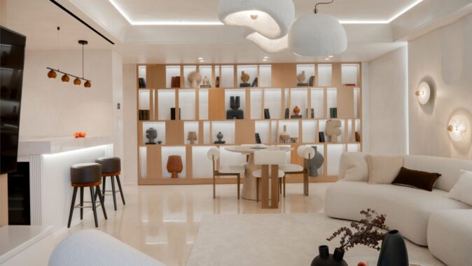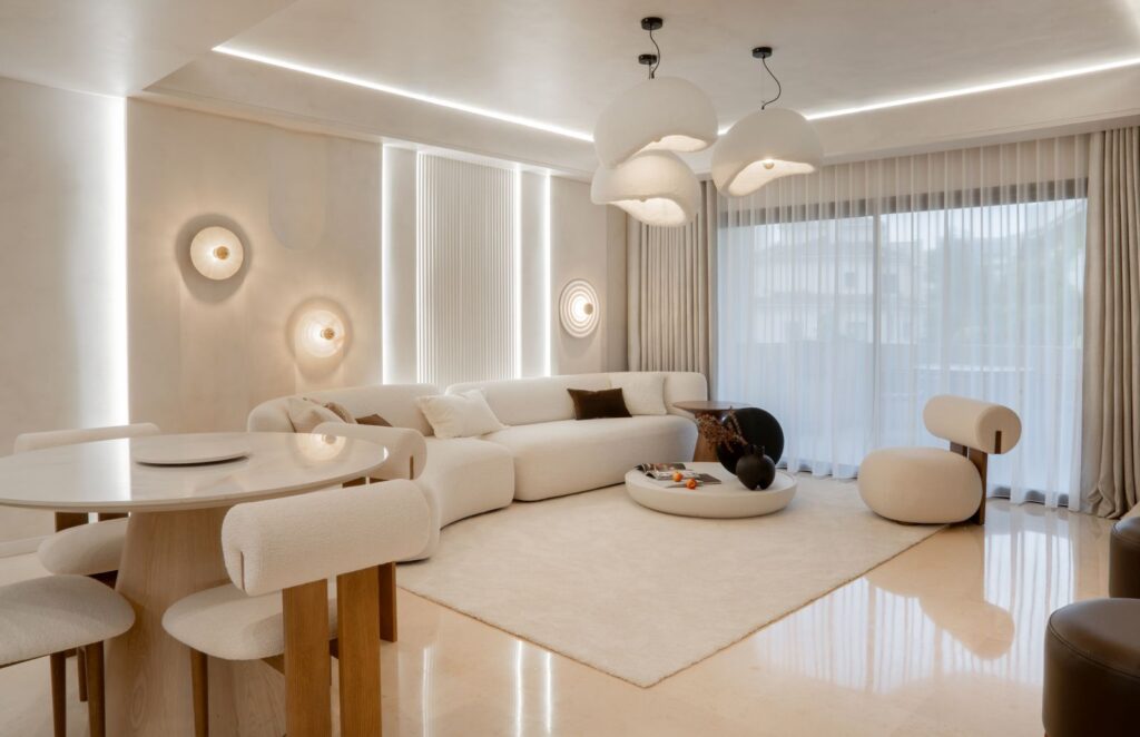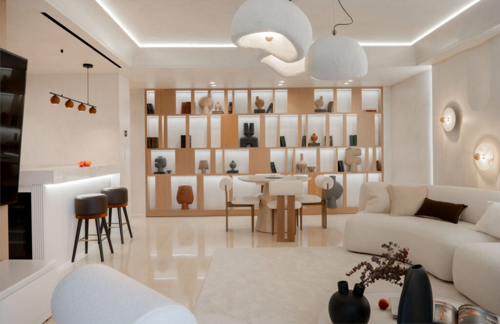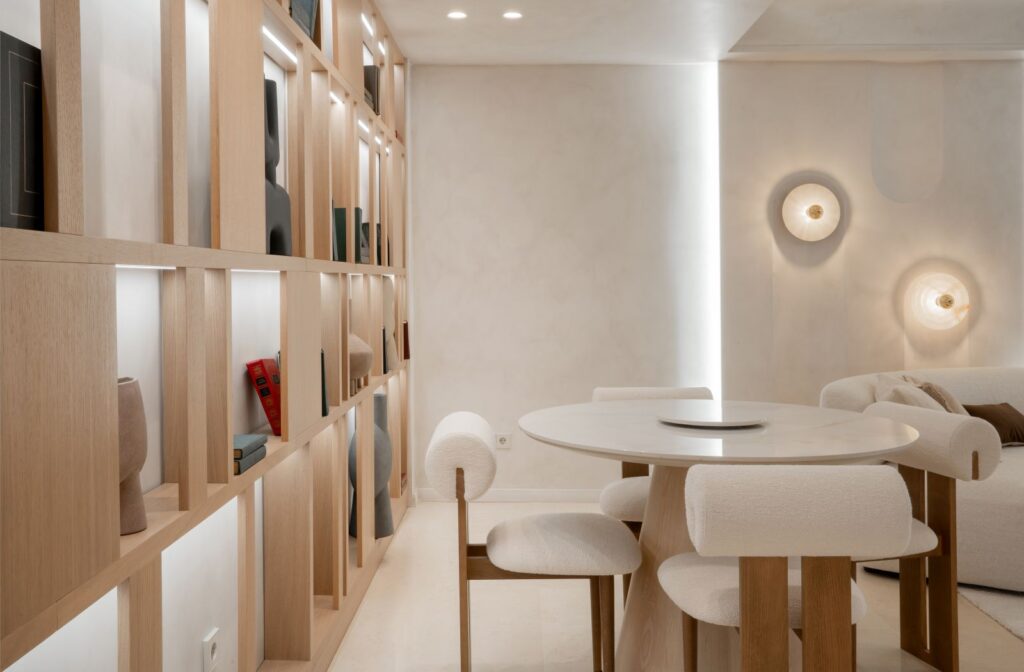 Hlavní obytná místnost je ztělesněním charakteristické rovnováhy stylu Japandi, který kombinuje klid japonského minimalismu s vřelostí skandinávského design. Nejvýraznějším prvkem prostoru je vestavěná otevřená policová skříň s podsvícením. V její blízkosti je kulatý jídelní stůl vyrobený na míru. Dominantou obývacího prostoru je pohovka s jemně zaoblenými křivkami.