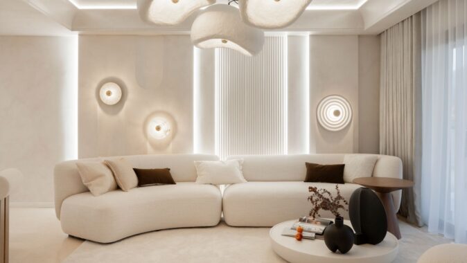 Výslednou atmosféru architekti dotvořili důmyslnou hrou se světlem. Kromě obrysového LED osvětlení vyvýšené čtvercové stropní části se o centrální nasvícení místnosti postarají tři závěsná svítidla odrážející japonskou filozofii wabi-sabi, zastávající, že krása tkví v nedokonalosti. Ambientní osvětlení prostoru je pak ve stěně za pohovkou vytvořeno svislými LED pásky a originálními nástěnnými svítidly.