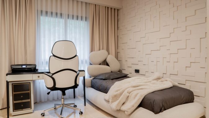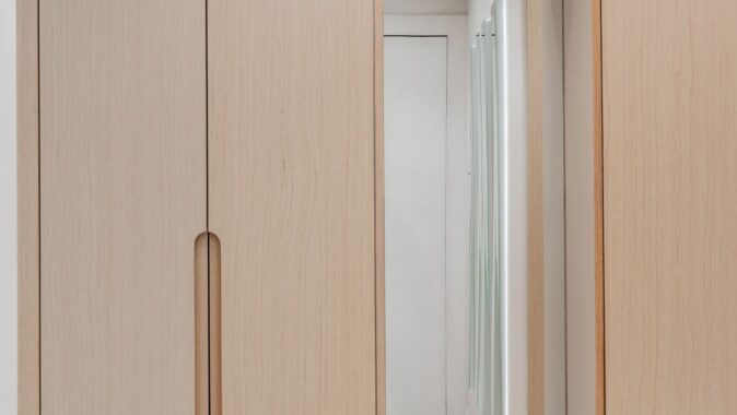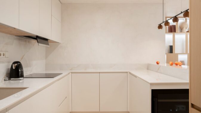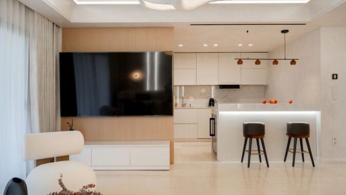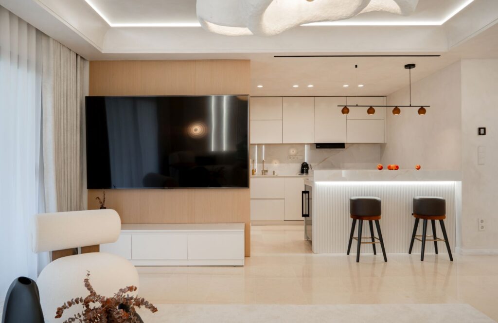 Protilehlý prostor náleží televizní obrazovce, zavěšené na stěně s obkladem ze světlého dřeva, a kuchyni respektující barevnou paletu stylu Japandi. Součástí bytu jsou i dvě ložnice s šatnou a koupelnami.