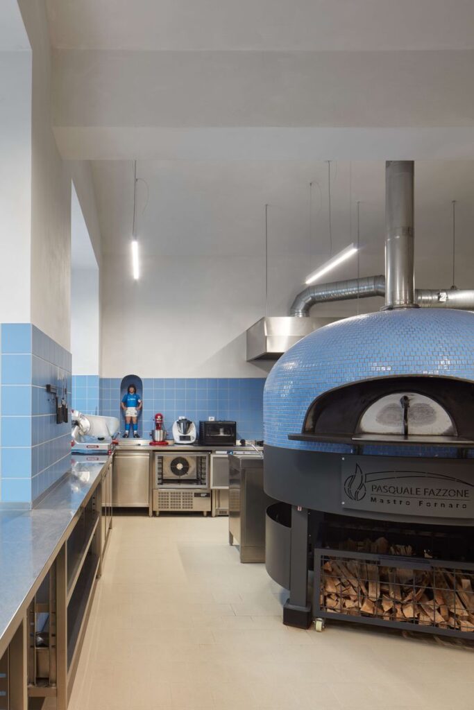 Kuchyni, která se otevírá do restaurace i do ulice, vévodí pec na pizzu a za ní drobná nika, v níž bydlí zmiňovaná Maradonova socha. Niku jsme objevili při první návštěvě a ihned nám bylo jasné, že pro tento otvor bude Diego vyřezán. Péče byla věnována formulaci velkorysého vstupního prostoru a za růžovým pultem se otevírá rozsáhlá šatna na kabáty. Dlouhý podélný průhled do hlavní místnosti uzavírá luxferová vinotéka. Členitou dispozici využíváme pro práci s různými typy sezení: kromě degustačního stolu také vysoké sezení, lavici a drobnější stoly v duchu italských bister.