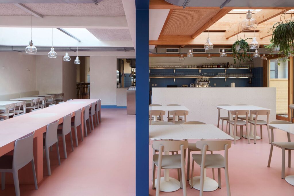 Interiéru proto dominuje růžová podlaha, z níž vystupují dva zásadní bloky: uvítací pult u vstupu a gargantuovský degustační stůl pro 18 bytostí. Podlahu lemuje jedna řada modrého keramického obkladu, který se v patřičných místech (šatna, bar) zvedá do potřebné výšky. Materiály a barevnost zbylých prvků jsou spíše decentní, aby podtrhly výraznou barevnost a čistotu celého interiéru. Za zmínku stojí hrubá akustická omítka uzavírající prostor na stropě a umělý kámen, z něhož jsou vyrobeny desky stolů a kuchyňské i barové pulty.