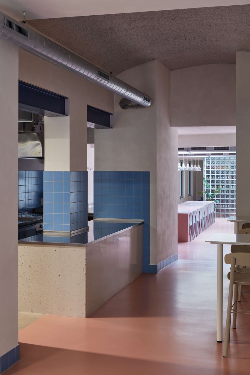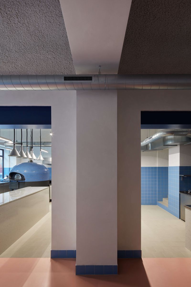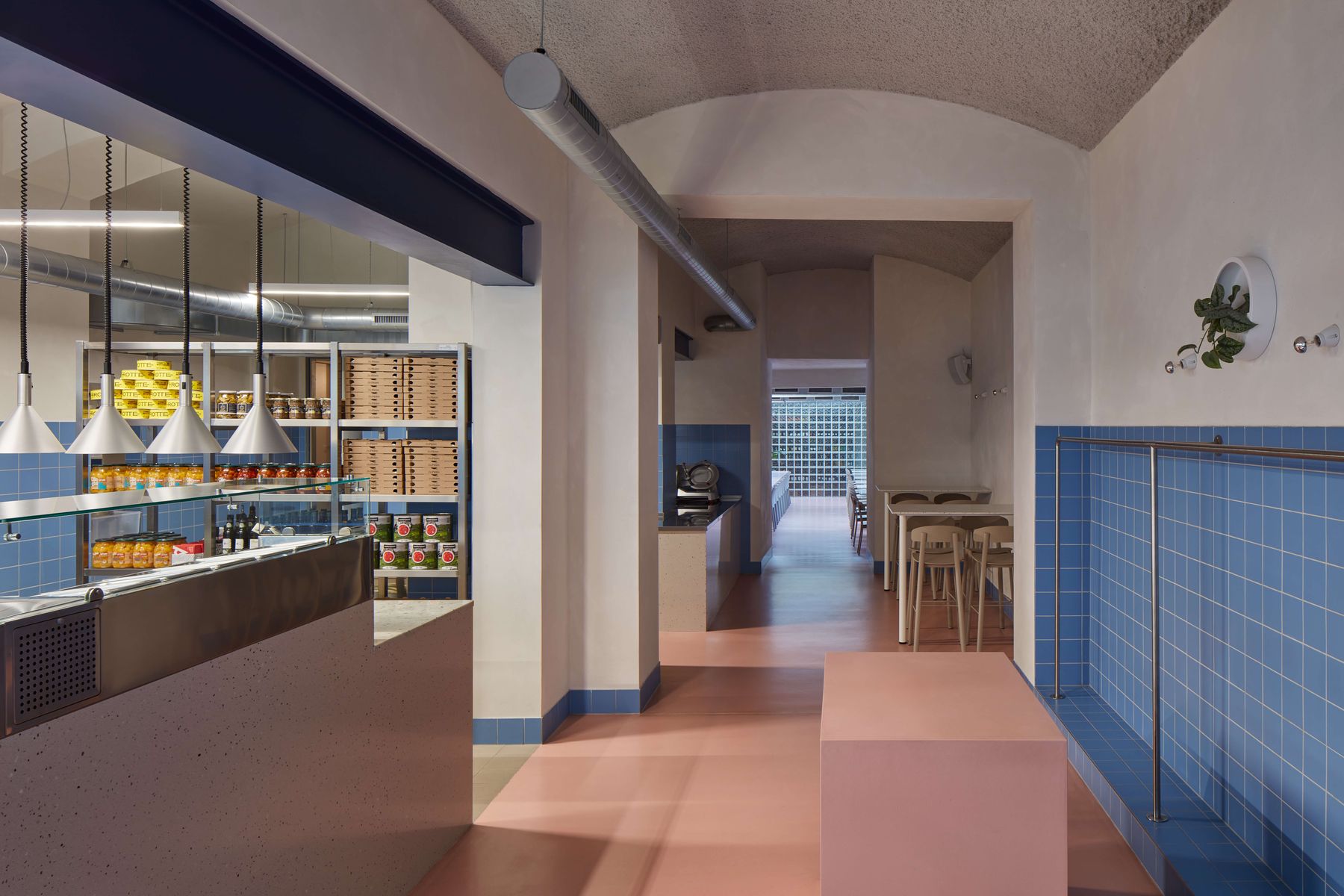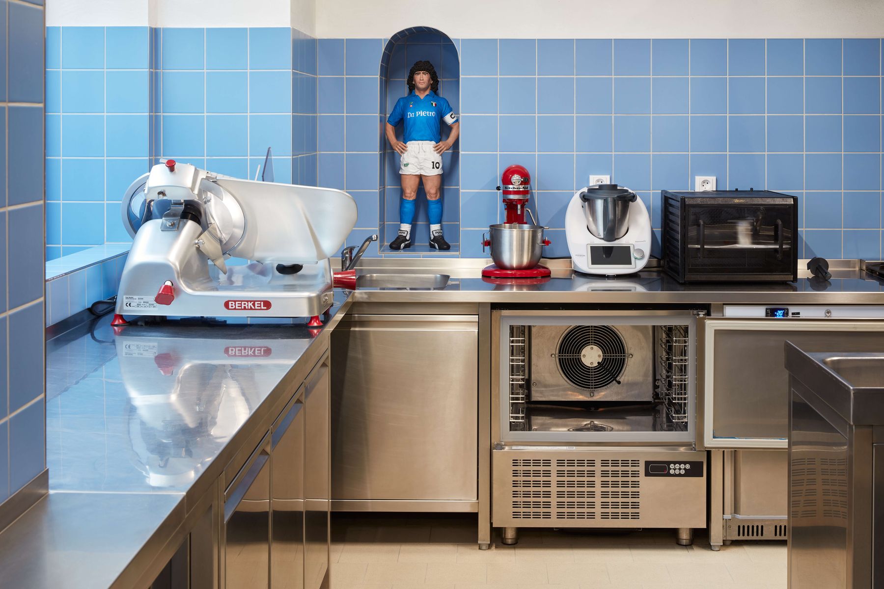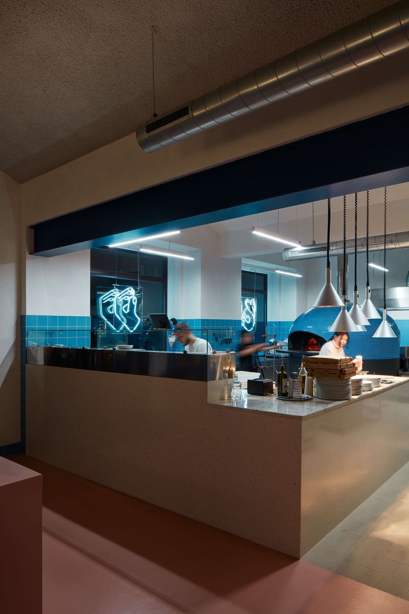 Kuchyni, která se otevírá do restaurace i do ulice, vévodí pec na pizzu a za ní drobná nika, v níž bydlí zmiňovaná Maradonova socha. Niku jsme objevili při první návštěvě a ihned nám bylo jasné, že pro tento otvor bude Diego vyřezán. Péče byla věnována formulaci velkorysého vstupního prostoru a za růžovým pultem se otevírá rozsáhlá šatna na kabáty. Dlouhý podélný průhled do hlavní místnosti uzavírá luxferová vinotéka. Členitou dispozici využíváme pro práci s různými typy sezení: kromě degustačního stolu také vysoké sezení, lavici a drobnější stoly v duchu italských bister.