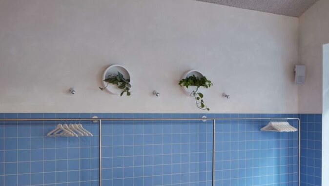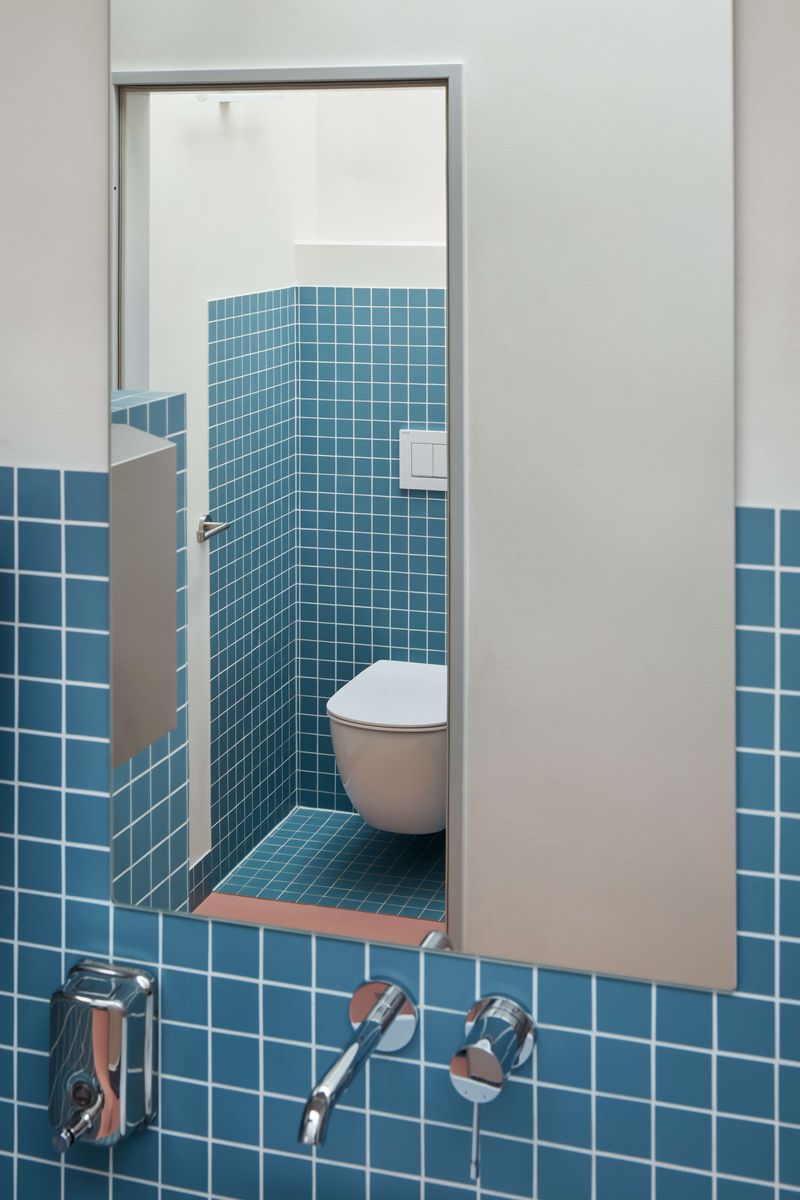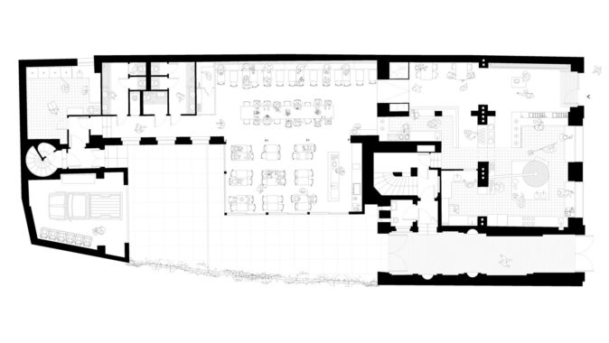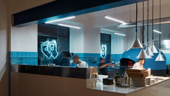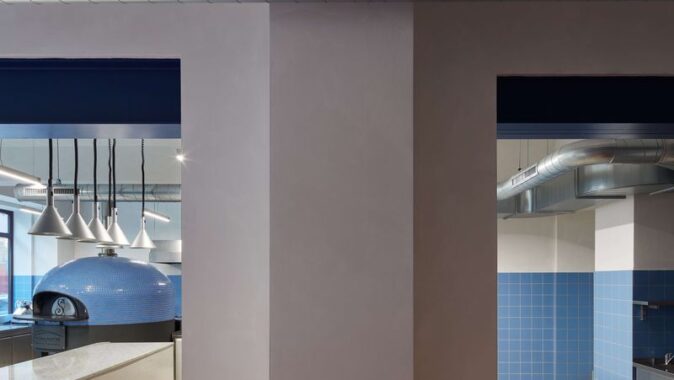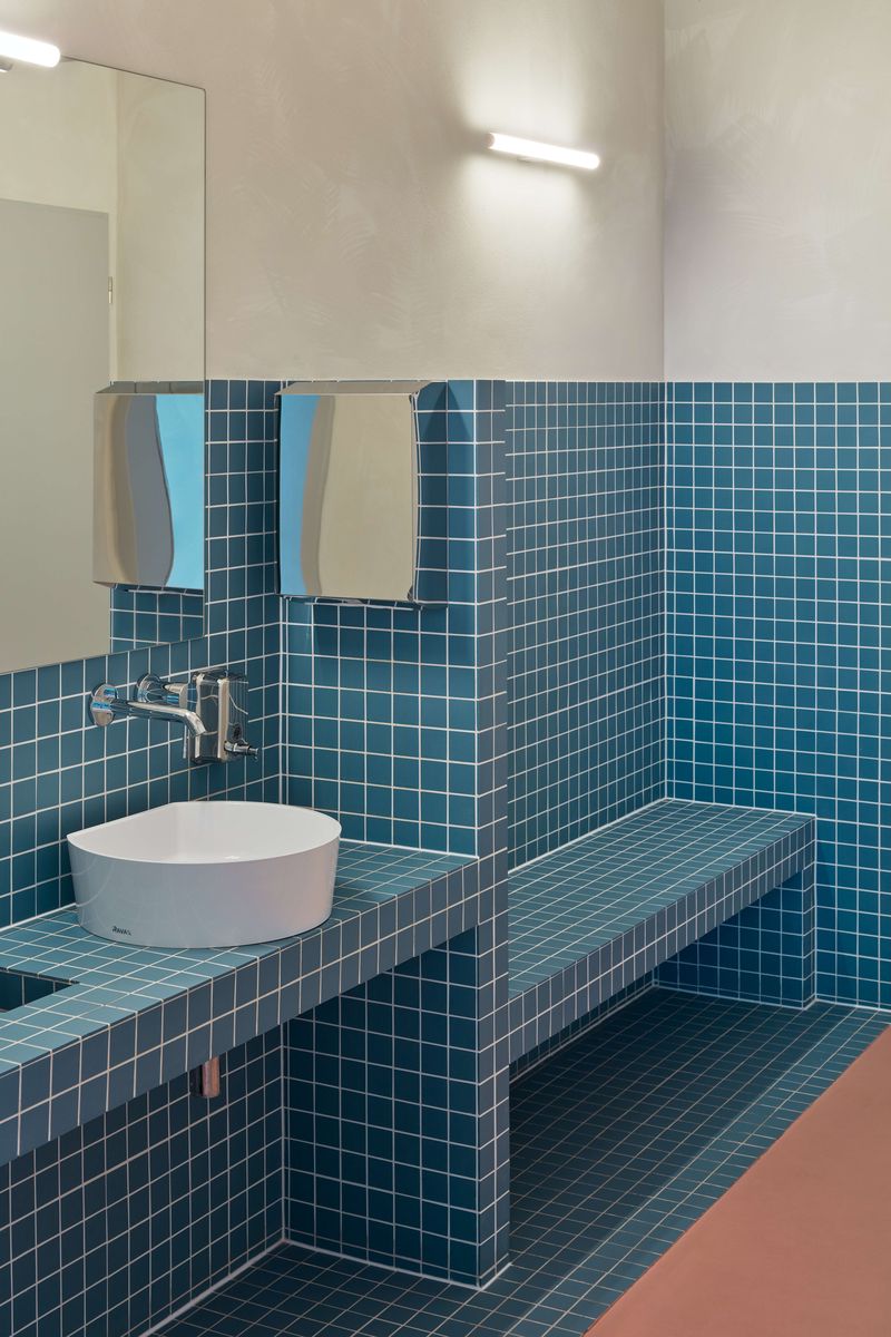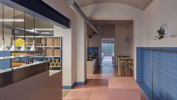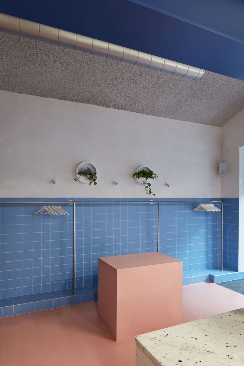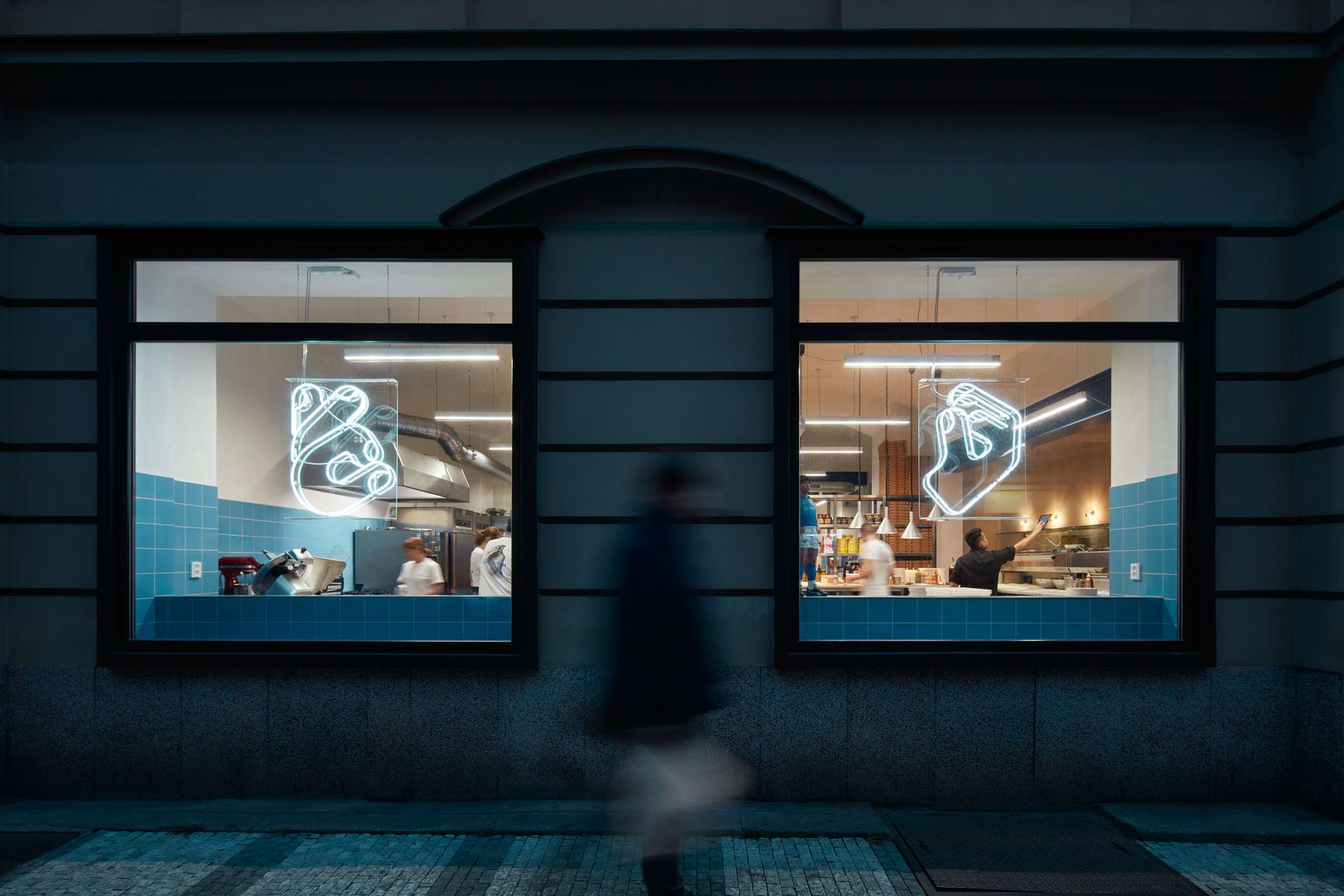 Kuchyni, která se otevírá do restaurace i do ulice, vévodí pec na pizzu a za ní drobná nika, v níž bydlí zmiňovaná Maradonova socha. Niku jsme objevili při první návštěvě a ihned nám bylo jasné, že pro tento otvor bude Diego vyřezán. Péče byla věnována formulaci velkorysého vstupního prostoru a za růžovým pultem se otevírá rozsáhlá šatna na kabáty. Dlouhý podélný průhled do hlavní místnosti uzavírá luxferová vinotéka. Členitou dispozici využíváme pro práci s různými typy sezení: kromě degustačního stolu také vysoké sezení, lavici a drobnější stoly v duchu italských bister.