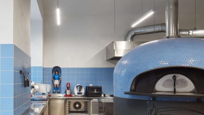 O plzeňské pizzerii Da Pietro se říkalo, má nejlepší neapolskou pizzu a otevření pobočky na pražských Vinohradech podle návrhu studia Neuhäusl Hunal bylo logickým krokem. Stavební program definovaly dva na míru vyrobené základní kameny: pec na pizzu italského mistra pecaře a socha Diega Maradony v neapolském dresu.