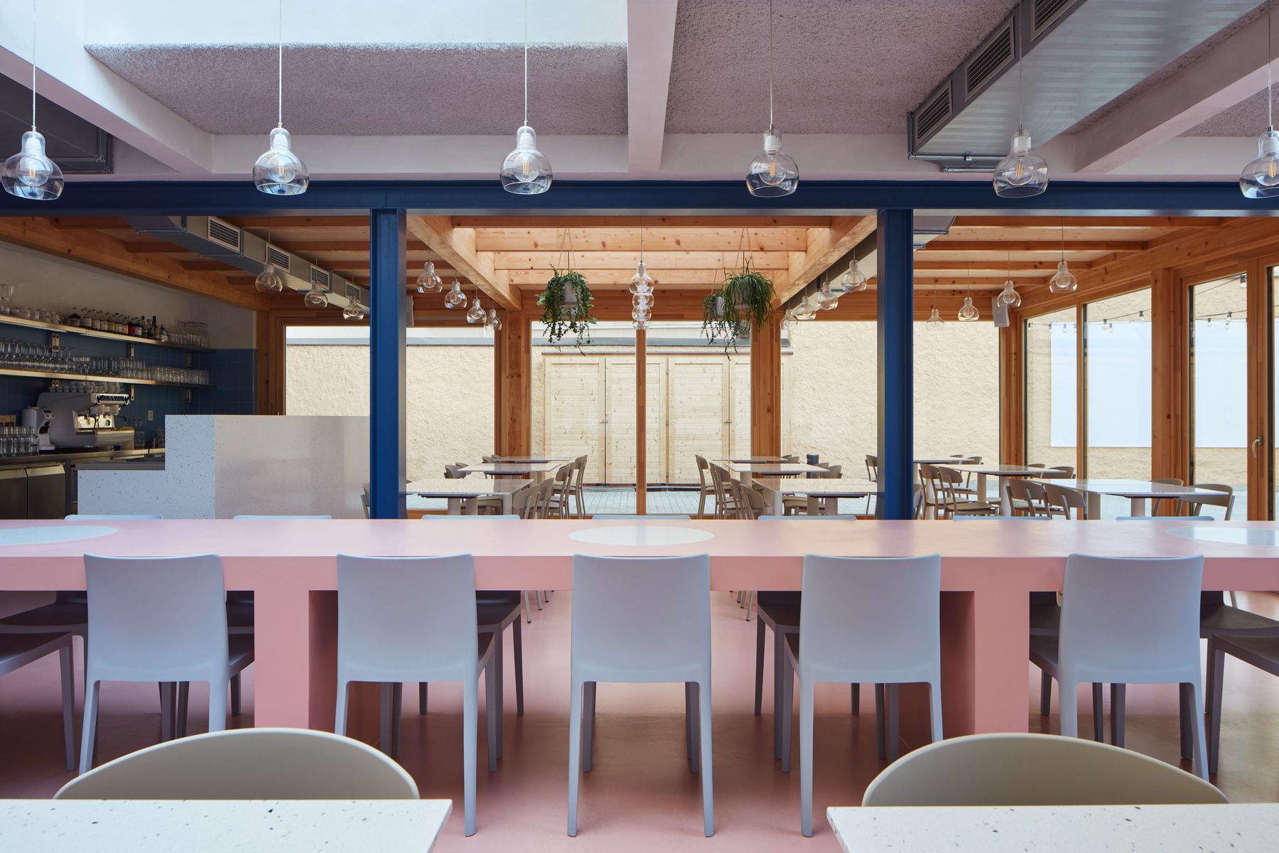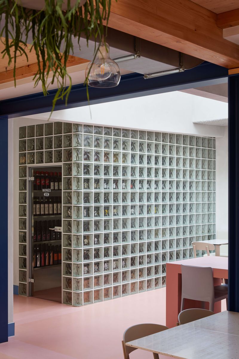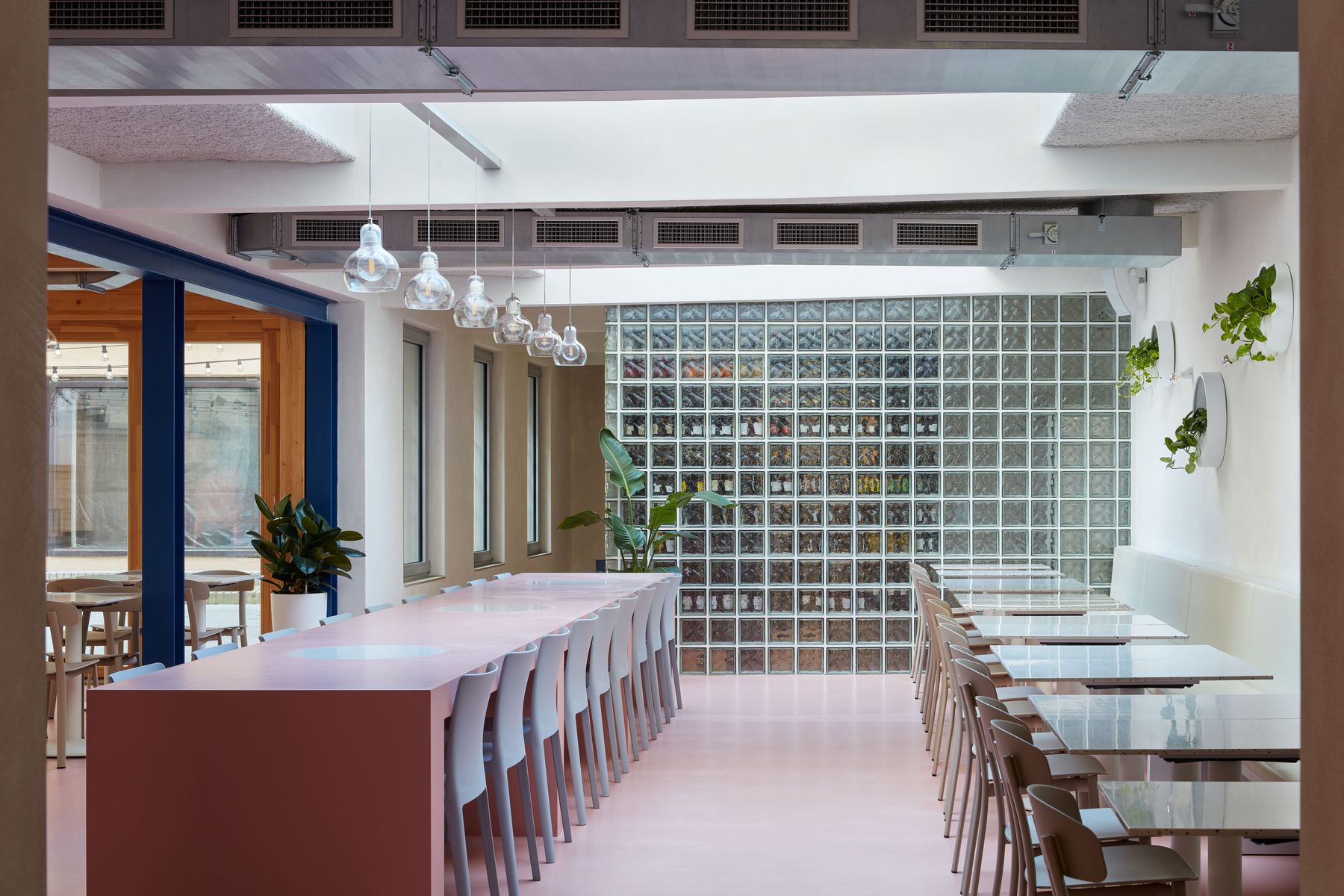 Interiéru proto dominuje růžová podlaha, z níž vystupují dva zásadní bloky: uvítací pult u vstupu a gargantuovský degustační stůl pro 18 bytostí. Podlahu lemuje jedna řada modrého keramického obkladu, který se v patřičných místech (šatna, bar) zvedá do potřebné výšky. Materiály a barevnost zbylých prvků jsou spíše decentní, aby podtrhly výraznou barevnost a čistotu celého interiéru. Za zmínku stojí hrubá akustická omítka uzavírající prostor na stropě a umělý kámen, z něhož jsou vyrobeny desky stolů a kuchyňské i barové pulty.