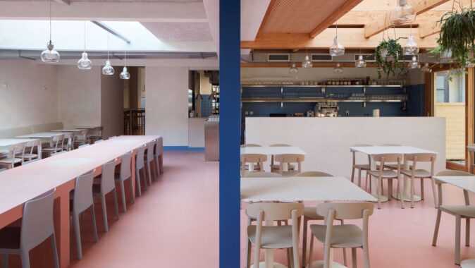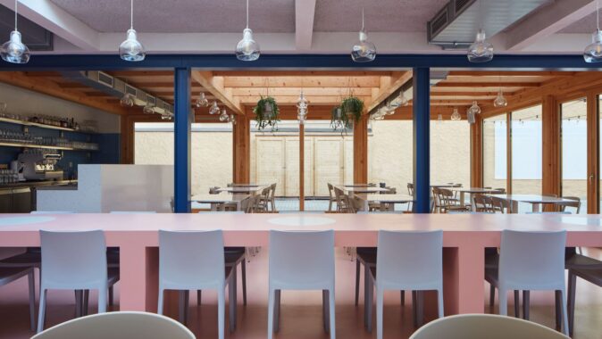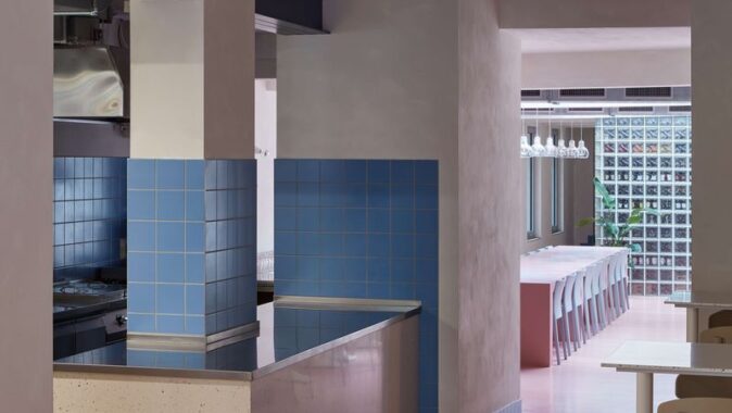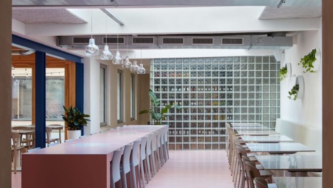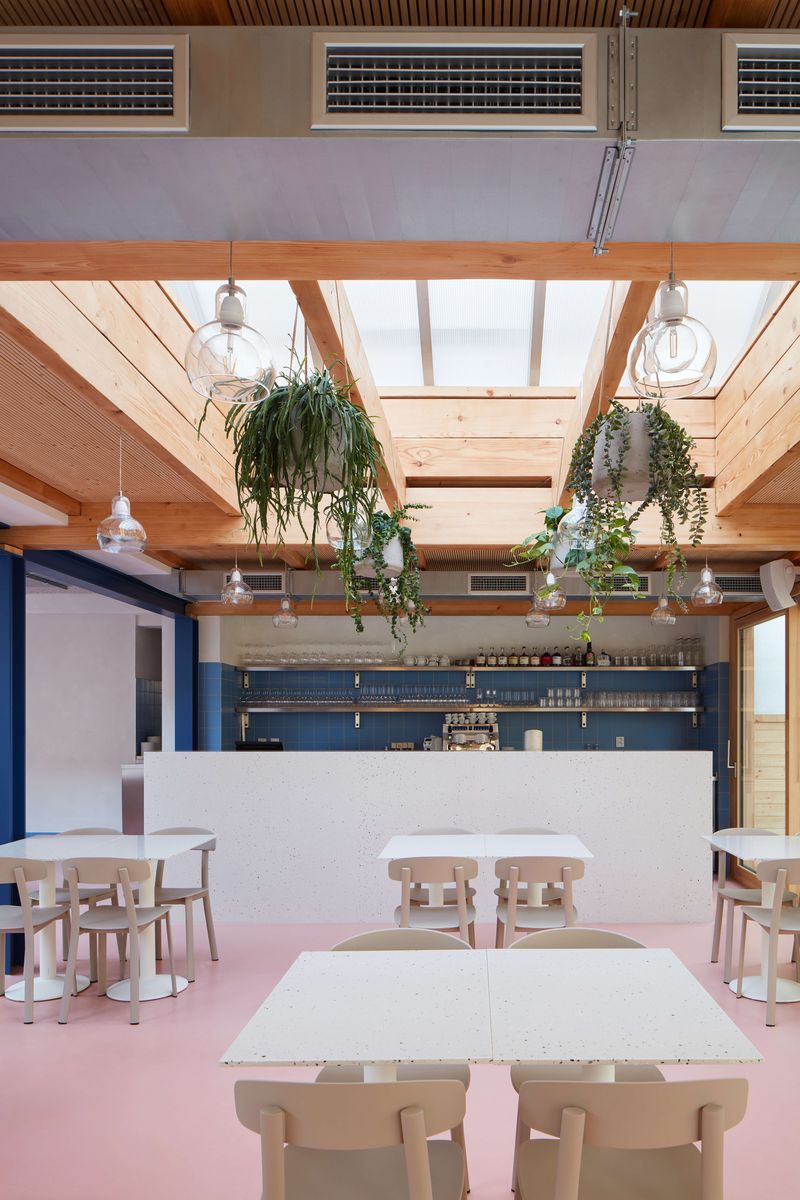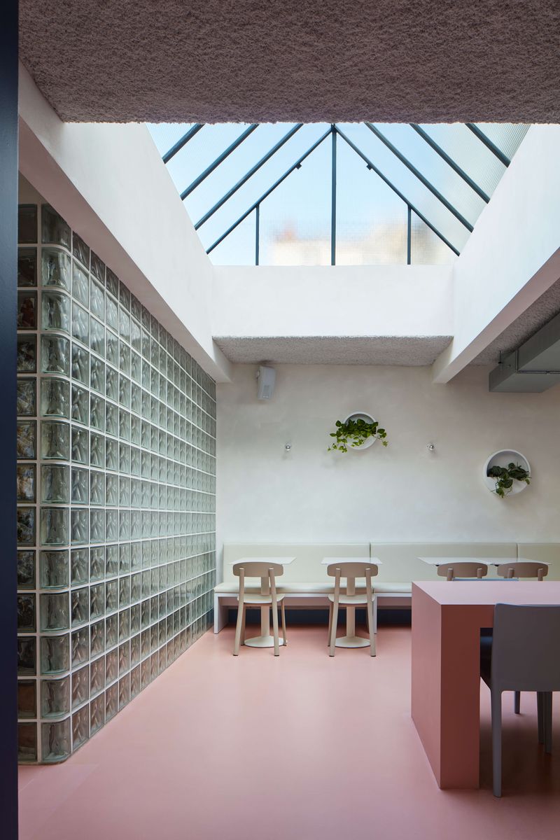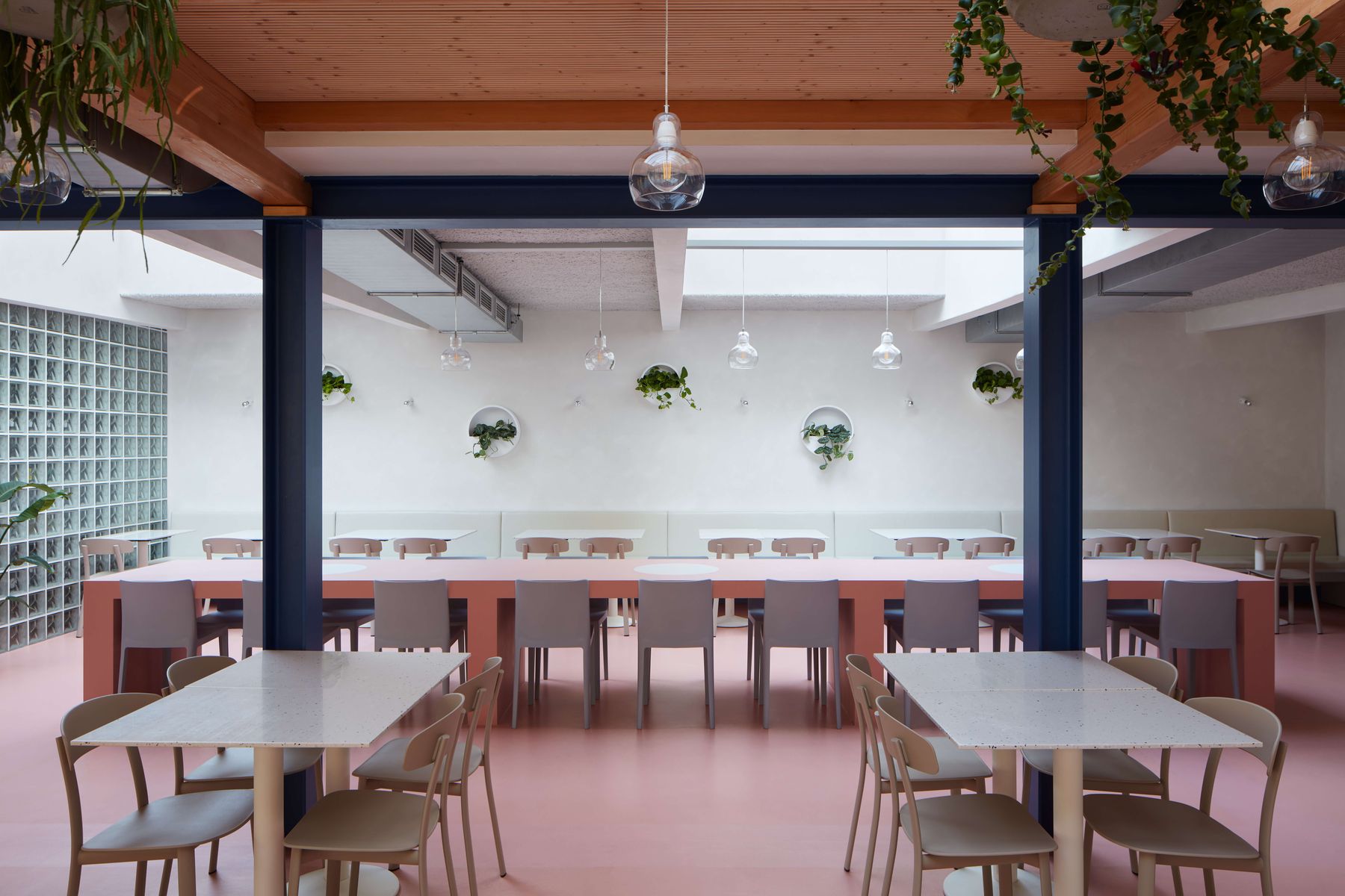 Interiéru proto dominuje růžová podlaha, z níž vystupují dva zásadní bloky: uvítací pult u vstupu a gargantuovský degustační stůl pro 18 bytostí. Podlahu lemuje jedna řada modrého keramického obkladu, který se v patřičných místech (šatna, bar) zvedá do potřebné výšky. Materiály a barevnost zbylých prvků jsou spíše decentní, aby podtrhly výraznou barevnost a čistotu celého interiéru. Za zmínku stojí hrubá akustická omítka uzavírající prostor na stropě a umělý kámen, z něhož jsou vyrobeny desky stolů a kuchyňské i barové pulty.