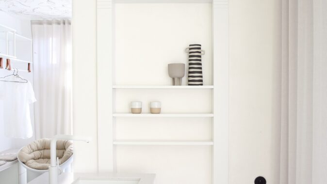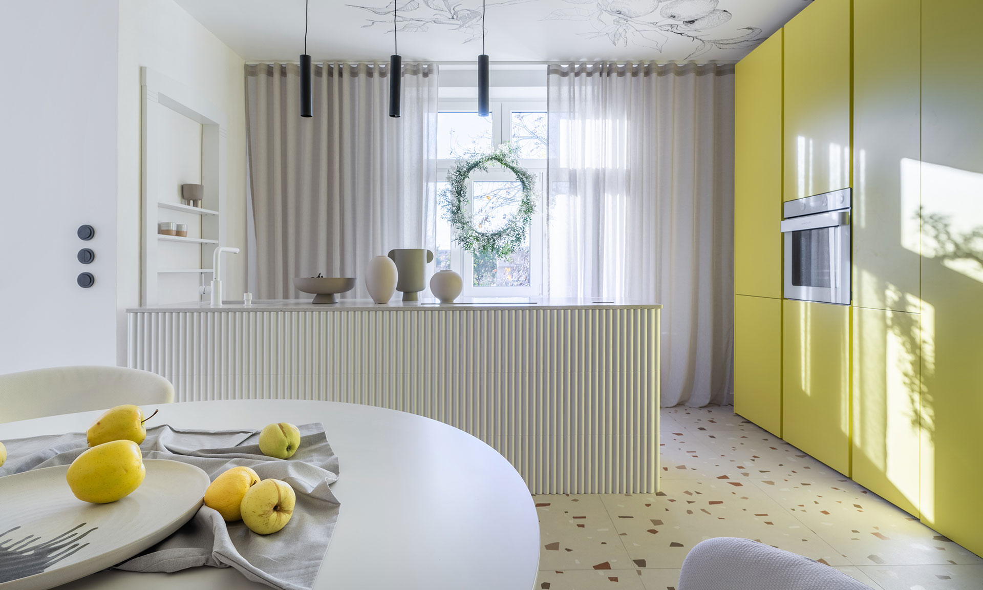 - Interiér kombinuje různé tóny bílé barvy, doplněné akcentem ostře žluté nábytkové sestavy, která obestavuje dělící příčku a tvoří vysokou sekci kuchyně s vestavnými spotřebiči a ze strany ložnice šatní skříně.
