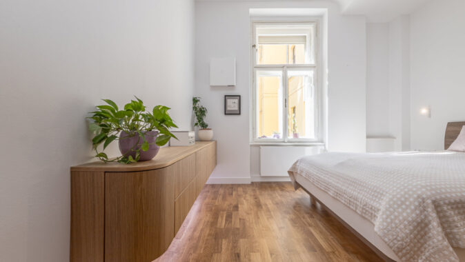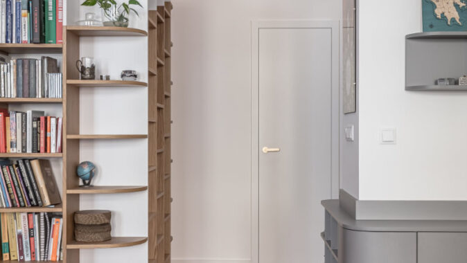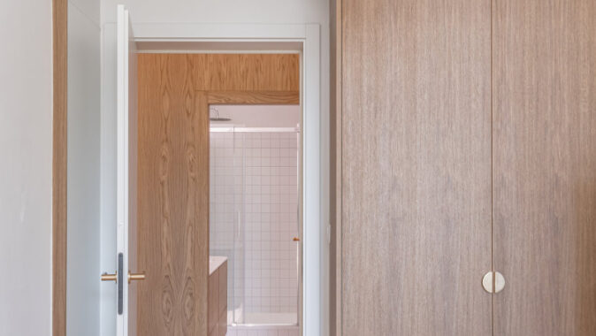 Každý detail tu má svůj smysl – žádná zbytečnost, žádná efektní gesta. Nové dveře dorostly ke stropu, aby prostor dýchal. Světlo se odráží od teplých tónů parket a putuje po bytě až do šatny, která nahradila jednu z původních koupelen. Mosazné úchyty se prolínají celým bytem, kuchyňská deska se jemně láme do oblouku a kabely od rekuperace nebo chytré domácnosti zůstávají v neviditelné rovině – přesně tam, kam patří.
