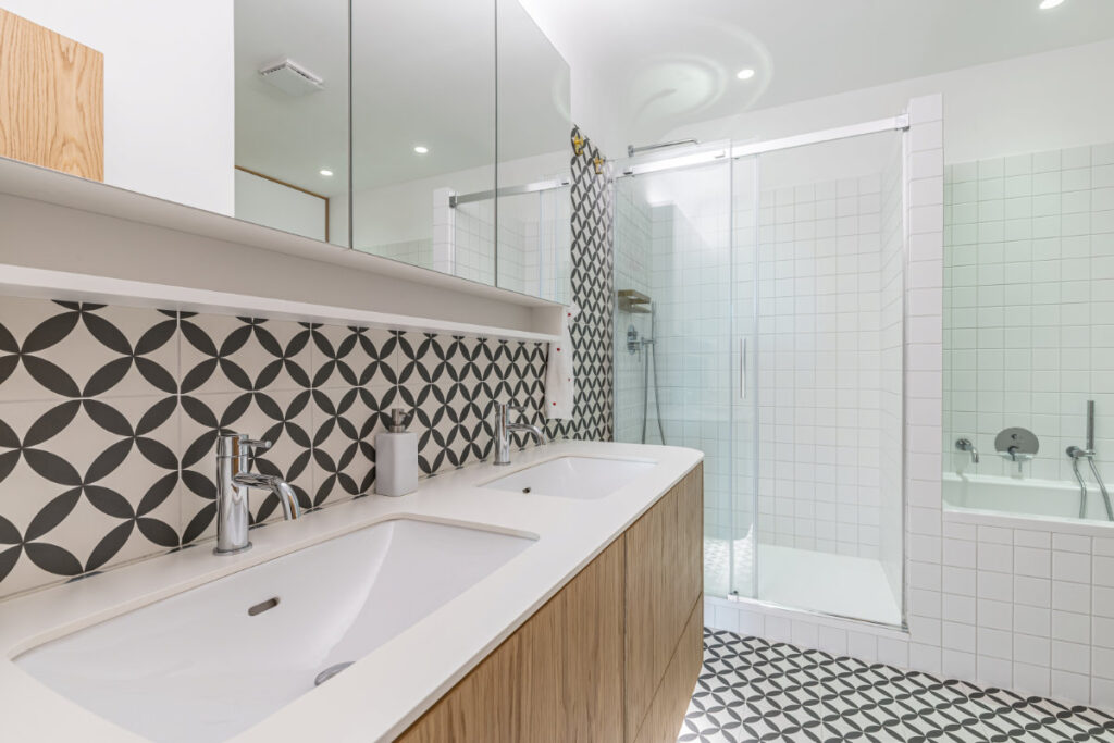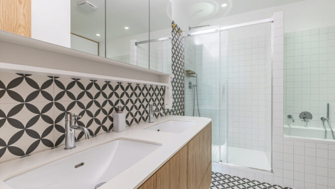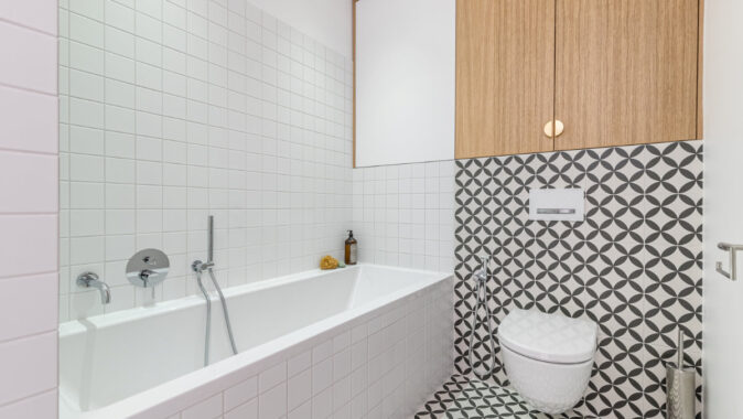 Ložnice v bytě je navržena jako útočiště po celém dni – prostor, kde můžeš zpomalit a nechat město venku za roletami. Tón v tónu laděné barvy, jemné textilie a úplná tma díky venkovním roletám vytvářejí ideální prostředí pro hluboký spánek. Tento prostor si tak zachovává jednoduchost, funkčnost a rovnováhu mezi estetikou a pohodlím. Dvě samostatná umyvadla, dostatek světla a vana – prostor pro sdílení i ticho. Čisté linie, minimum spár, promyšlené detaily a chytré osvětlení podporující přirozený rytmus dne.