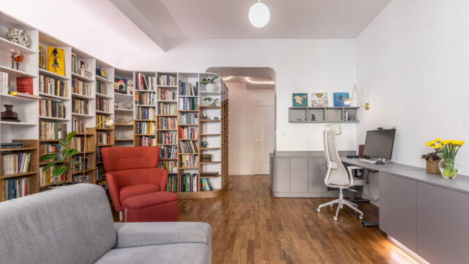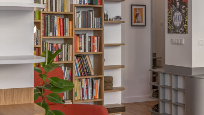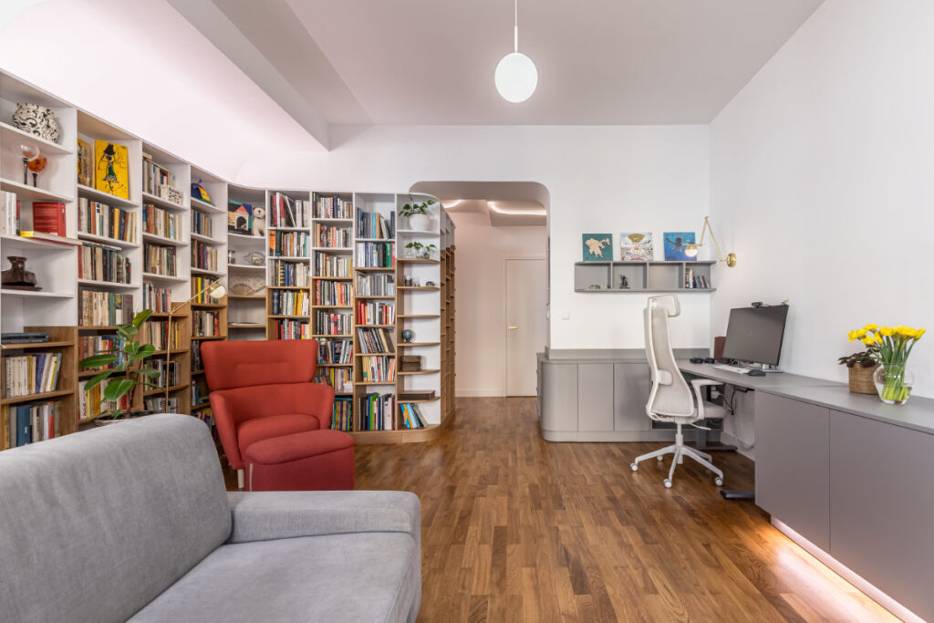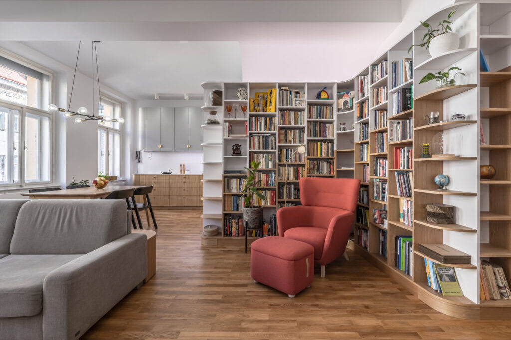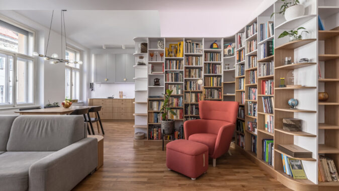 Z původního bytu se dvěma koupelnami jsme vytvořili světlý, otevřený prostor, který přirozeně propojuje život, práci i odpočinek. Centrem bytu je obytný prostor s kuchyní a knihovnou, kde se dá vařit, pracovat, číst i povídat si – všechno najednou, aniž by si kdokoli překážel. Dva pracovní kouty, velkorysá kuchyň, knihovna a místo pro psy i pohodlné křeslo pro čtení a lenošení. Minimalismus s duší, funkčnost – domov, který žije s lidmi, ne vedle nich.