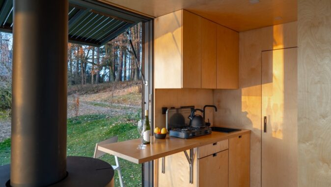Ložnice s nekonečným výhledem a otočným krbem, kuchyňský kout, koupelna s toaletou a sprchou, dvě malé terasy – obytný kontejner KEBIN s vnějšími rozměry 2,6 × 7 metrů, který se nachází nedaleko obce Ondřejov na Pelhřimovsku. Navzdory předsudkům o mobilheimech tak vyslyší požadavky na komfort a navíc dokonale vyjde vstříc i nárokům na design. Na mobilheimy se nevztahují klasická stavební povolení, většinou jim postačuje územní souhlas. Z důvodu snadného přístupu k vodě je ideální kontejner umístit na parcelu se studnou.