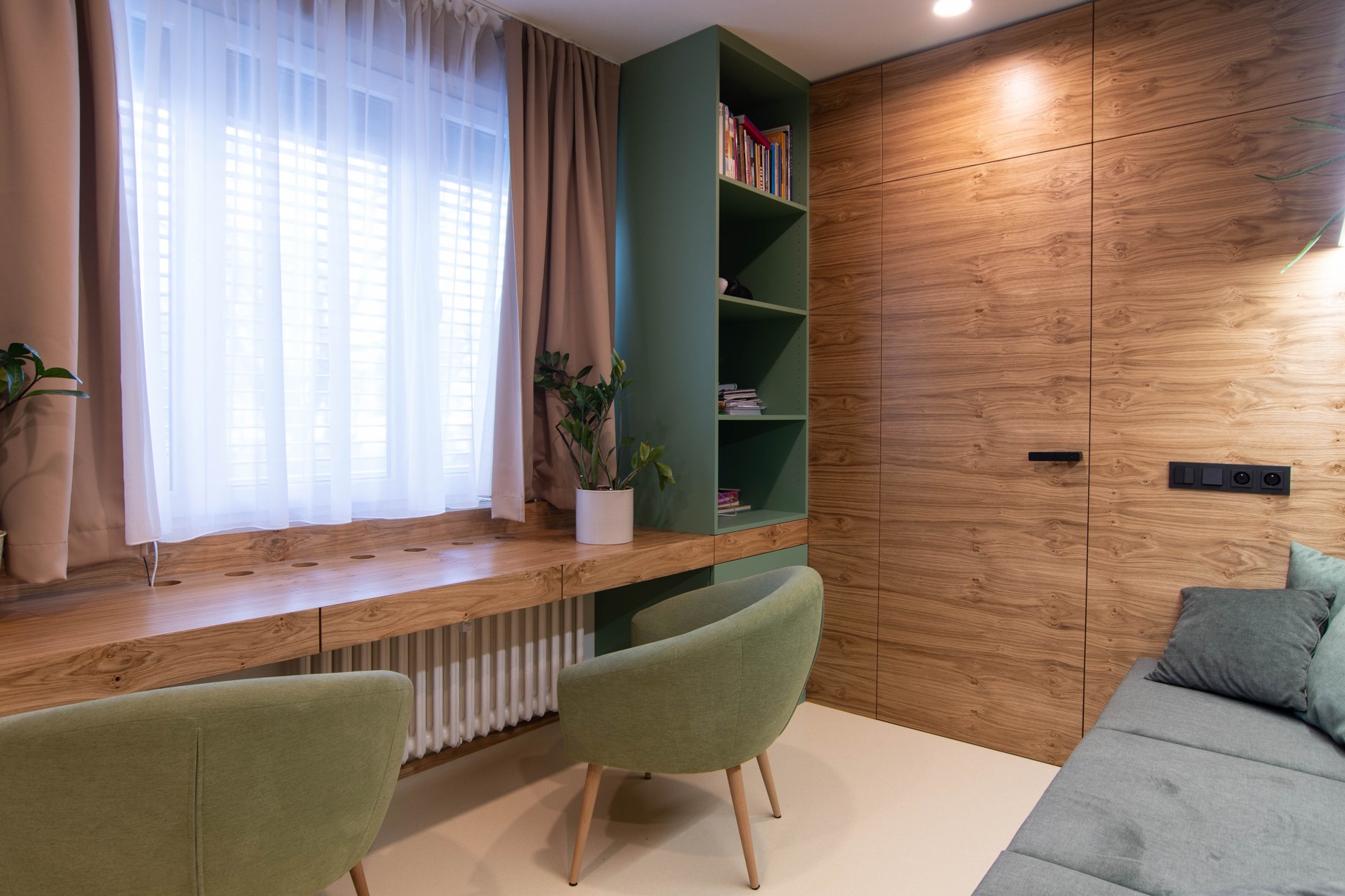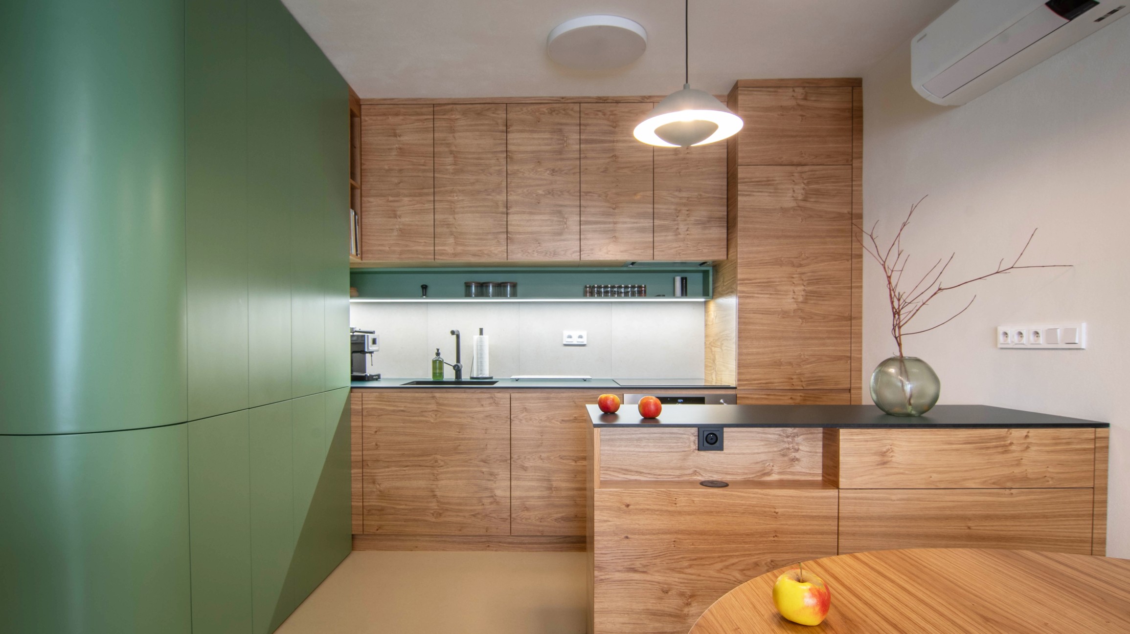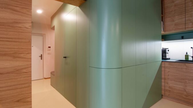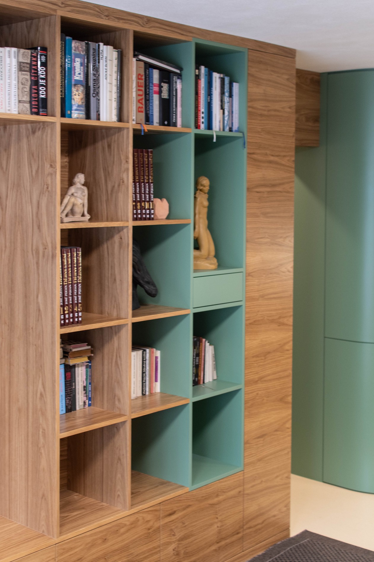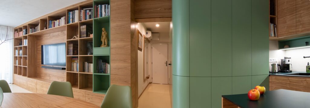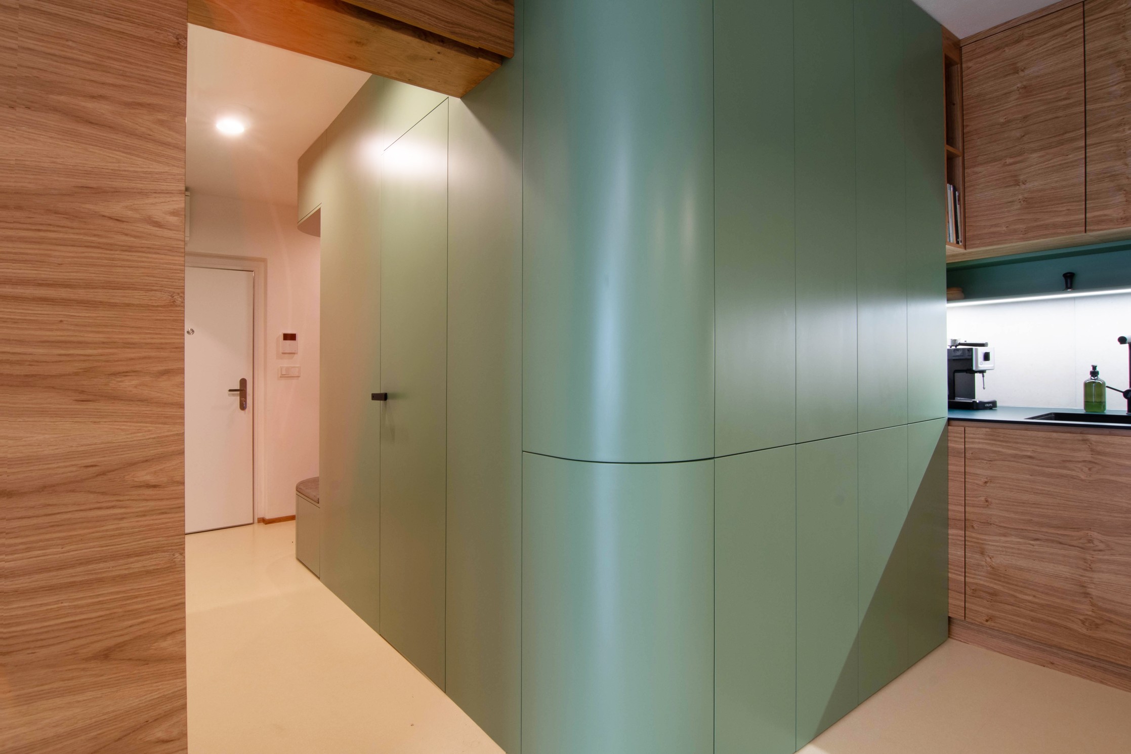 Centrální část – hygienické jádro a kuchyně – jsou obaleny do měkkého zaobleného tvaru v zeleném obkladu. Do něj jsou zakomponovány i dveře a skříňky ať už na boty, pračku, nebo potraviny. Také pohovka v pracovně. Druhým klíčovým materiálem je tmavá dubová dýha. Vstup do ložnice je v obkladu skrytý a ze strany ložnice je možnost výhledu na čistou sestavu skříní, kde dveře nejsou patrné. Jde o takovou vzpomínku na Adolfa Loose. Podlaha je kaučuková světlá, tvoří neutrální podklad pro ostatní prvky interiéru. Všechny čalouněné části jsou se zeleným potahem včetně polštářů.