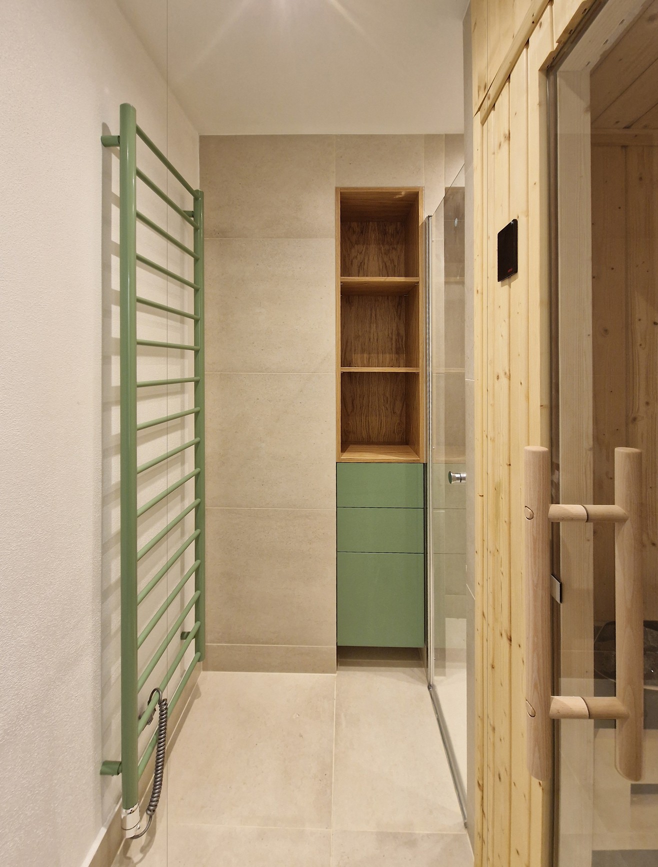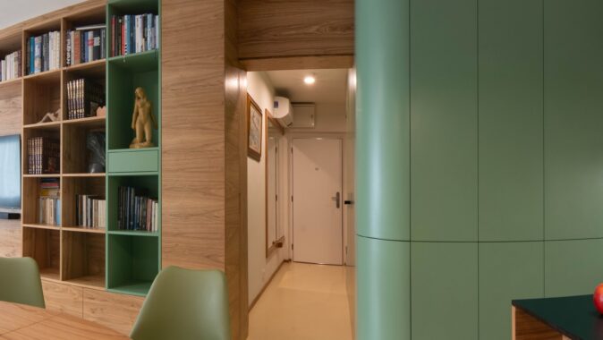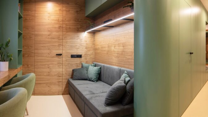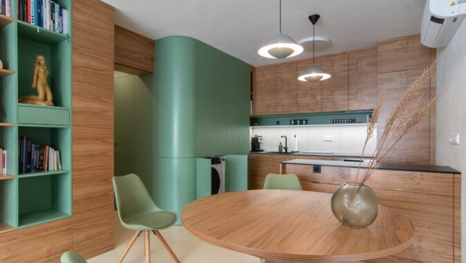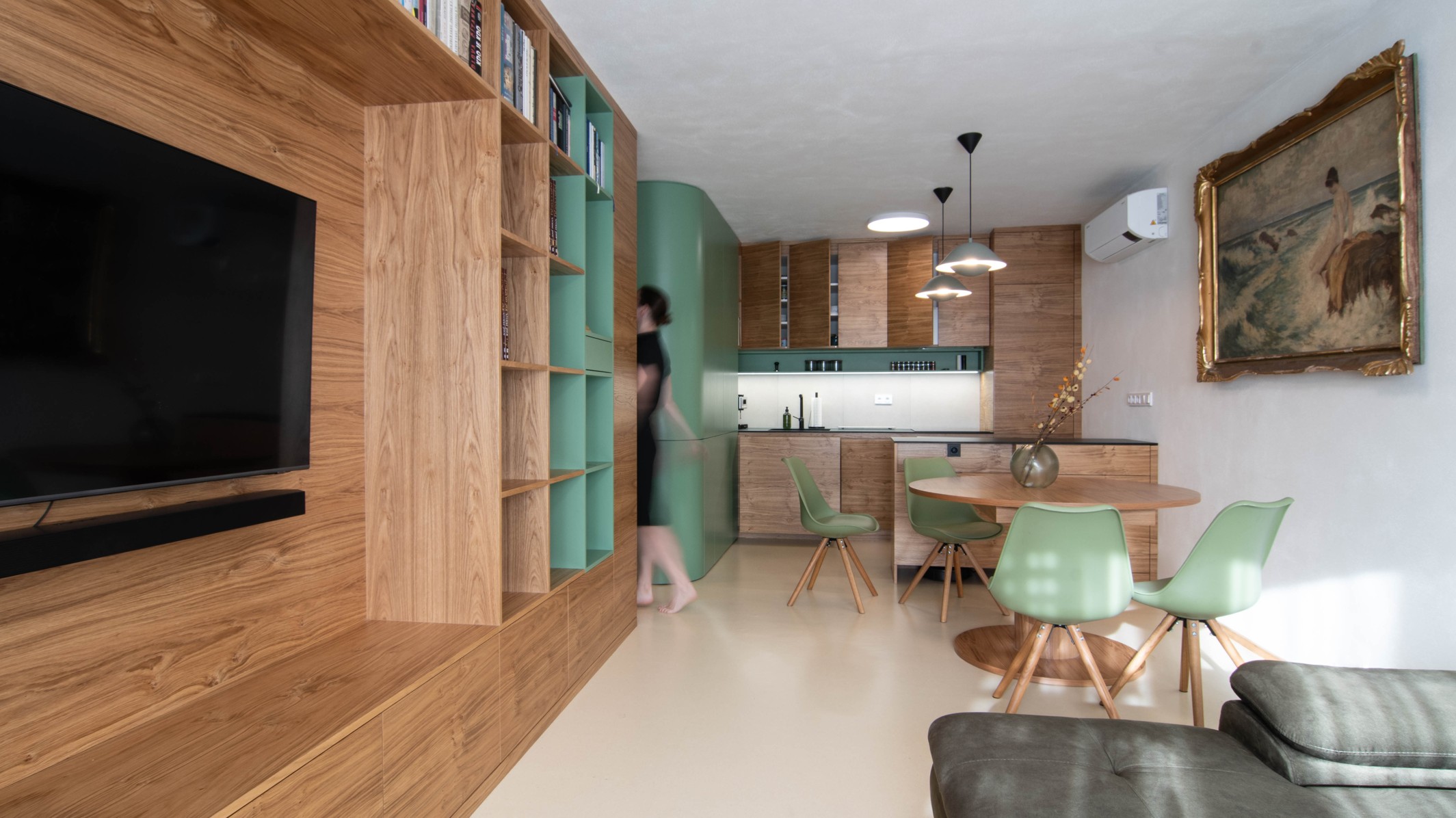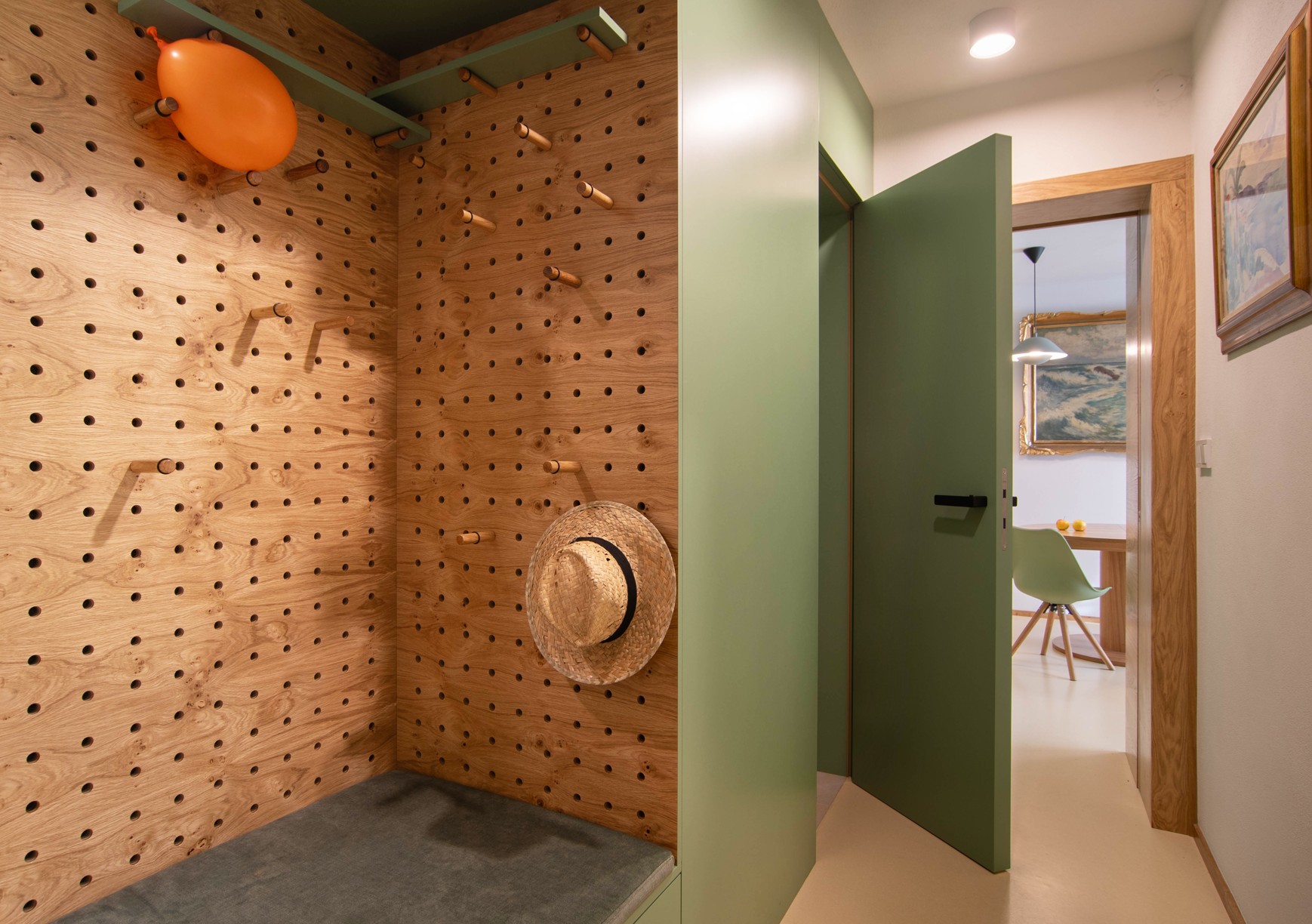 Centrální část – hygienické jádro a kuchyně – jsou obaleny do měkkého zaobleného tvaru v zeleném obkladu. Do něj jsou zakomponovány i dveře a skříňky ať už na boty, pračku, nebo potraviny. Také pohovka v pracovně. Druhým klíčovým materiálem je tmavá dubová dýha. Vstup do ložnice je v obkladu skrytý a ze strany ložnice je možnost výhledu na čistou sestavu skříní, kde dveře nejsou patrné. Jde o takovou vzpomínku na Adolfa Loose. Podlaha je kaučuková světlá, tvoří neutrální podklad pro ostatní prvky interiéru. Všechny čalouněné části jsou se zeleným potahem včetně polštářů.
