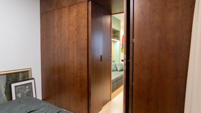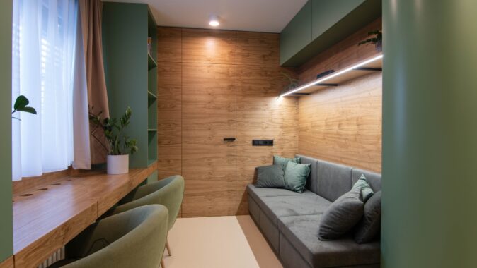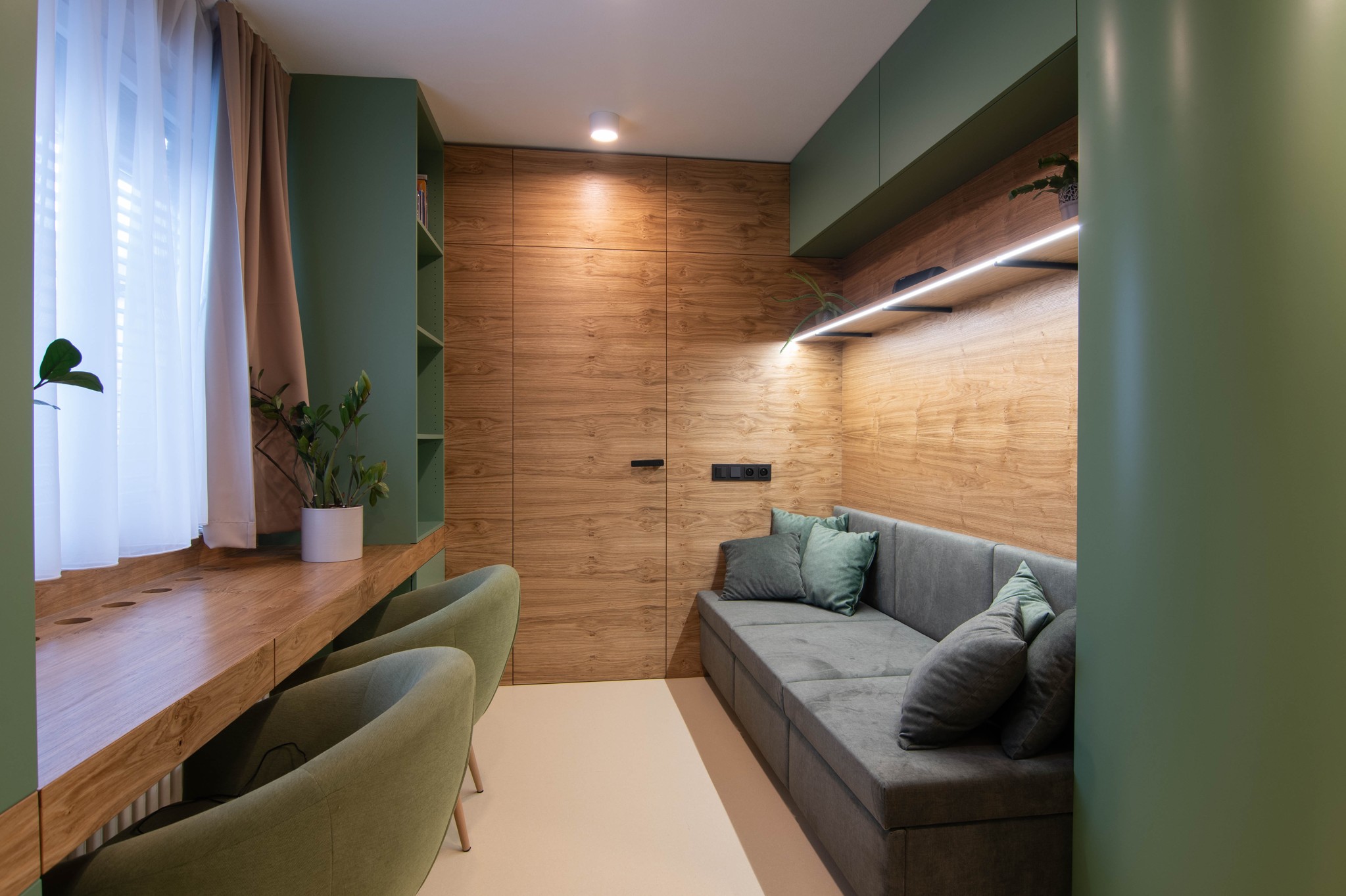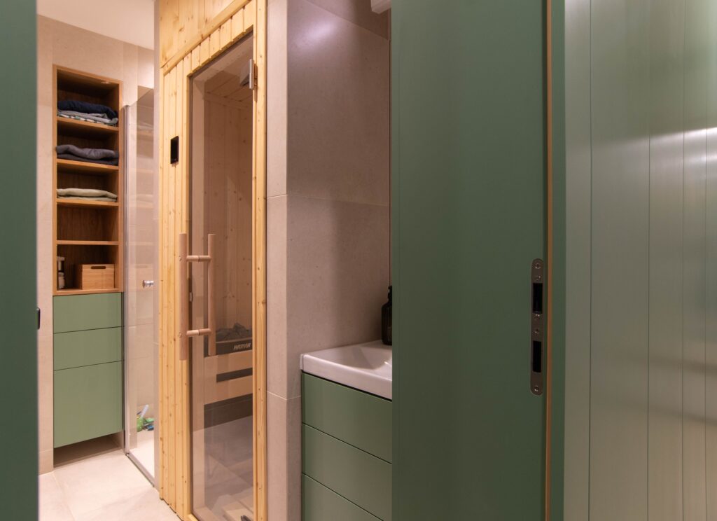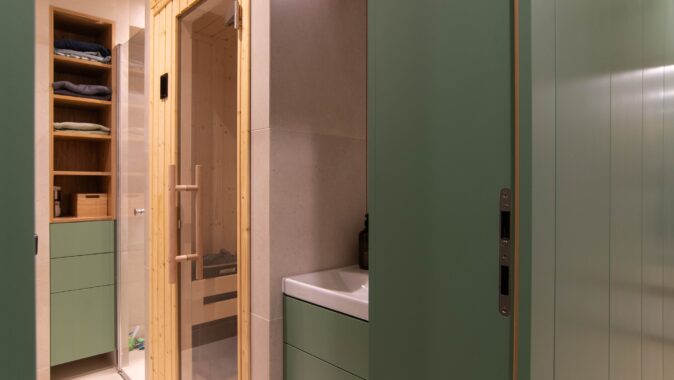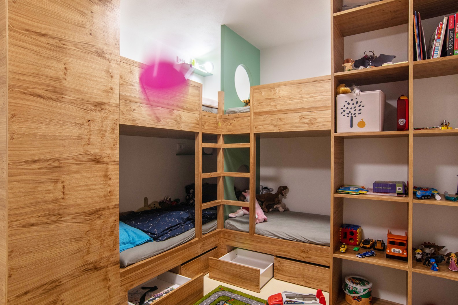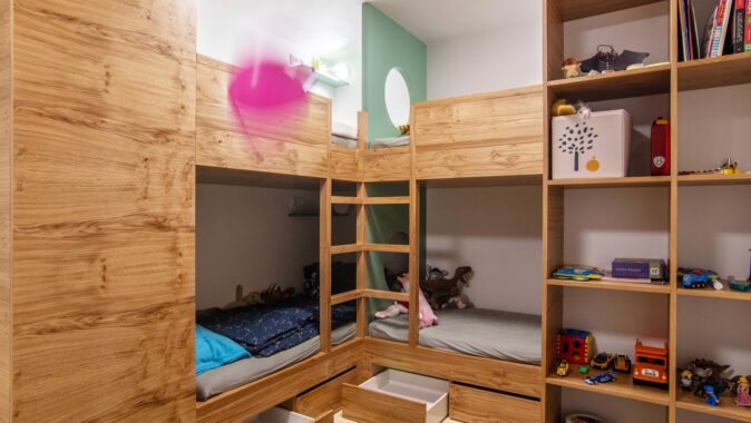Pokojík pro příležitostné přespání čtyř sourozenců byl s požadavkem na vytvoření alespoň částečně soukromých zákoutí. Lůžka palandy jsou od sebe částečně oddělena přepážkami se znovu se opakující zelenou barvou a kruhovými otvory. Každé lůžko má svou odkládací poličku. Zároveň jsou tato místa kryta knihovnou a šatní skříní tak, aby vznikly intimní pelíšky. Součástí koupelny je dle požadavku také vestavěná sauna. Materiály a barvy použité jinde v bytě se v koupelně znovu opakují na neutrálním základu velkoformátových keramických obkladů.