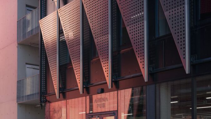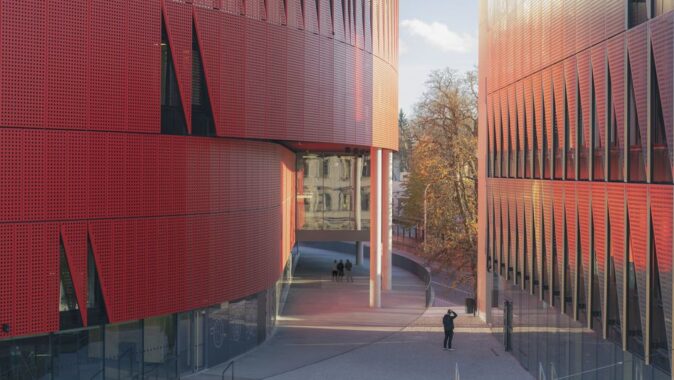 Plášť budovy je vedle charakteristických červených vrcholových špiček doplněn také o rozměrné autorské ilustrace umístěné na bočních stranách objektu. Tento umělecký prvek s motivy regionu, kultury a sportu přináší projektu výraznou narativní vrstvu. Autorem skic je Lukáš Kijonka ze studia Times New Realism, který stojí také za návrhem orientačního systému: „Autorský font svými drobnými trojúhelníkovými zářezy reaguje na identitu fasády. Orientační systém je proveden s důrazem na primárně architektonické vyznění budovy – má navigovat, ne dekorovat.”