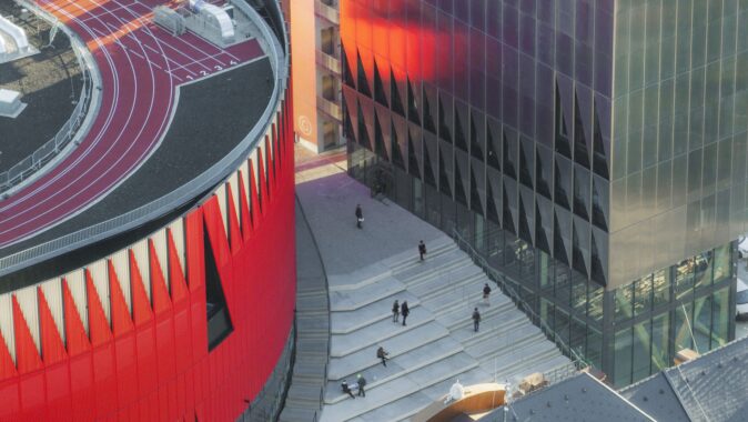 Terénní modelace mezi oběma budovami přirozeně vytváří pobytové schodiště. Mezi ulicí Tolstého a parkem Smetanovy sady tak vznikl amfiteátr pro posezení, veřejné projekce i spontánní setkání. Tím se eliminuje představa stadionu jako bariéry a vzniká otevřený pobytový prostor. Schodiště navíc elegantně zakrývá technické zázemí obou budov a zaklenulo prostor vhodný pro umístění síně slávy přístupné jak z arény, tak z fanshopu. Obě nové budovy propojuje v nejvyšším poschodí lávka vedoucí na střechu arény s veřejně přístupnou běžeckou dráhou určenou školám i veřejnosti. Sport se z uzavřené haly otevírá lidem a připravované vyhlídkové plošiny nabídnou výhled do okolí i nejmenším sportovcům.