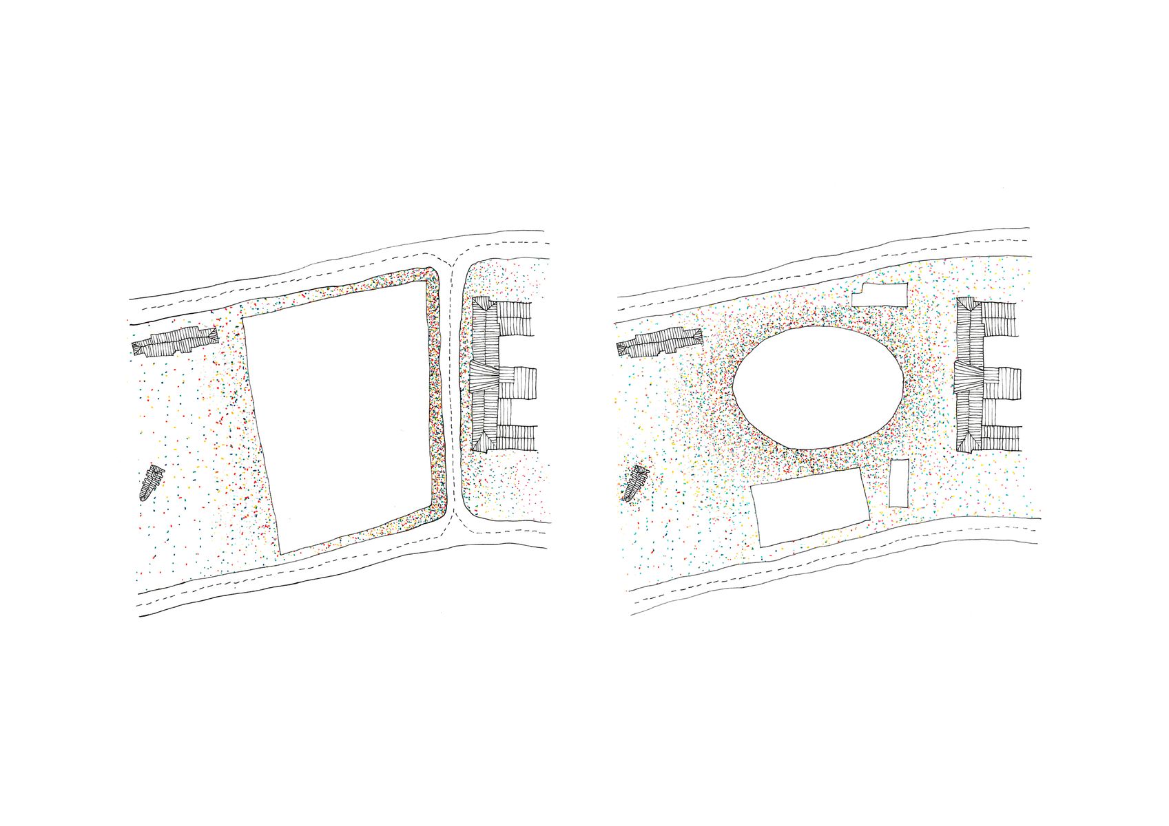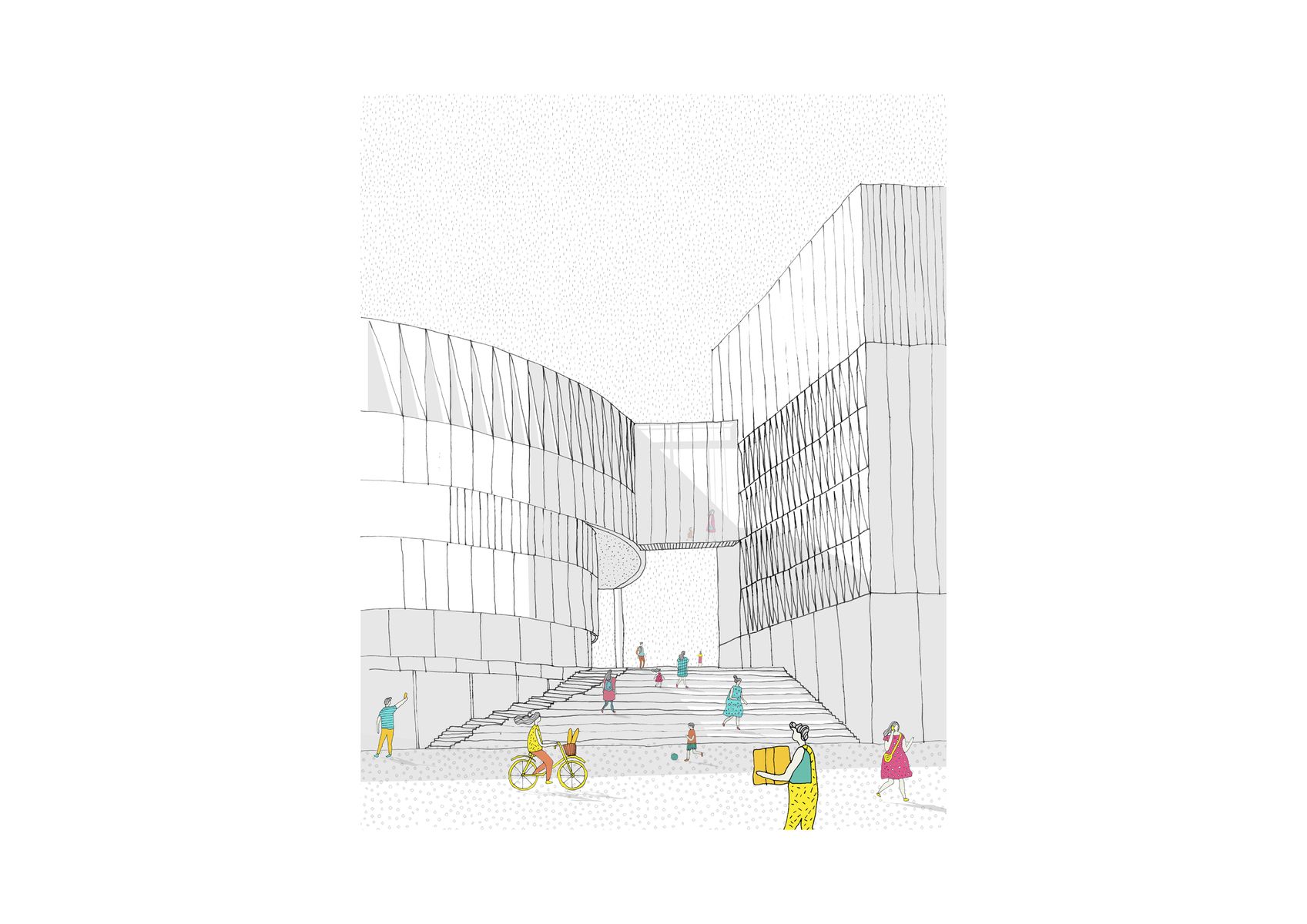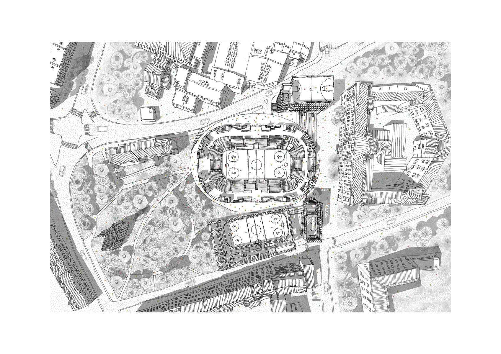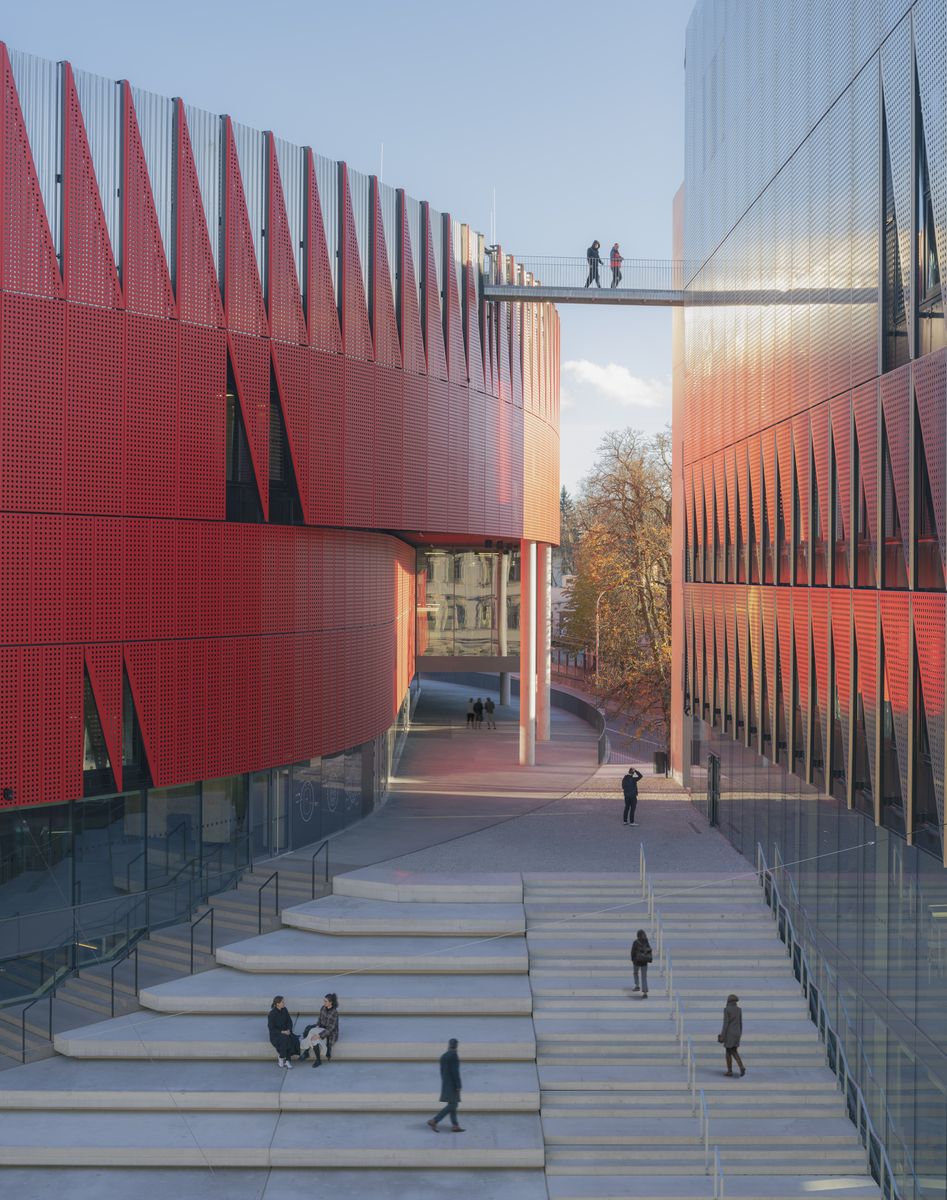 Terénní modelace mezi oběma budovami přirozeně vytváří pobytové schodiště. Mezi ulicí Tolstého a parkem Smetanovy sady tak vznikl amfiteátr pro posezení, veřejné projekce i spontánní setkání. Tím se eliminuje představa stadionu jako bariéry a vzniká otevřený pobytový prostor. Schodiště navíc elegantně zakrývá technické zázemí obou budov a zaklenulo prostor vhodný pro umístění síně slávy přístupné jak z arény, tak z fanshopu. Obě nové budovy propojuje v nejvyšším poschodí lávka vedoucí na střechu arény s veřejně přístupnou běžeckou dráhou určenou školám i veřejnosti. Sport se z uzavřené haly otevírá lidem a připravované vyhlídkové plošiny nabídnou výhled do okolí i nejmenším sportovcům.