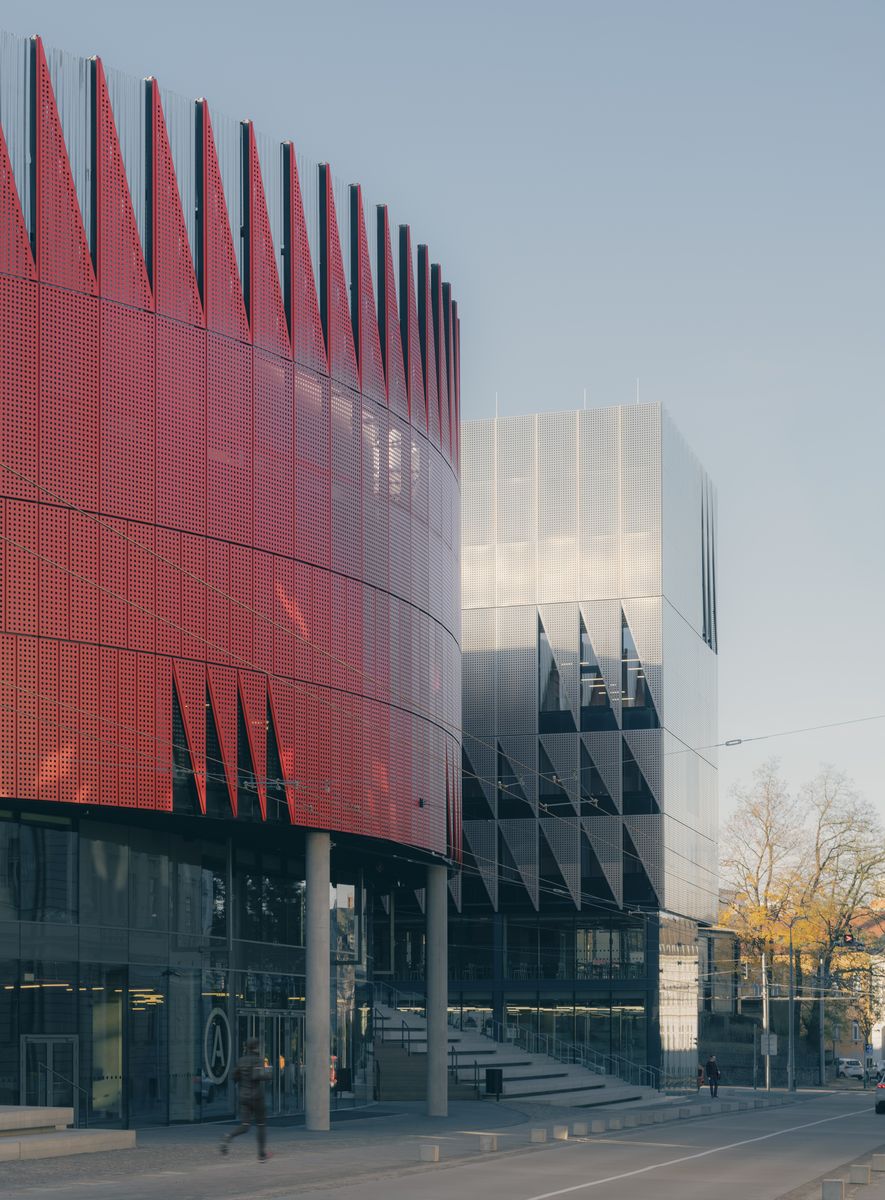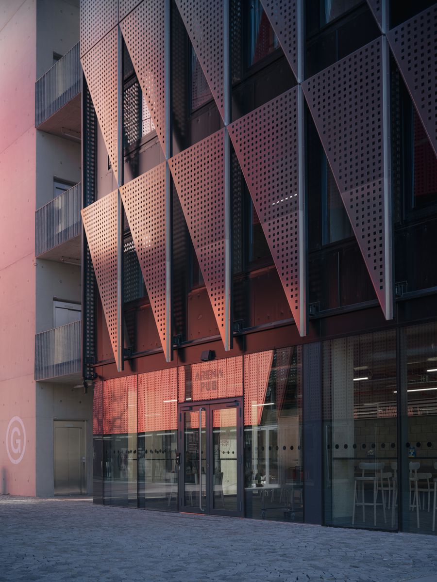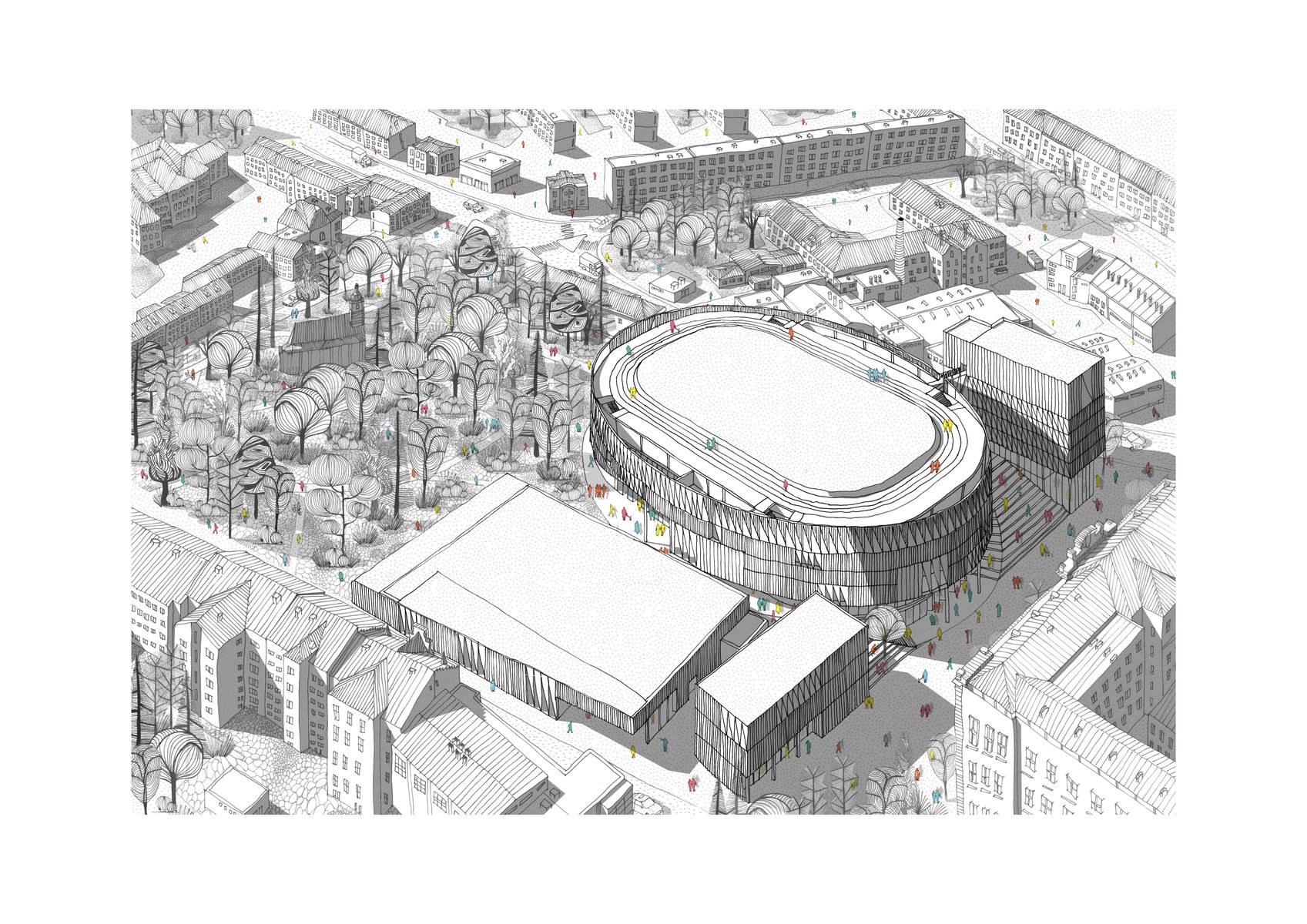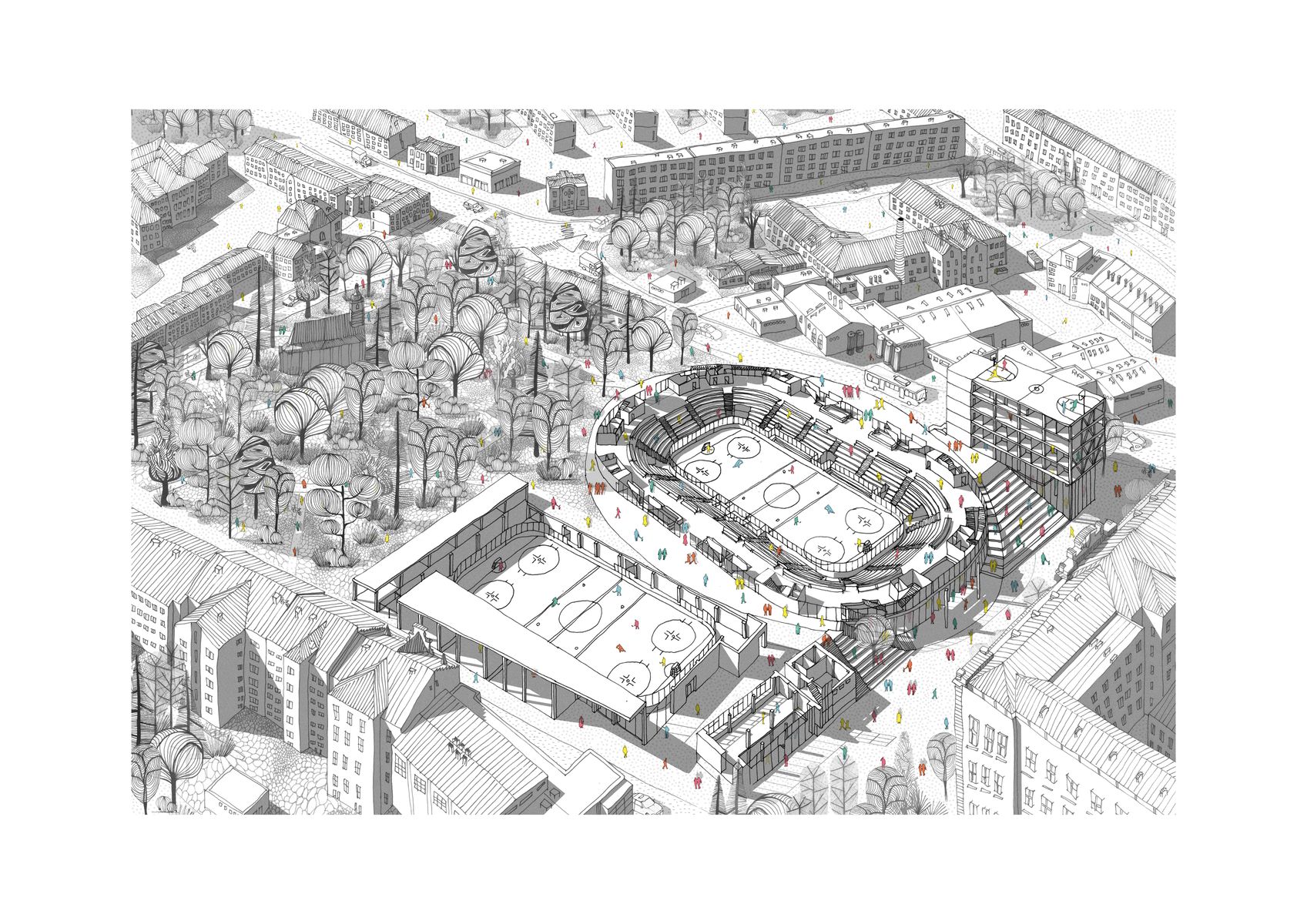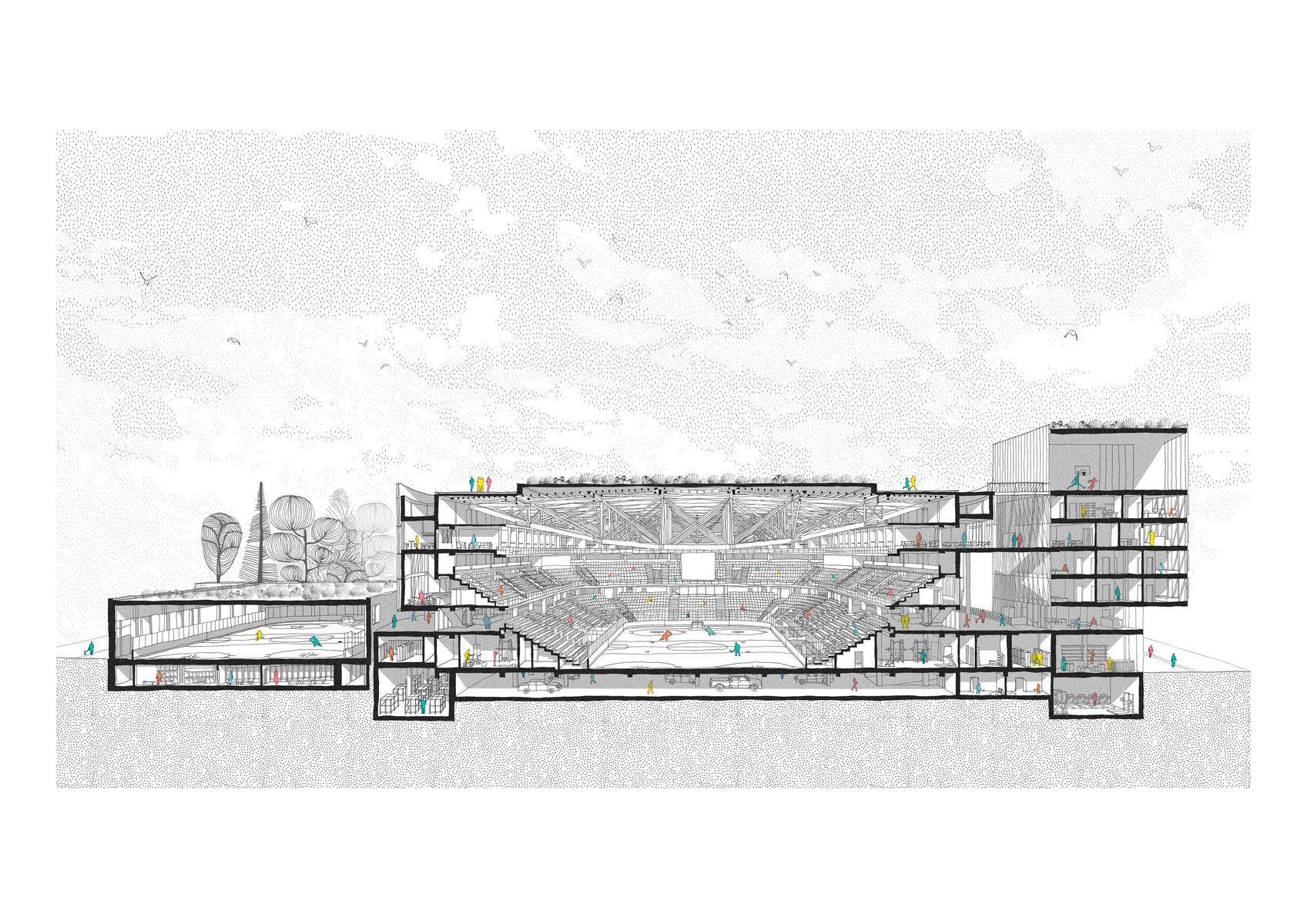 Od začátku byla součástí návrhu energetická efektivita — od přirozeného větrání, přes optimalizaci denního světla až po využití odpadního tepla z ledové plochy. Každý prvek vyvažuje technickou funkci a architektonický výraz, aby aréna sloužila sportovcům, návštěvníkům i kolemjdoucím. Rozdělení funkcí arény mezi dva nové objemy — hlavní halu a nárožní budovu — bylo klíčové k tomu, aby stavba žila i mimo zápasy. Hlavní podlaží arény zůstává vizuálně propojeno s okolím díky prosklenému parteru, zatímco nárožní budova s rovněž prosklenou restaurací a fanshopem, ubytováním, posilovnou a tělocvičnou zajišťuje každodenní provoz.