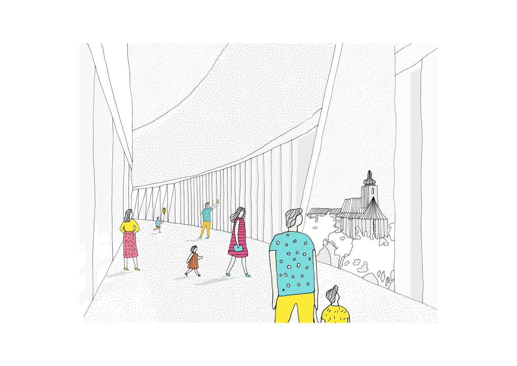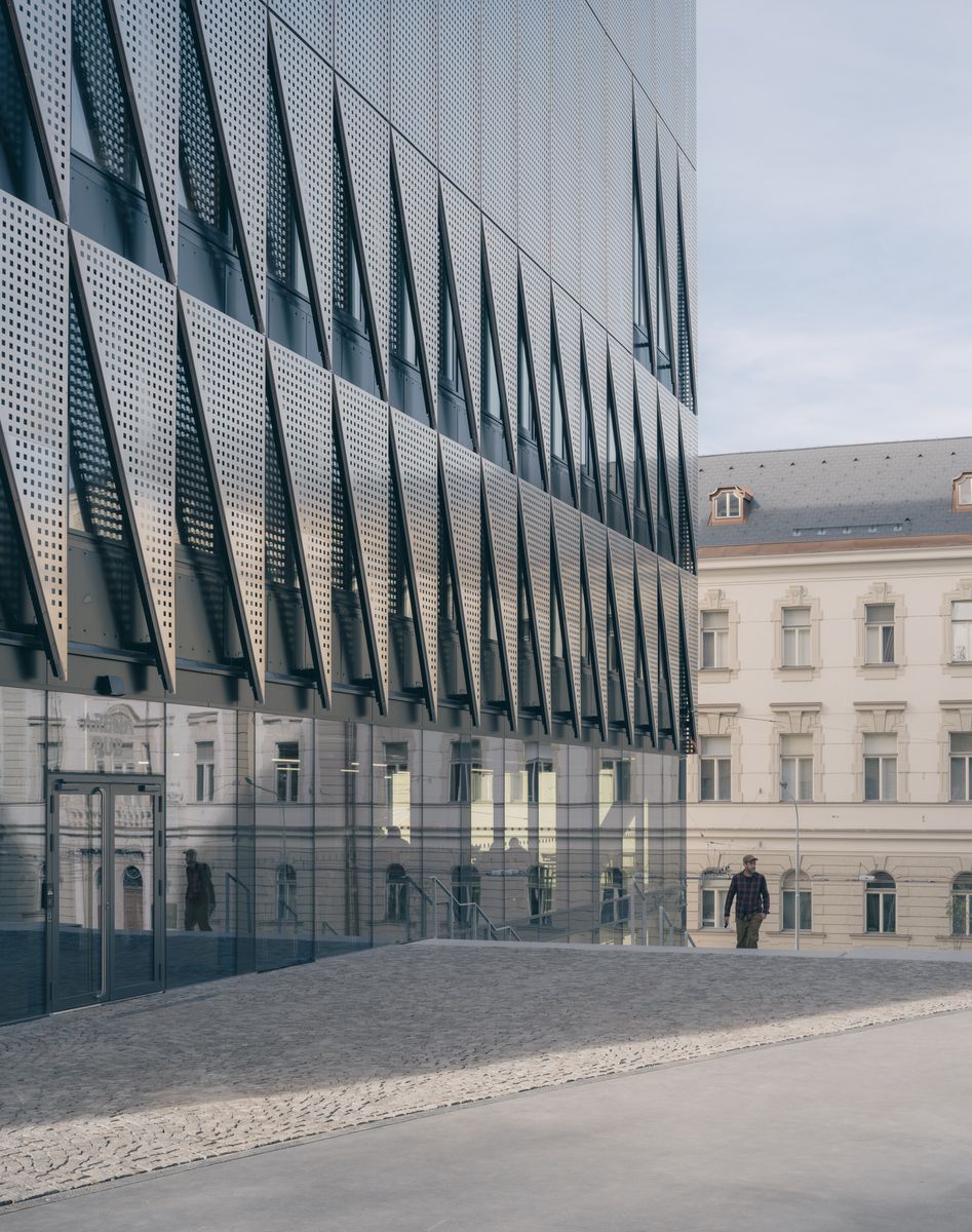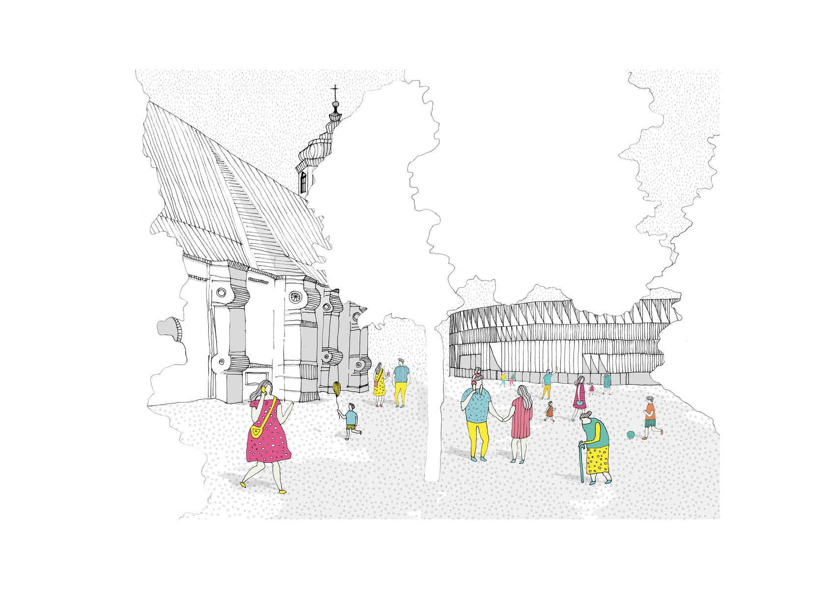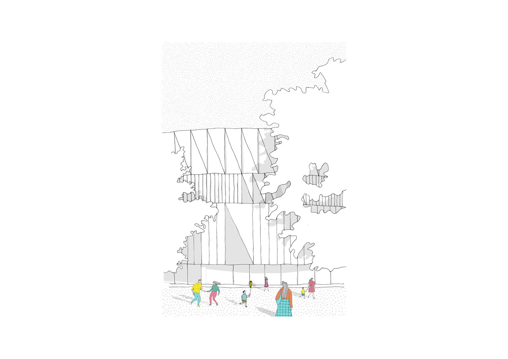 Plášť budovy je vedle charakteristických červených vrcholových špiček doplněn také o rozměrné autorské ilustrace umístěné na bočních stranách objektu. Tento umělecký prvek s motivy regionu, kultury a sportu přináší projektu výraznou narativní vrstvu. Autorem skic je Lukáš Kijonka ze studia Times New Realism, který stojí také za návrhem orientačního systému: „Autorský font svými drobnými trojúhelníkovými zářezy reaguje na identitu fasády. Orientační systém je proveden s důrazem na primárně architektonické vyznění budovy – má navigovat, ne dekorovat.”