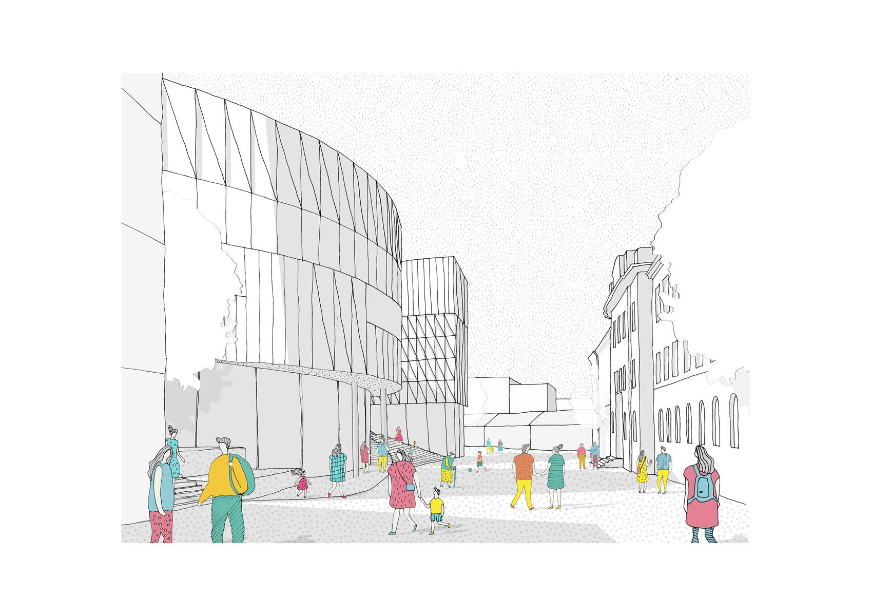 Koncept arény staví na myšlence živé městské struktury – nikoli uzavřené haly, ale otevřené a přirozené součásti města. Vznikl tak propojený kampus. Rozšiřuje veřejný prostor, otevírá přízemí veřejnosti a podporuje prostupnost mezi ulicí Tolstého s univerzitou, parkem Smetanovy sady a okolními ulicemi. Tím vytváří otevřený komplex, který historické centrum doplňuje a rozšiřuje, aniž by s ním soupeřil. Další výhodou umístění je odlehčení automobilové dopravě, neboť během pěti až deseti minut může návštěvník dojít na autobusové i vlakové nádraží.