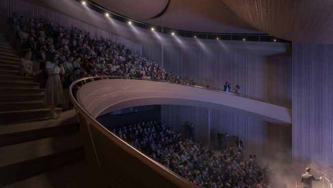 Forma budovy odráží její vnitřní funkční uspořádání, kde se život akademie soustředí kolem centrálně umístěného operního a divadelního sálu vybaveného nejmodernější jevištní technologií. Tento prostor slouží vzdělávacím i společenským funkcím a tvoří srdce celého komplexu. Vzhledem k různorodým potřebám uživatelů jsou veřejné, vzdělávací a technické prostory pečlivě rozděleny do zón s odlišným přístupem, aby byla zajištěna jejich nezávislá činnost.