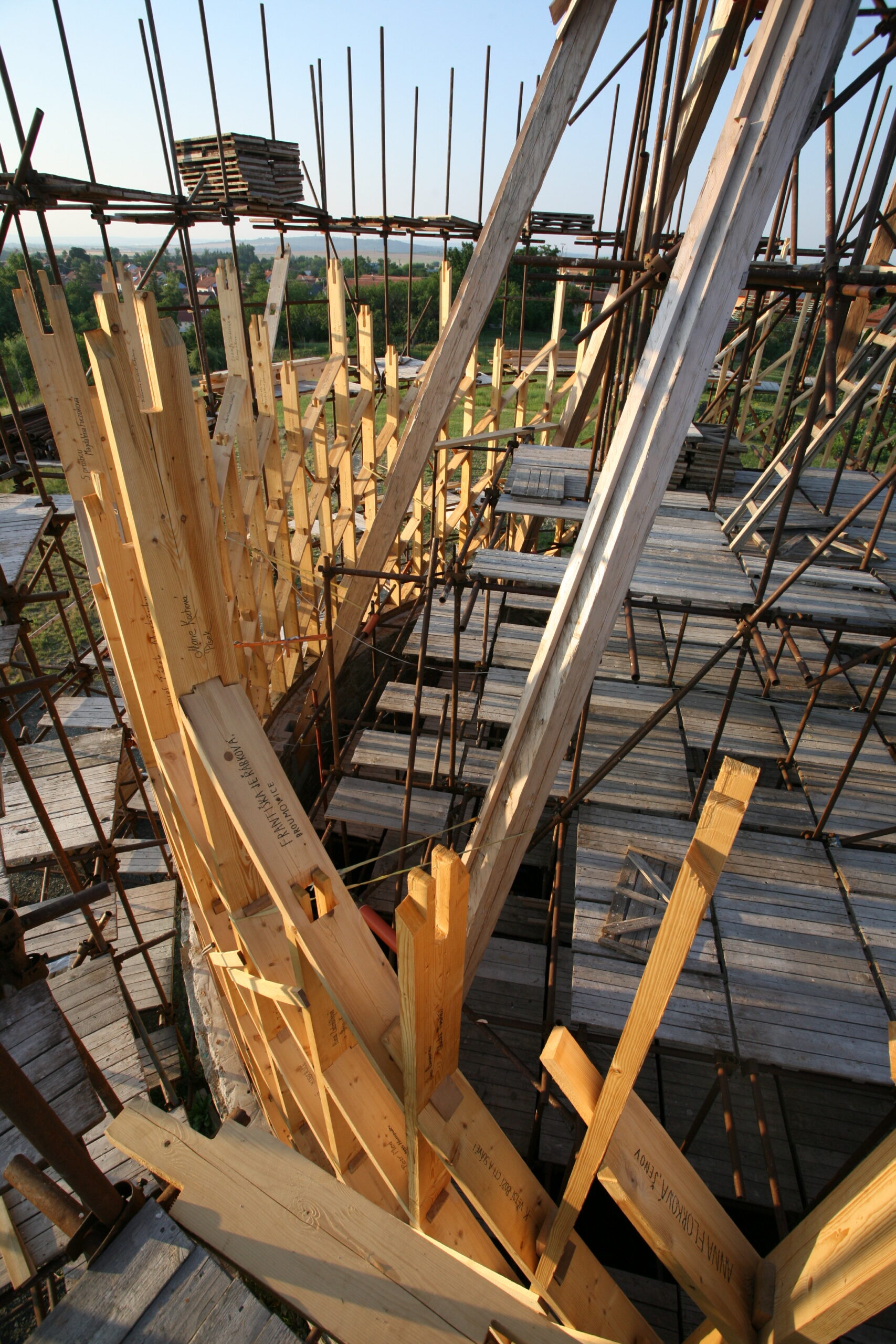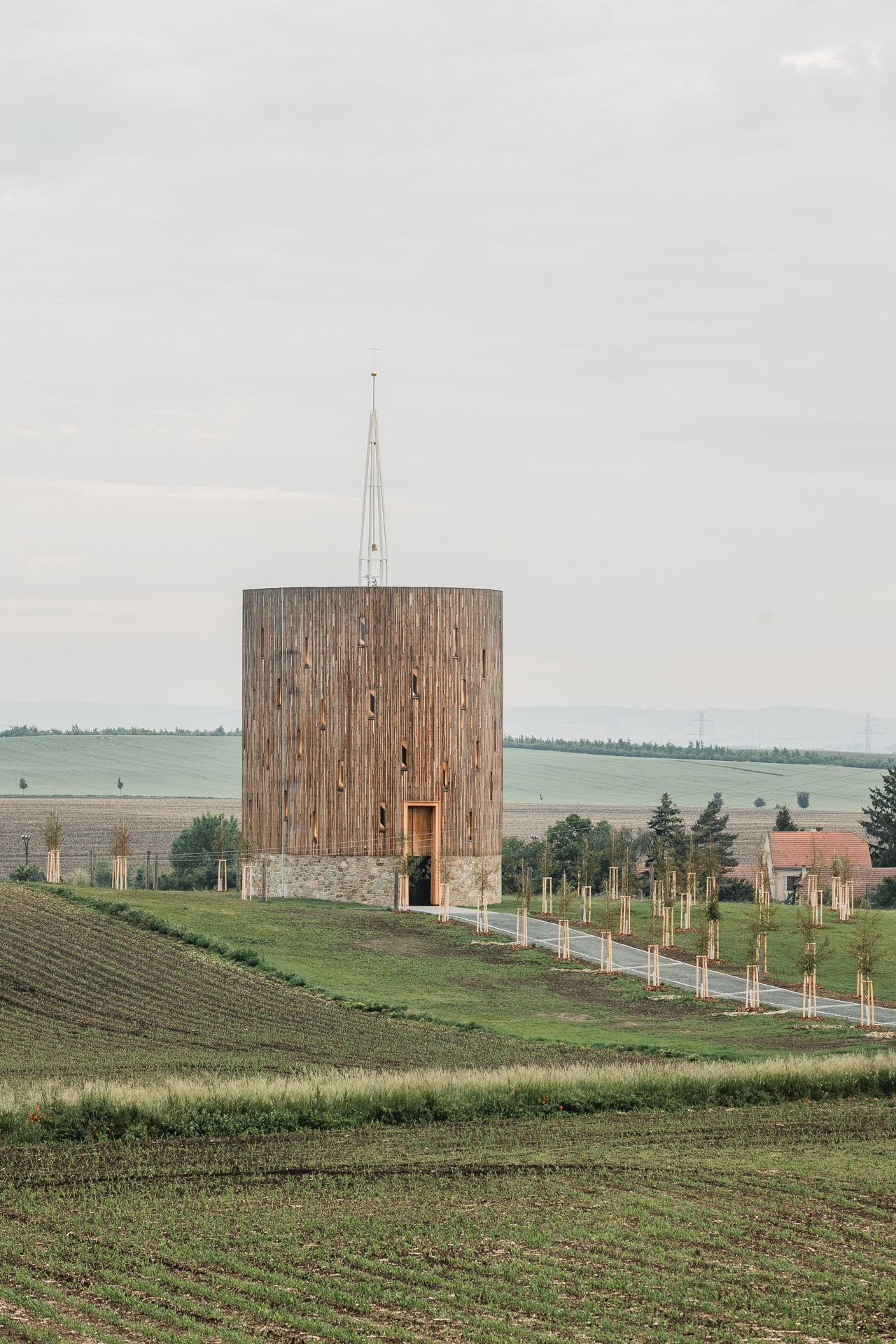 Centrální kruhová stavba kaple v Nesvačilce od autorů Jana Říčného a Filipa Koska (RCNKSK) je vyrobena z ručně tesaných jedlových trámů a lamelové CNC obráběné konstrukce, obložena modřínovým dřevem. Konstrukčně je inspirována středověkými stavebními postupy, které se zde potkávají se současnými technologickými možnostmi díky statikovi Vítu Mlázovskému.