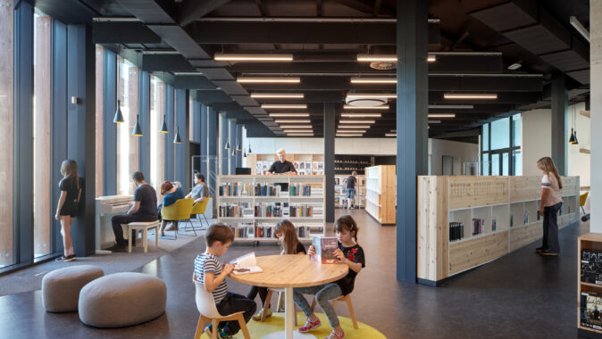 Přístavba a stará vila mají proto výrazně odlišný charakter interiéru. Nová budova je moderní a vzdušná, otevřená do zahrady svou skleněnou fasádou. Je věnovaná novinkám, dětským knihám, kavárně, přednáškám a workshopům. Vysoké dřevěné regály jsou zakomponované do stěn, police v prostoru jsou nízké a pojízdné, aby byl interiér přehledný a uměl se přizpůsobovat aktuálním potřebám. Podél prosklené fasády jsou čtecí místa s křesly pro dospělé, děti se schovávají s knihami do zákoutí v policích a batolata lezou v ohrazeném „pískovišti“. Díky různým výškám polic, stolů i sedacích prvků si každá věková skupina najde svoje místo.