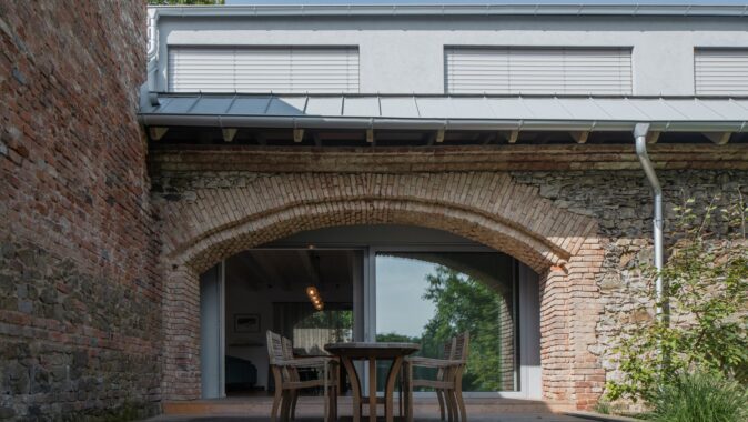 Nová prefabrikovaná dřevostavba se dispozičně podřídila původnímu zdivu a klenutým otvorům, zároveň však zůstala konstrukčně zcela oddělena. Hranice mezi interiérem a exteriérem se rozplynuly. Nové prorostlo historií skrz naskrz, a dnes je těžké určit, kde začíná vnitřek a končí vnějšek. Cesta ven vede jen skrze atmosféru minulosti a stopy, které zde zanechaly předchozí generace.