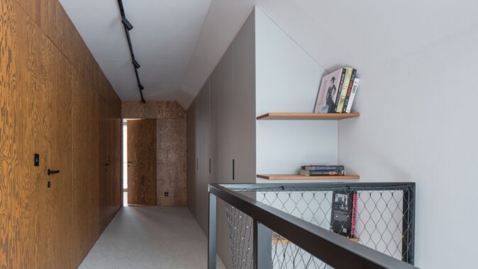 Vzhledem k výšce původní zdi navrhli dodavatelé šikmé podepření krokví přesahu, což se ukázalo jako velmi elegantní řešení i v místě přesahů pod vikýři. Obvodové konstrukce navrhli velmi subtilní, čímž jsme získali několik desítek centimetrů ve vnitřním prostoru. Skladba stěny je tlustá jen 333 mm, je difuzně otevřená, což bylo zásadní pro přirozené větrání. Navíc má instalační předstěnu, kterou jsme nejednou využili při dodatečné úpravě pozic koncových prvků světel, vypínačů a zásuvek.
