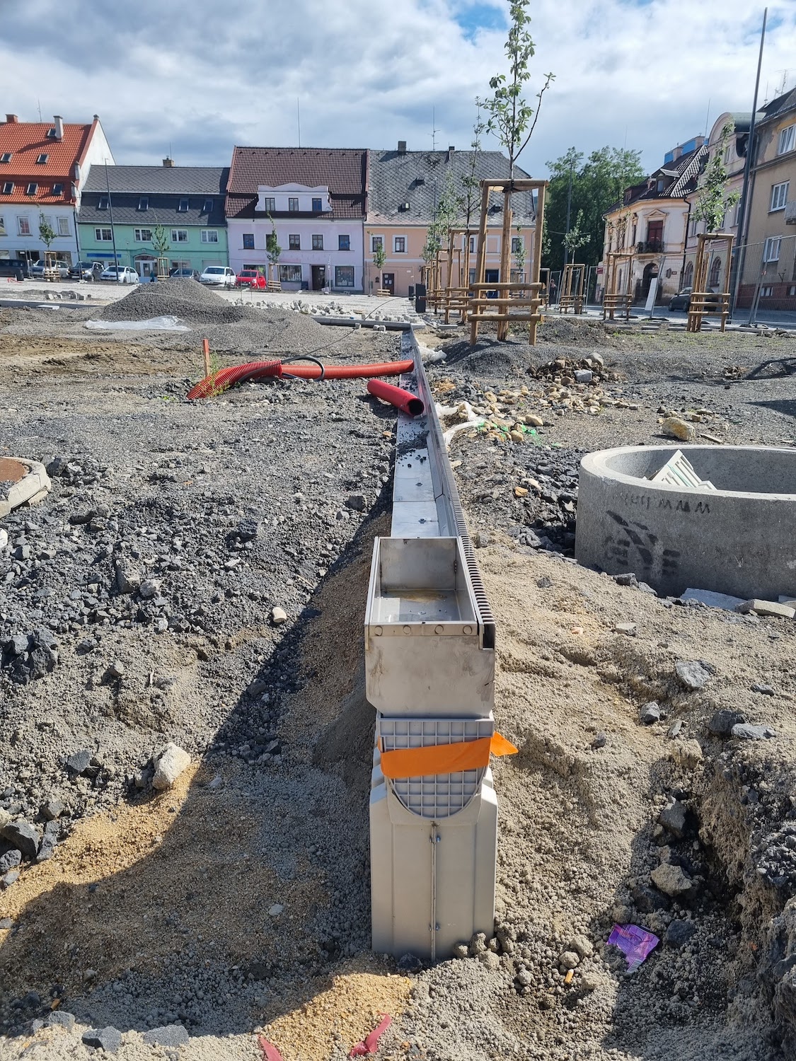 Pod povrchem jsou velké žlaby z polymerického betonu, které dokážou pojmout i přívalové deště. Kontrolní a čistící box je osazen také dlažbou, takže požadovaný vizuální dojem zůstal neporušený.