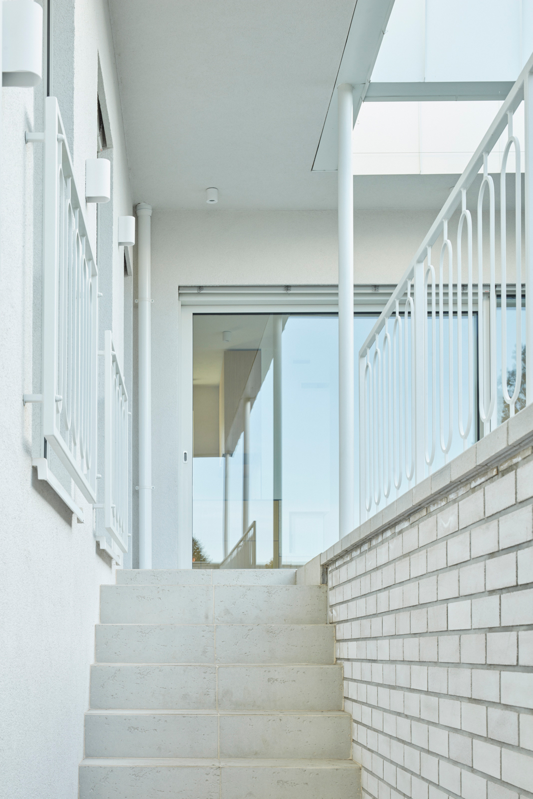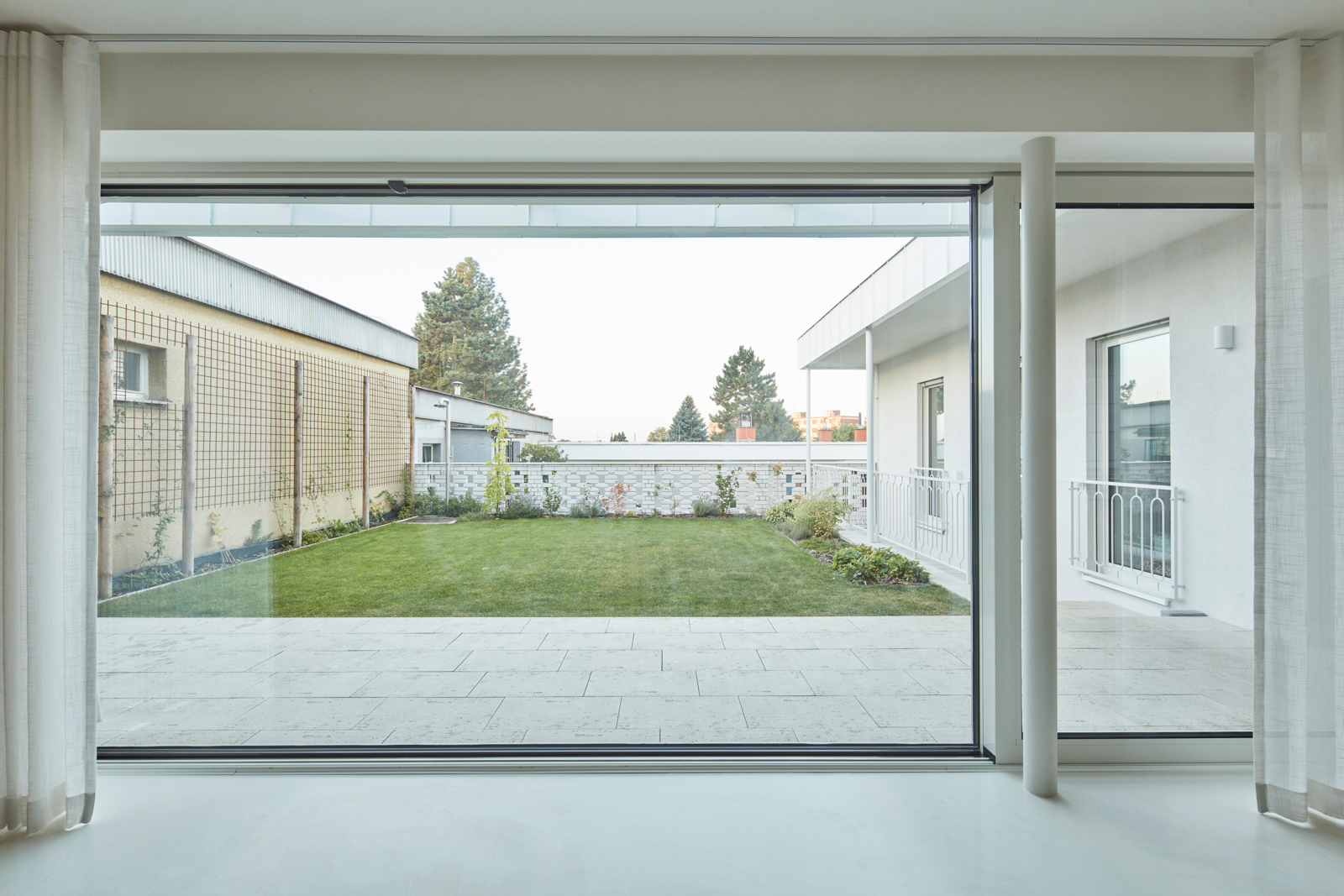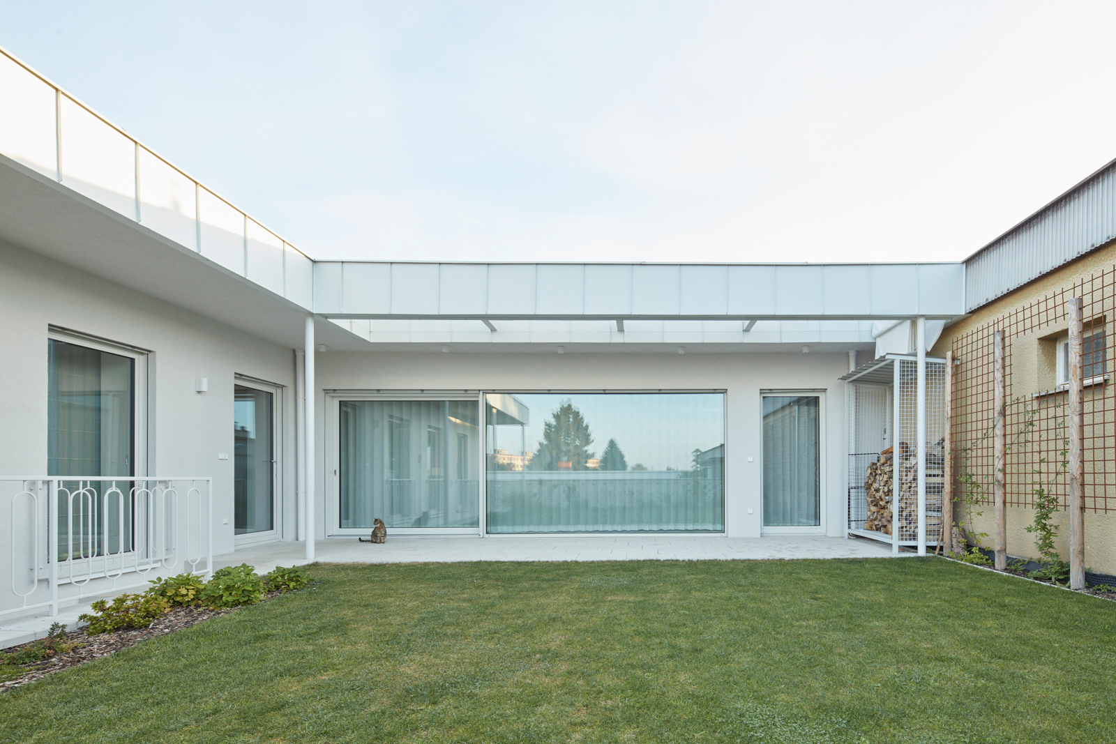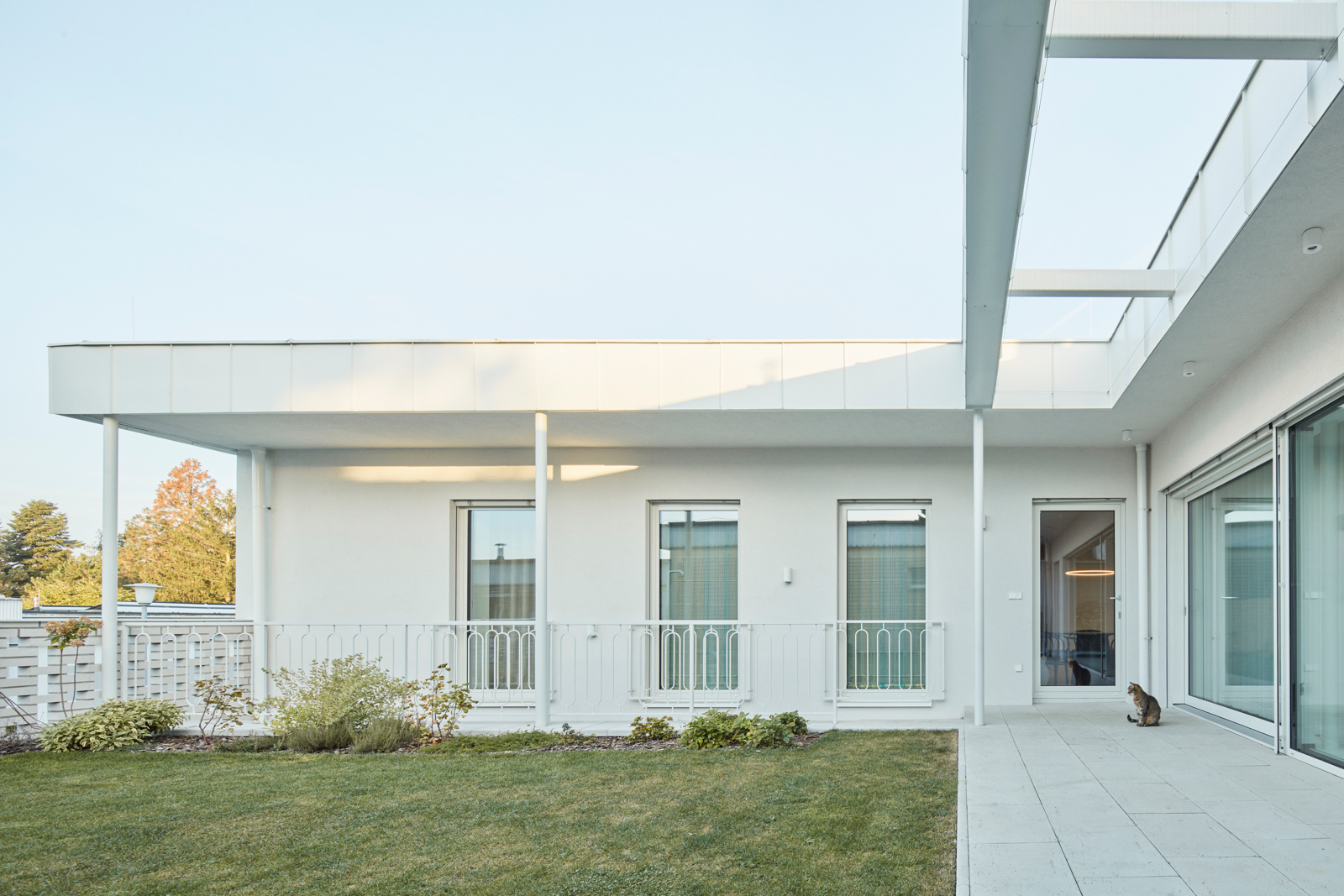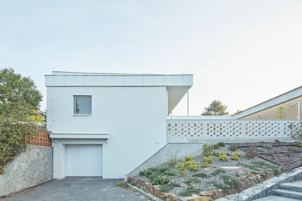Na obytný prostor navazuje venkovní pobytová terasa, nad kterou levituje ocelová pergola s textilním baldachýnem pro zastínění ve slunných letních dnech. Ta je již součástí atria, další „obytné místnosti“ v domě. Exteriér i interiér sjednocuje neutrální bílá barva. Doplňuje ji bezespárá polyuretanová stěrka ve světle béžovém odstínu propojující všechny obytné místnosti v domě, přírodní kámen travertin použitý jako obklad u krbu, v koupelně, na WC a dubová dýha na nábytku vyrobeném na míru. Interiér doplňují křesla od Halabaly a židle Thonet z ohýbaného dřeva v černém provedení.