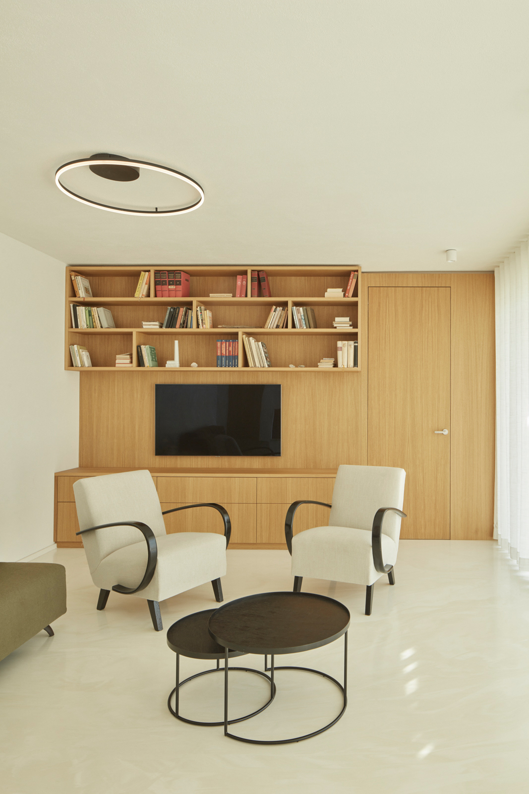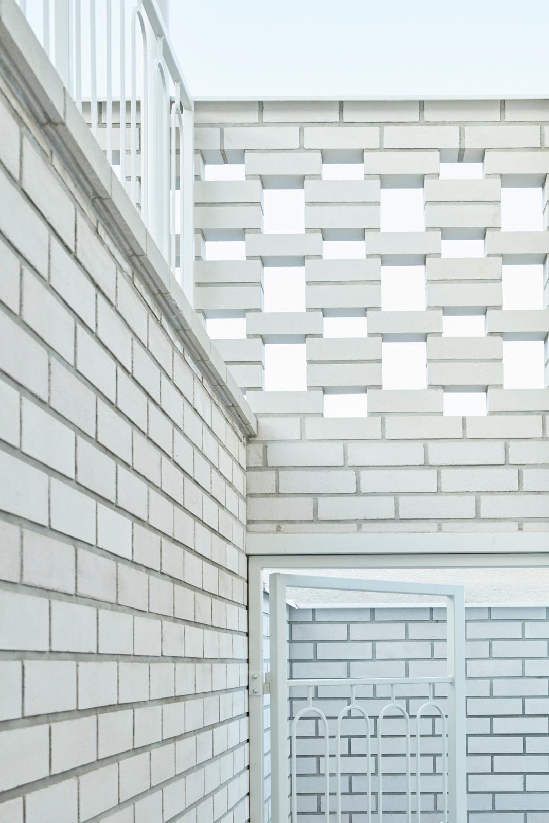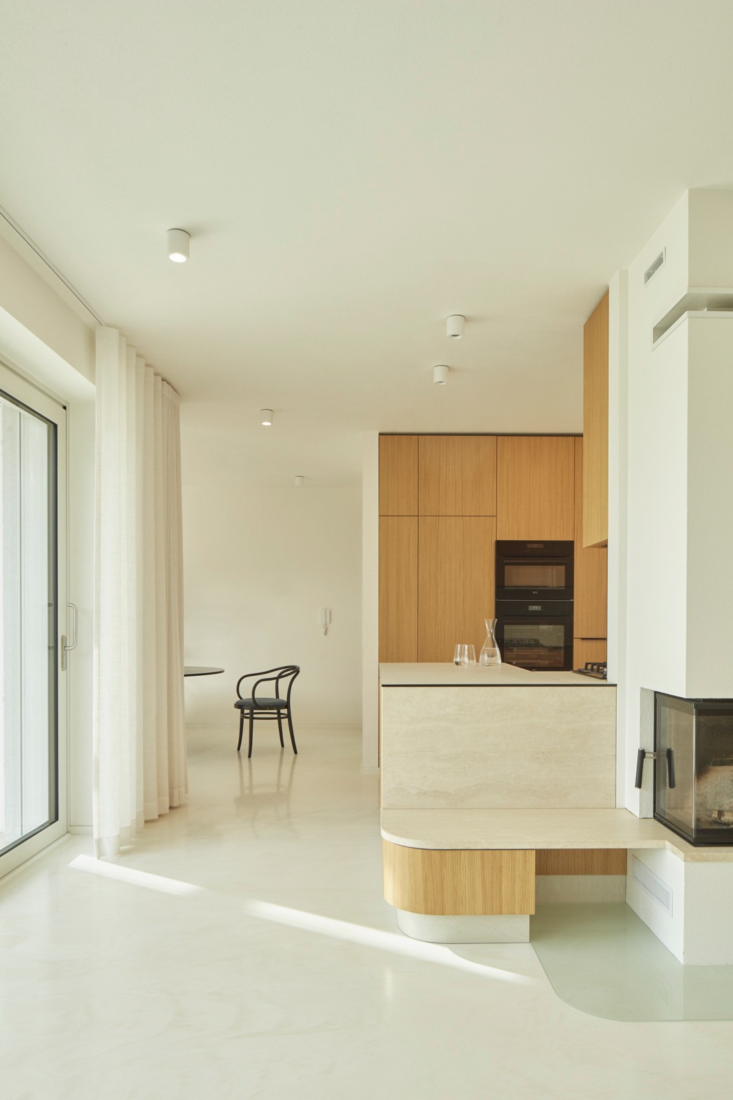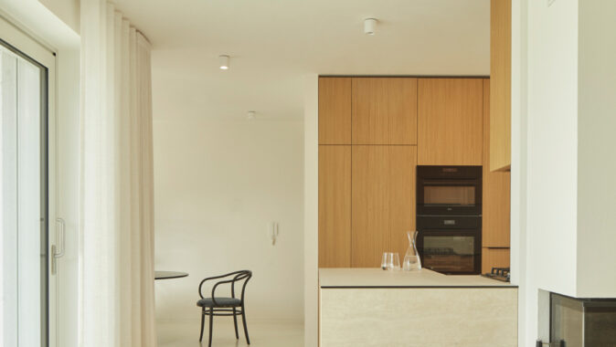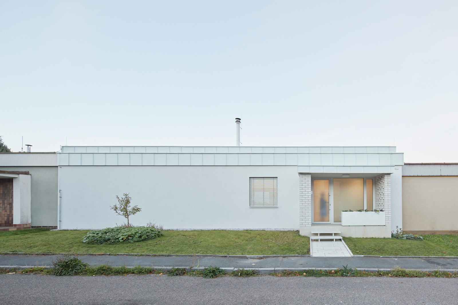 Na obytný prostor navazuje venkovní pobytová terasa, nad kterou levituje ocelová pergola s textilním baldachýnem pro zastínění ve slunných letních dnech. Ta je již součástí atria, další „obytné místnosti“ v domě. Exteriér i interiér sjednocuje neutrální bílá barva. Doplňuje ji bezespárá polyuretanová stěrka ve světle béžovém odstínu propojující všechny obytné místnosti v domě, přírodní kámen travertin použitý jako obklad u krbu, v koupelně, na WC a dubová dýha na nábytku vyrobeném na míru. Interiér doplňují křesla od Halabaly a židle Thonet z ohýbaného dřeva v černém provedení.