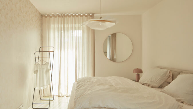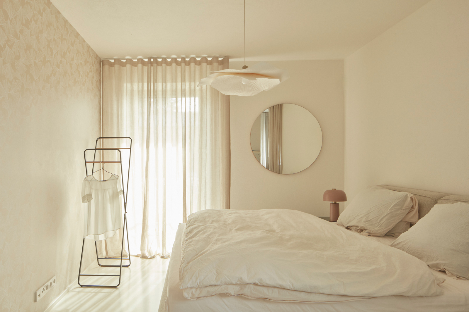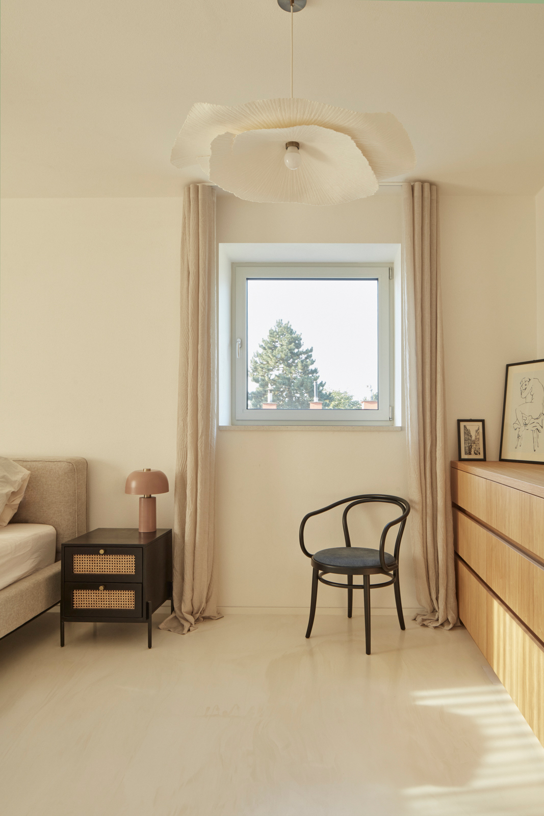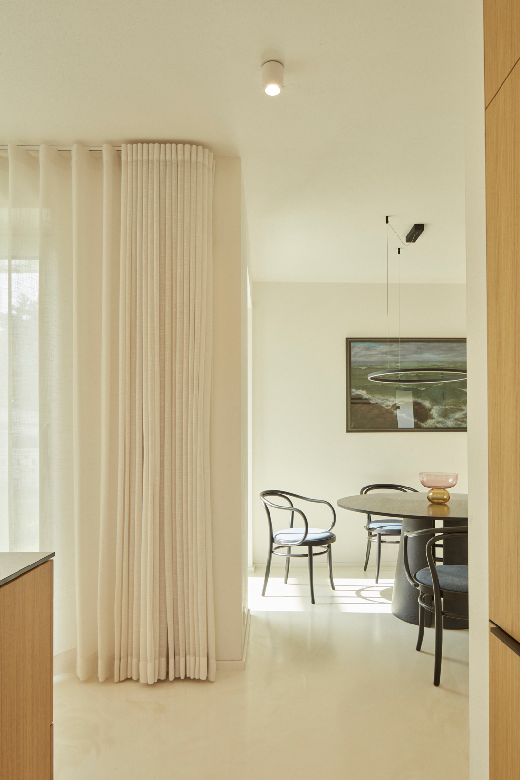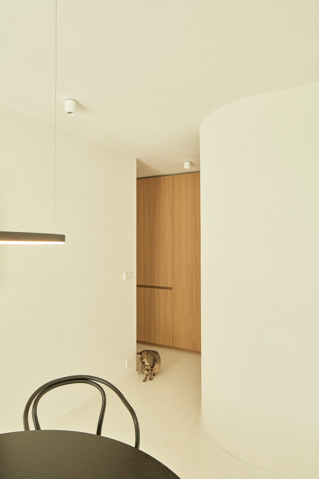 Na obytný prostor navazuje venkovní pobytová terasa, nad kterou levituje ocelová pergola s textilním baldachýnem pro zastínění ve slunných letních dnech. Ta je již součástí atria, další „obytné místnosti“ v domě. Exteriér i interiér sjednocuje neutrální bílá barva. Doplňuje ji bezespárá polyuretanová stěrka ve světle béžovém odstínu propojující všechny obytné místnosti v domě, přírodní kámen travertin použitý jako obklad u krbu, v koupelně, na WC a dubová dýha na nábytku vyrobeném na míru. Interiér doplňují křesla od Halabaly a židle Thonet z ohýbaného dřeva v černém provedení.