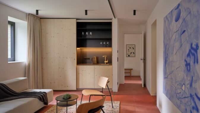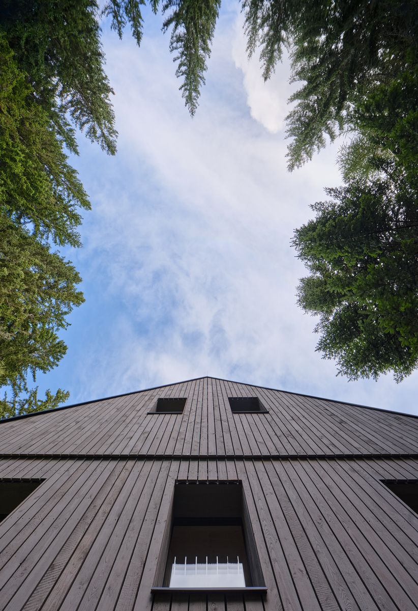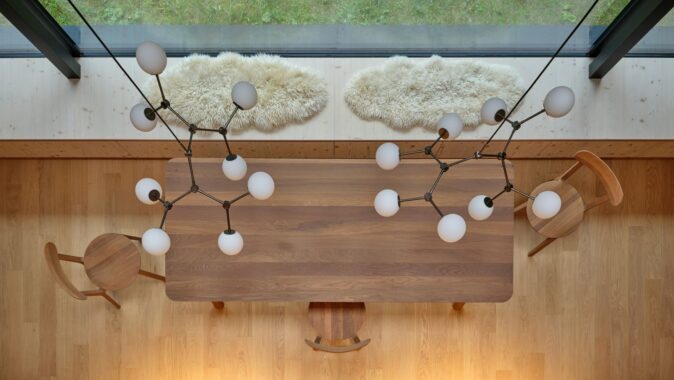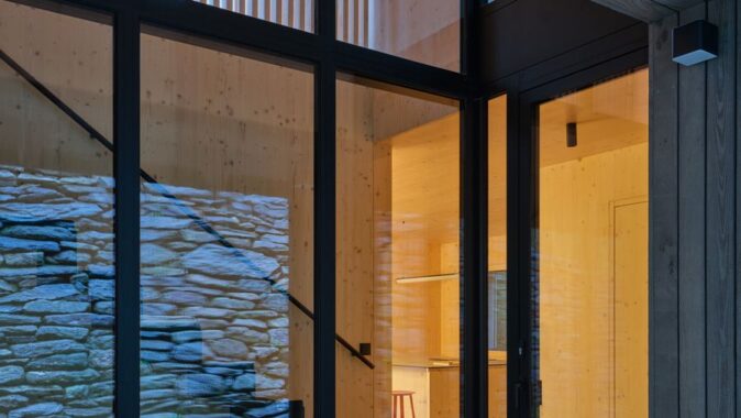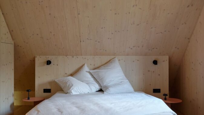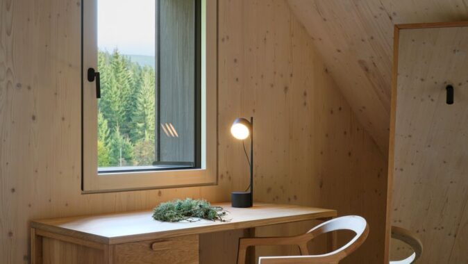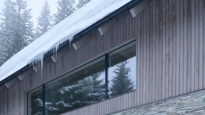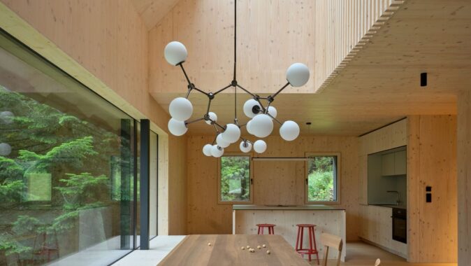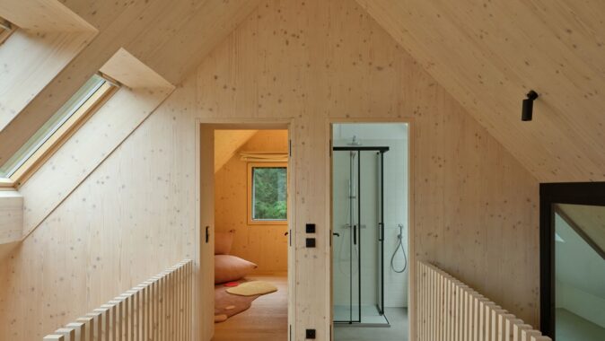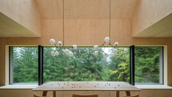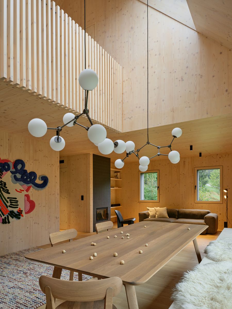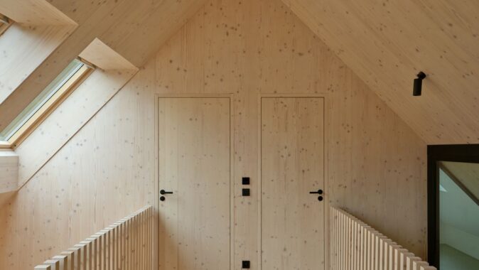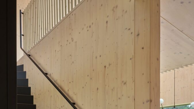 Realizace projektu byla logisticky náročná. Komplikace přineslo umístění ve strmém svahu i zkrácená stavební sezóna, která vyžaduje rychlý postup výstavby. I proto se prefabrikované CLT panely, které je možné smontovat na železobetonový sokl během několika týdnů, ukázaly jako ideální řešení. Tyto dřevěné panely nabízejí statickou tuhost srovnatelnou s betonem, což umožňuje vytvoření rozsáhlých průhledů a otevřených zón – řešení, které konvenční konstrukce standardně neposkytují. Panely jsou společností 3AE dodávány v pohledové kvalitě, díky čemuž dřevěný povrch stěn a stropů tvoří finální interiér, který nevyžaduje další obklady.