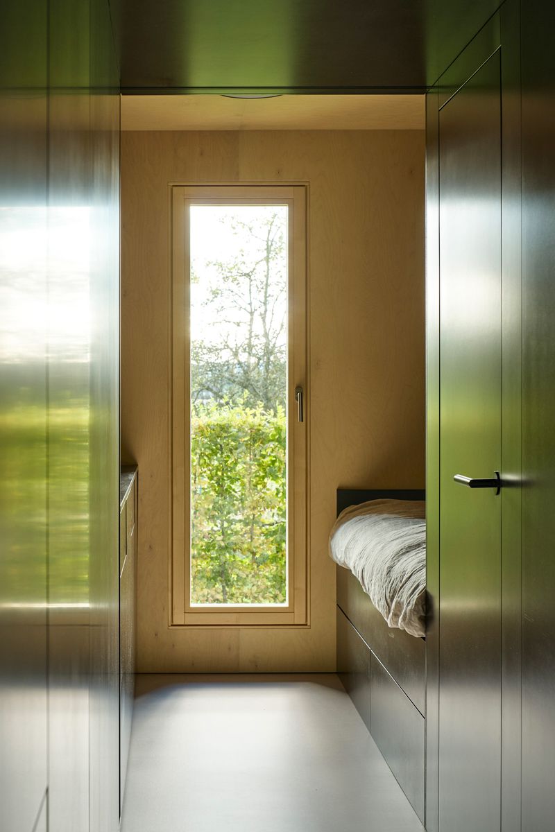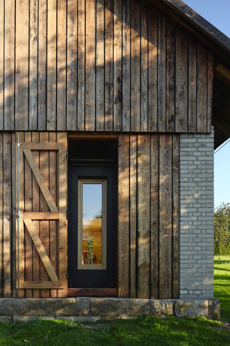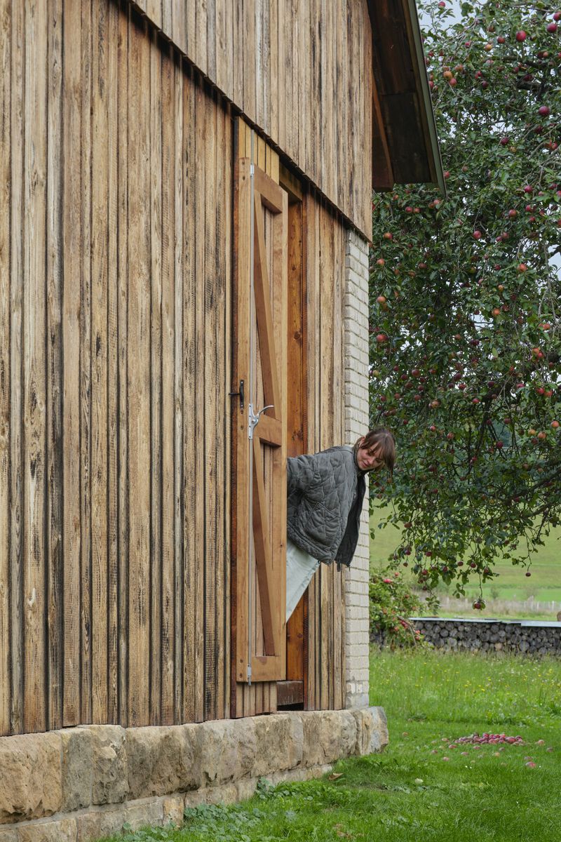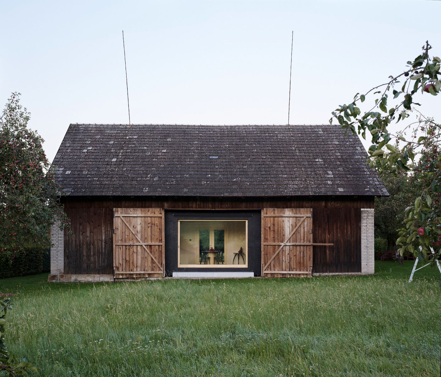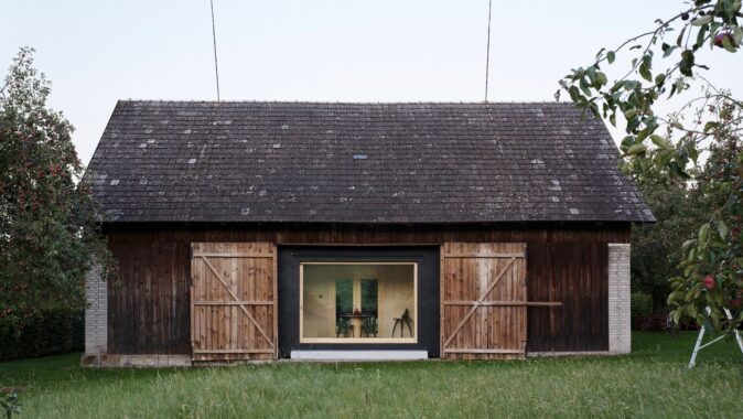 Do lapidárního interiéru vyloženého březovou překližkou je vsazen blok kuchyně s vestavěným nábytkem a koupelnou, který odděluje hlavní prostor od spací kóje. Po otevření vrat se před velkým posuvným oknem rozlévá zahrada se starými jabloněmi a za ní pole s cestou stoupající k lesu.