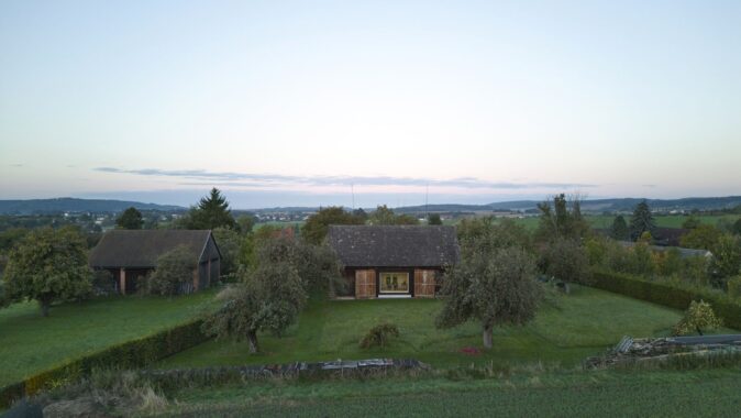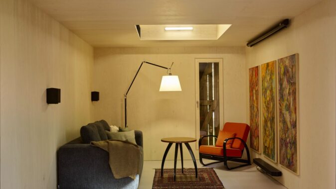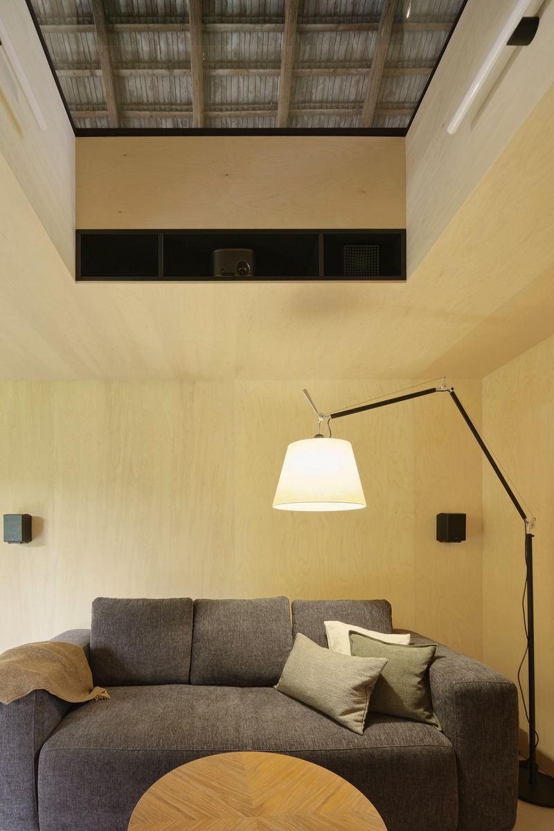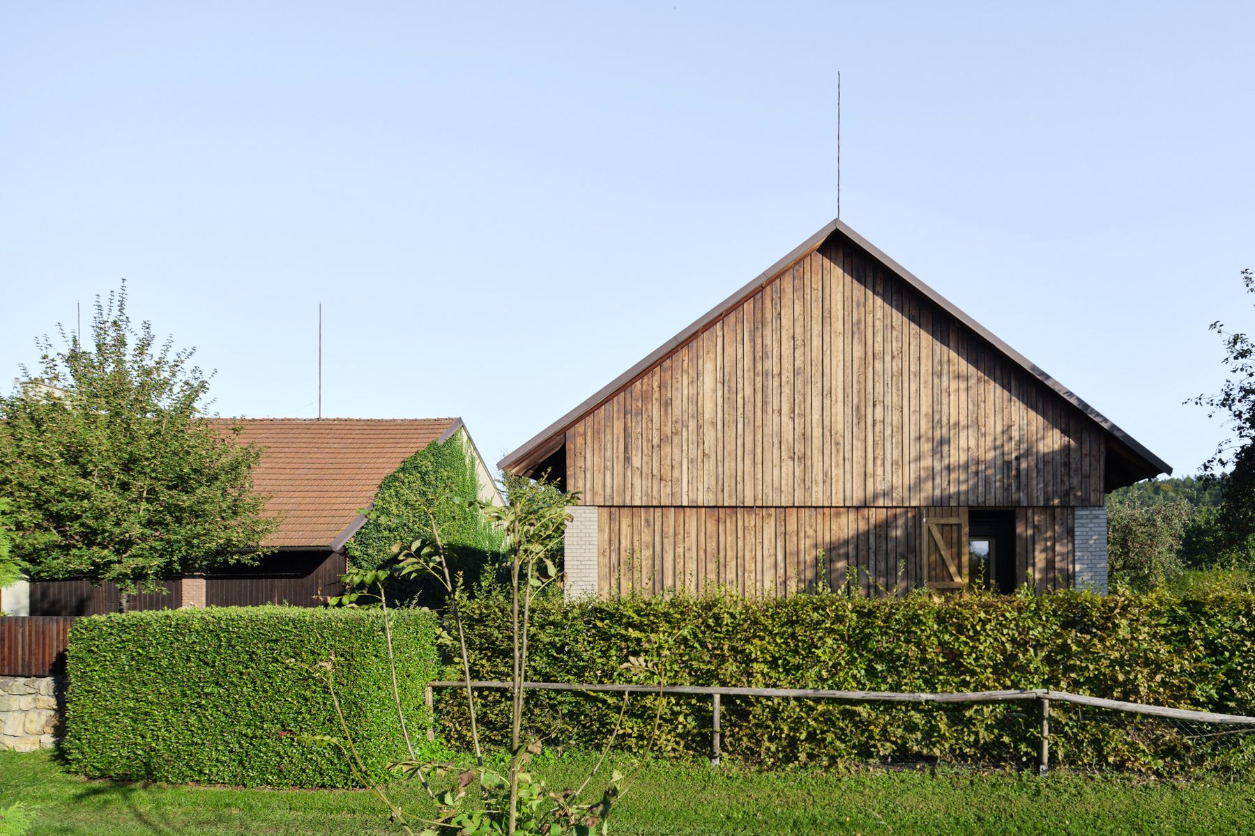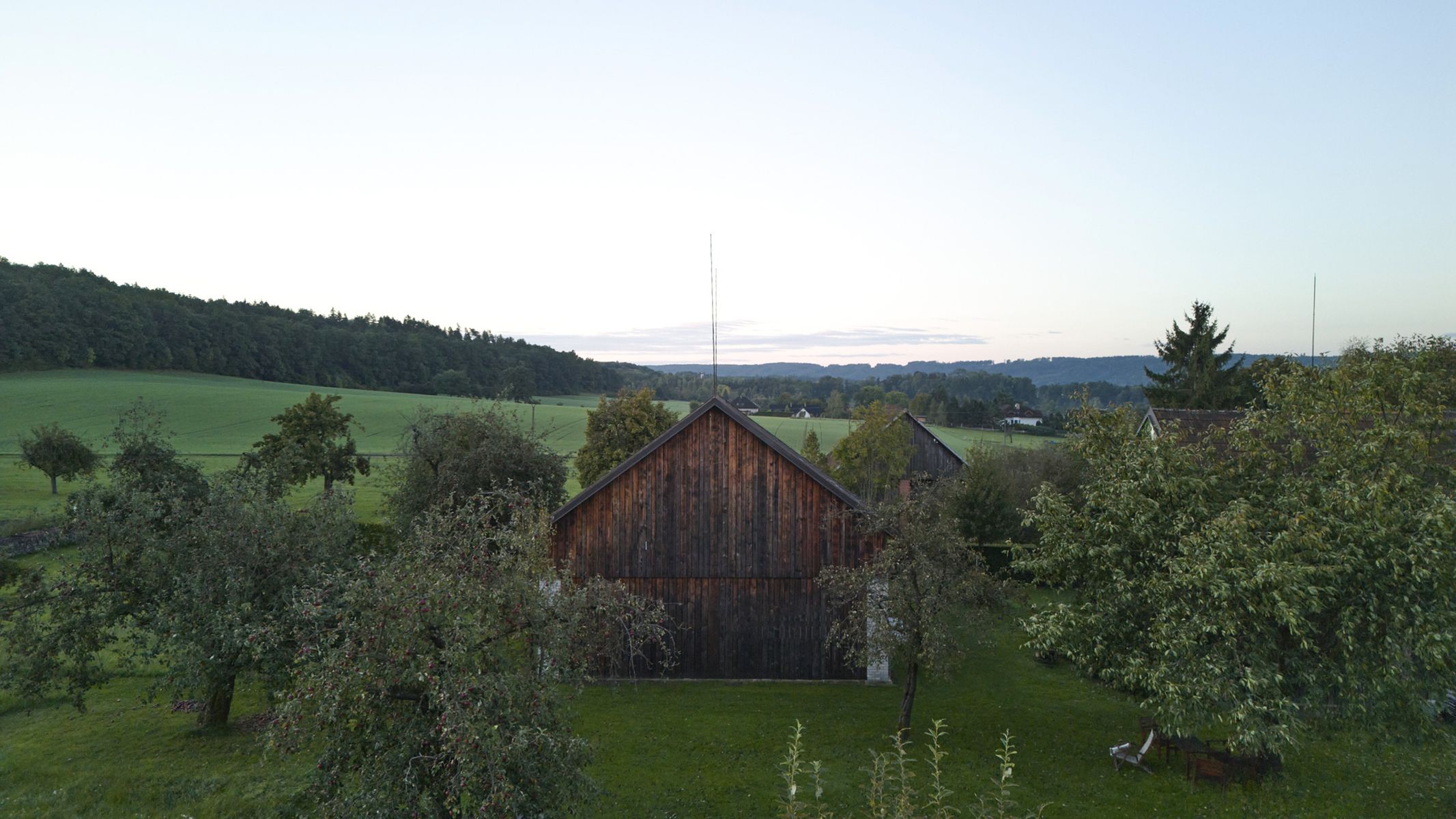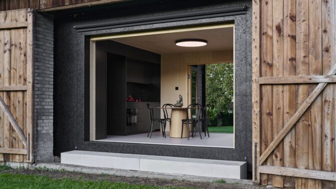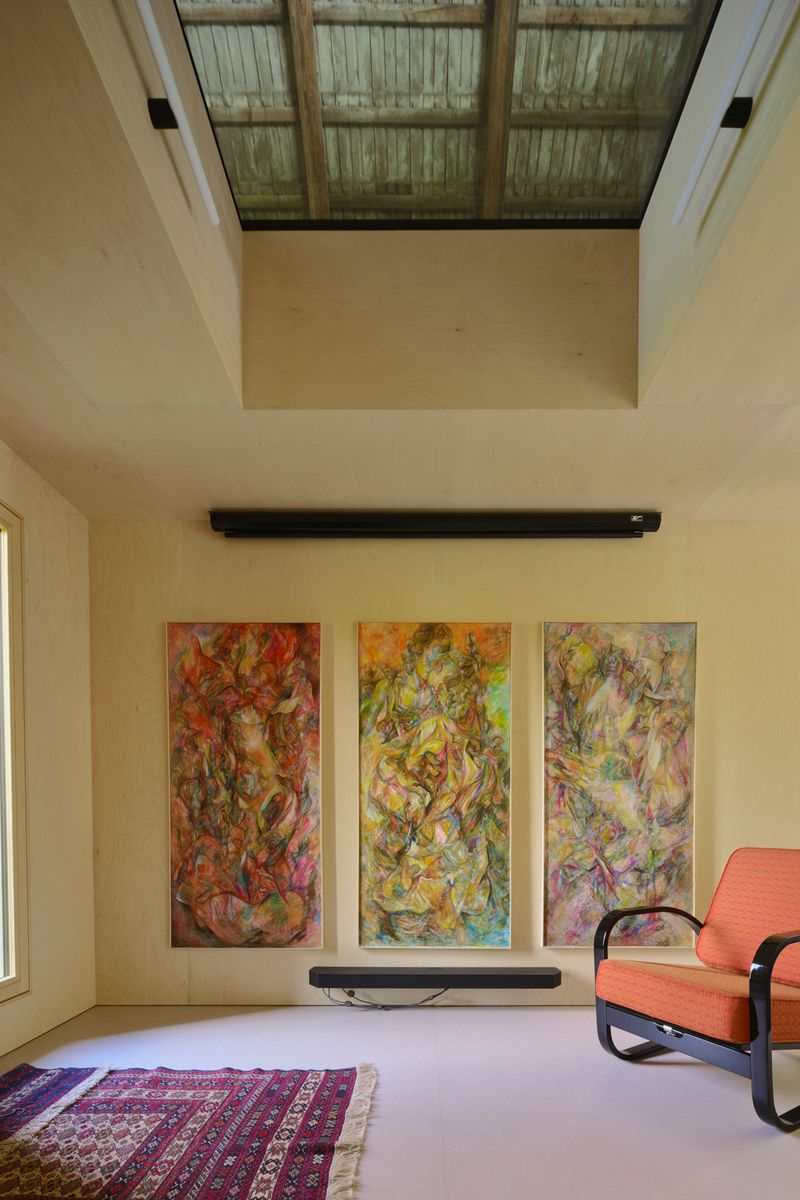 Do lapidárního interiéru vyloženého březovou překližkou je vsazen blok kuchyně s vestavěným nábytkem a koupelnou, který odděluje hlavní prostor od spací kóje. Po otevření vrat se před velkým posuvným oknem rozlévá zahrada se starými jabloněmi a za ní pole s cestou stoupající k lesu.