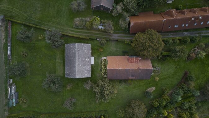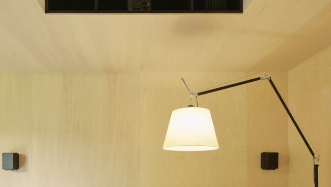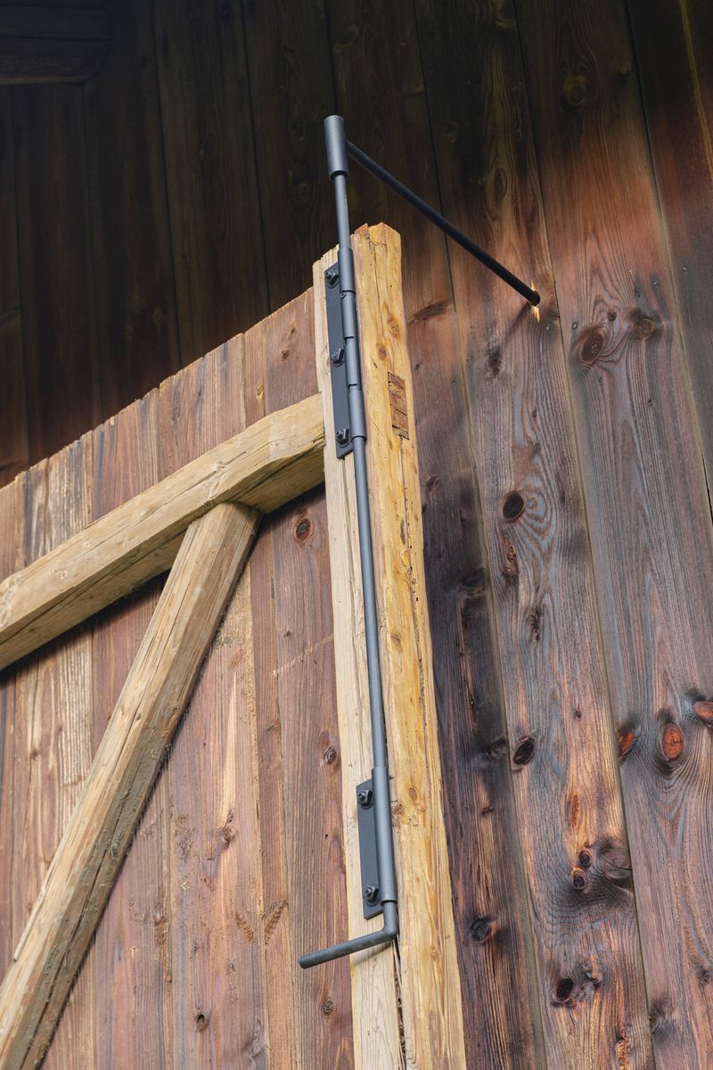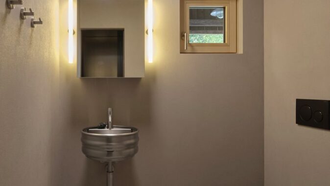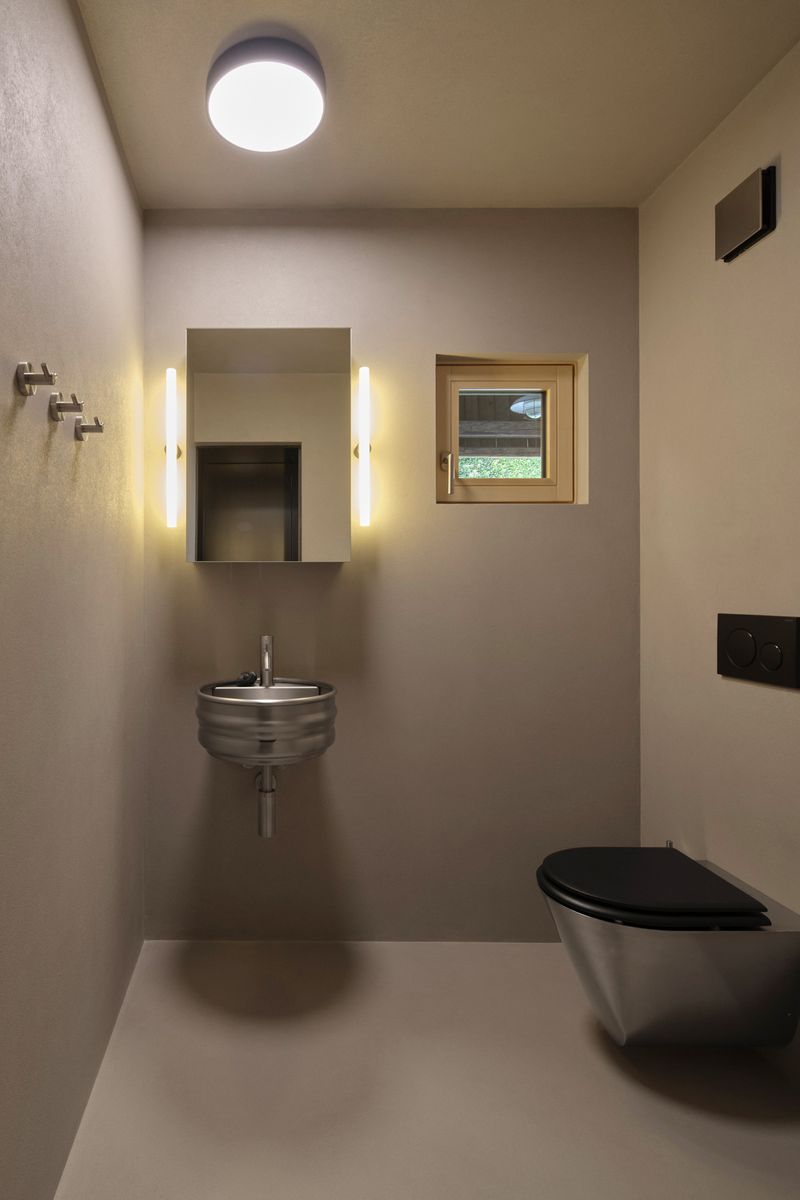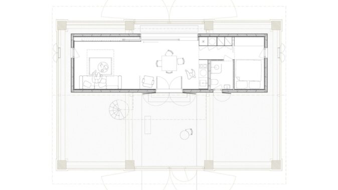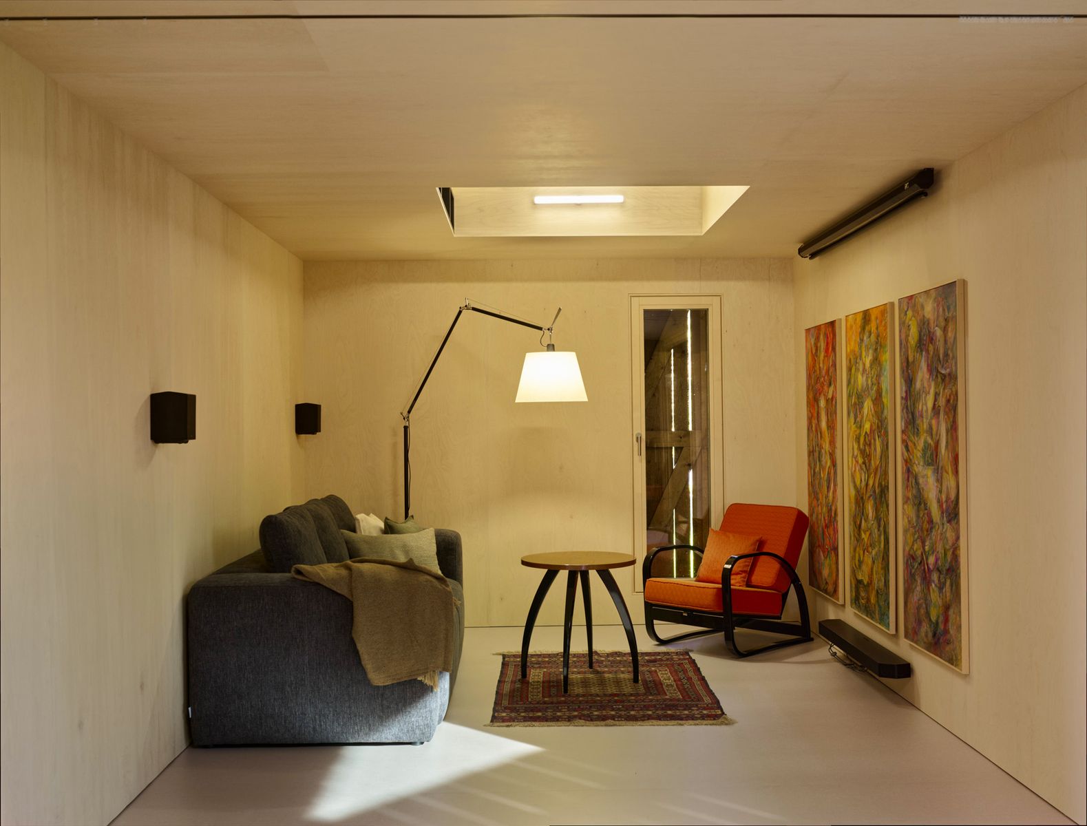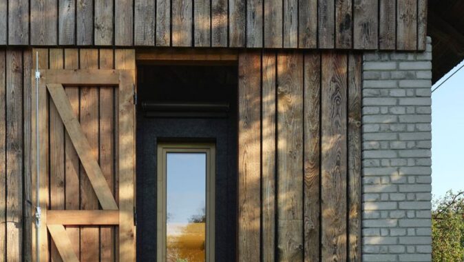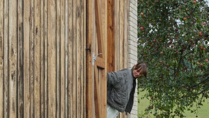 Do lapidárního interiéru vyloženého březovou překližkou je vsazen blok kuchyně s vestavěným nábytkem a koupelnou, který odděluje hlavní prostor od spací kóje. Po otevření vrat se před velkým posuvným oknem rozlévá zahrada se starými jabloněmi a za ní pole s cestou stoupající k lesu.