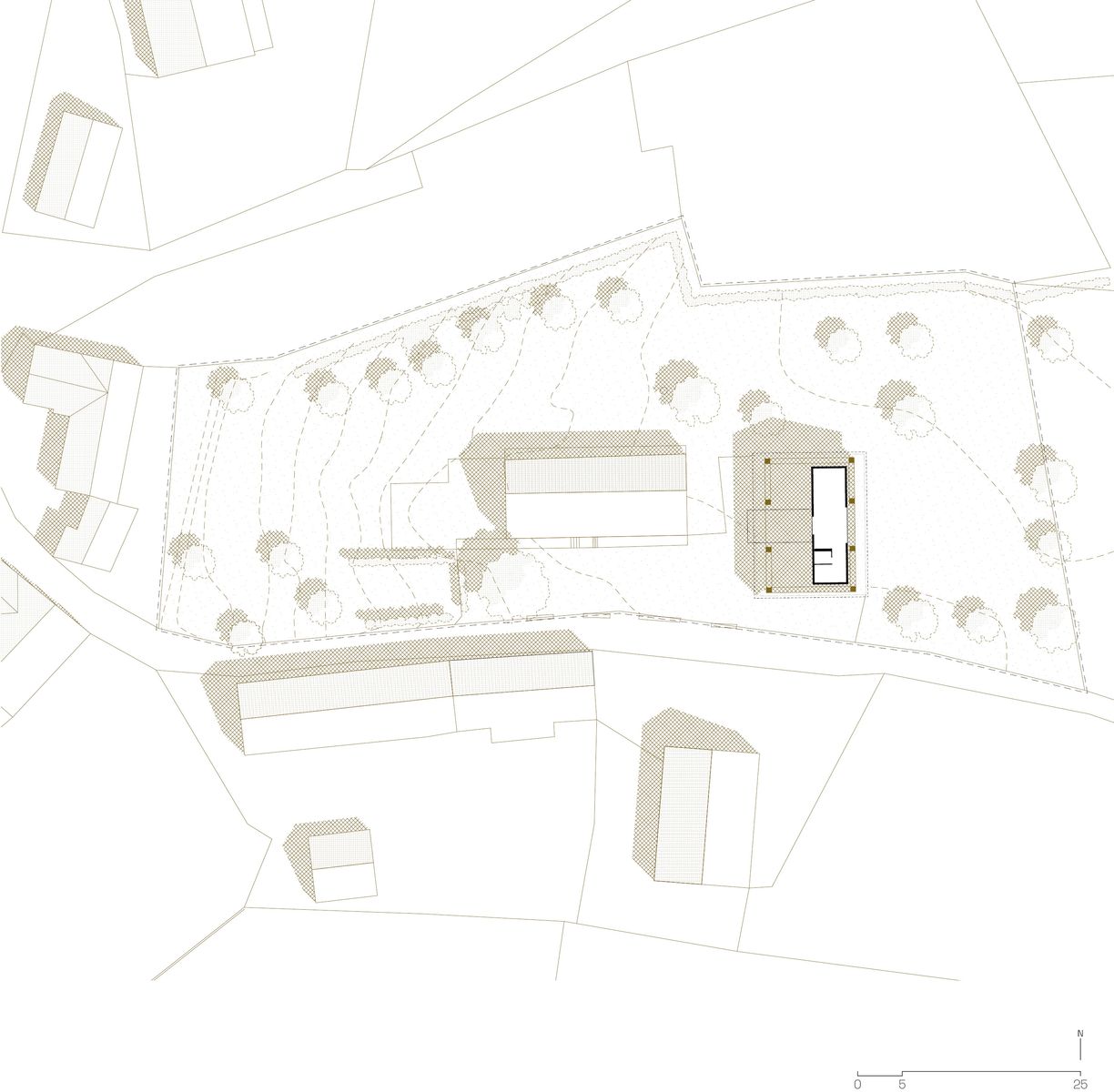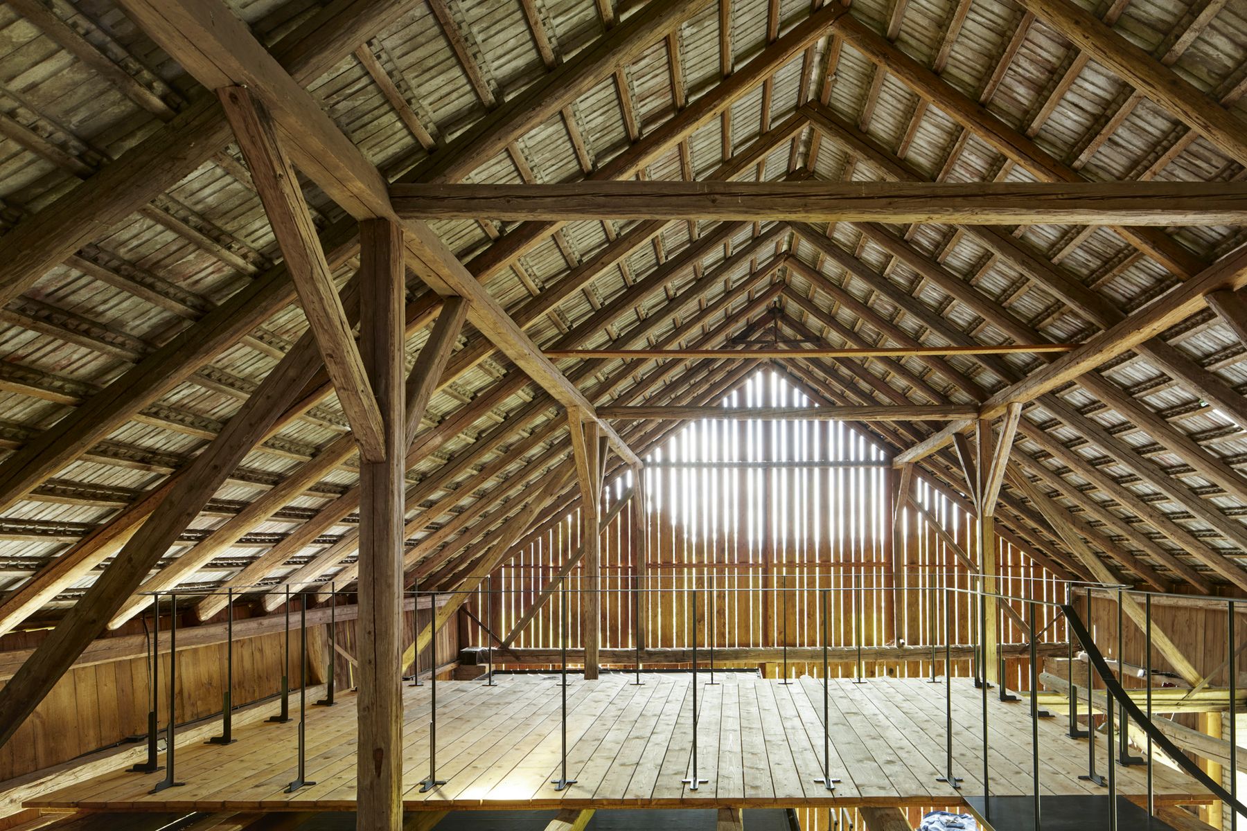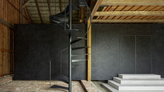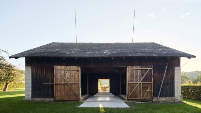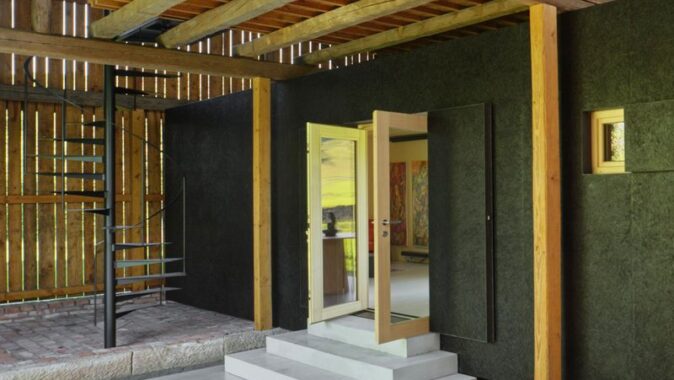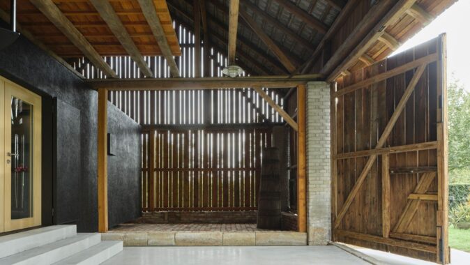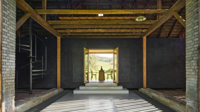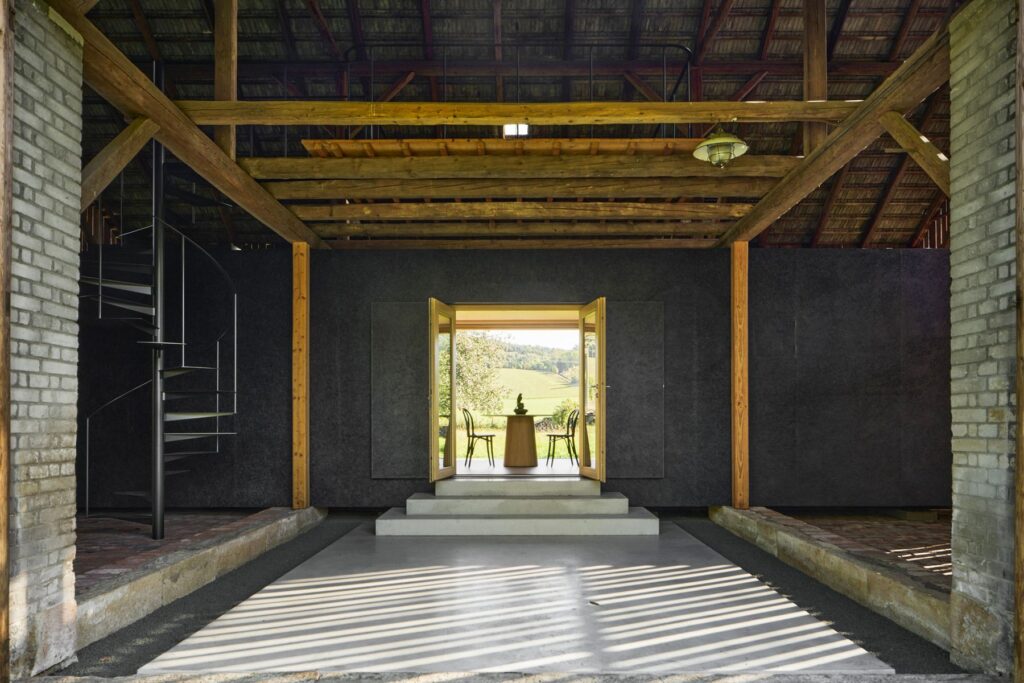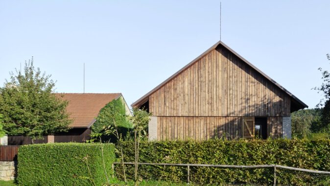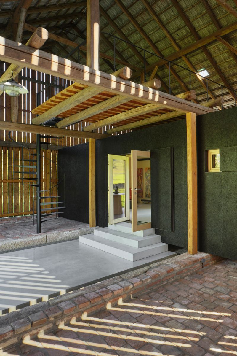 Samotná stodola si zachovává původní podobu a se zavřenými vraty a bočními okenicemi nic nenasvědčuje tomu, že se uvnitř nachází nový objekt. Jen do dvora přesahuje betonový koberec, který se po otevření vrat dál rozprostírá přes prázdnou polovinu stodoly až k monolitickým stupňům před vstupem.